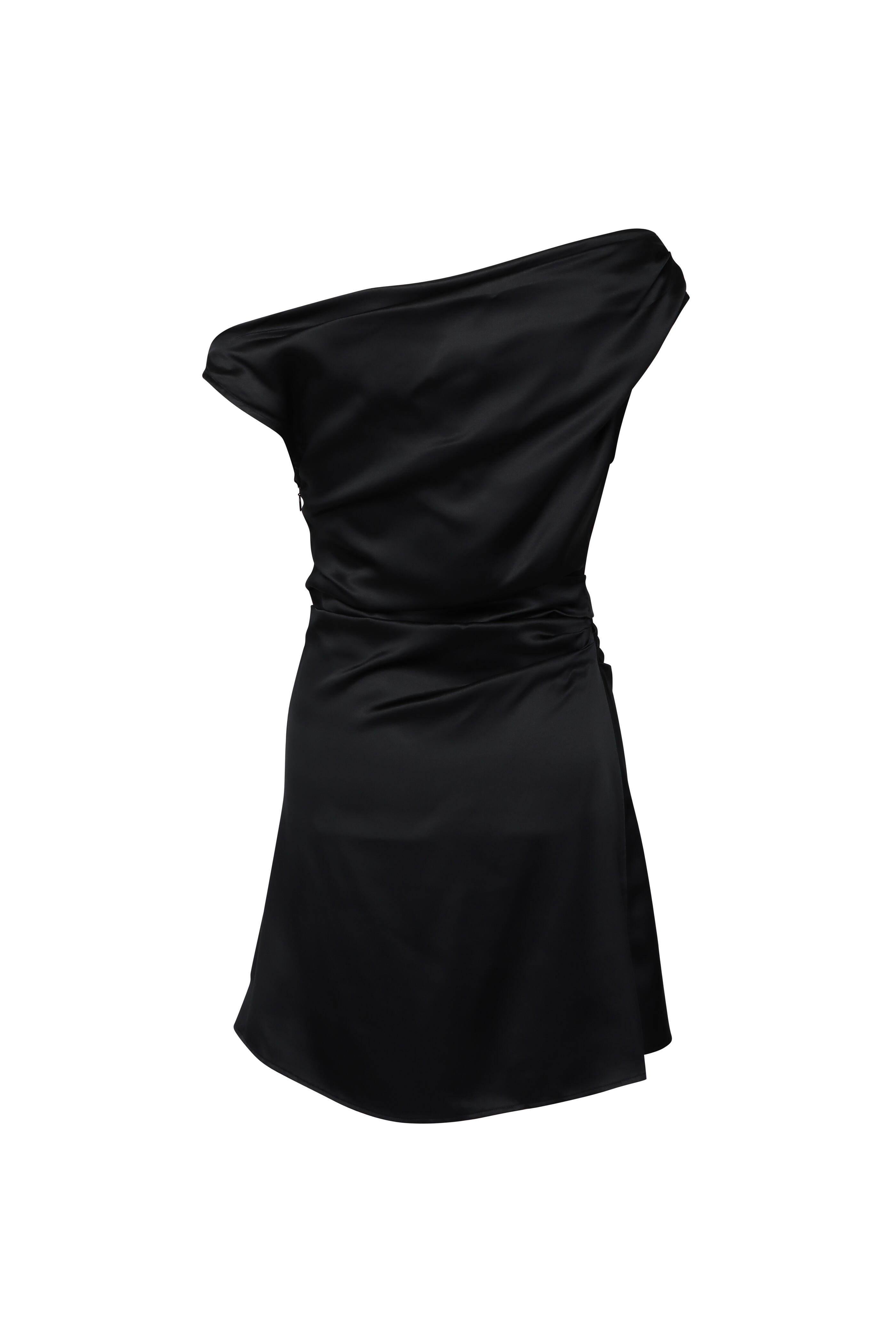 Asymmetrical off the shoulder neckline. Short sleeves. Concealed zip closure. Ruched throughout. Aline skirt. Stretch silk fabrication. Imported. Bust 34.25” (Size S). Waist 26.25” (Size S). Length 30.25” (Size S). Mini length. 93% silk, 7% spandex. Dry clean.