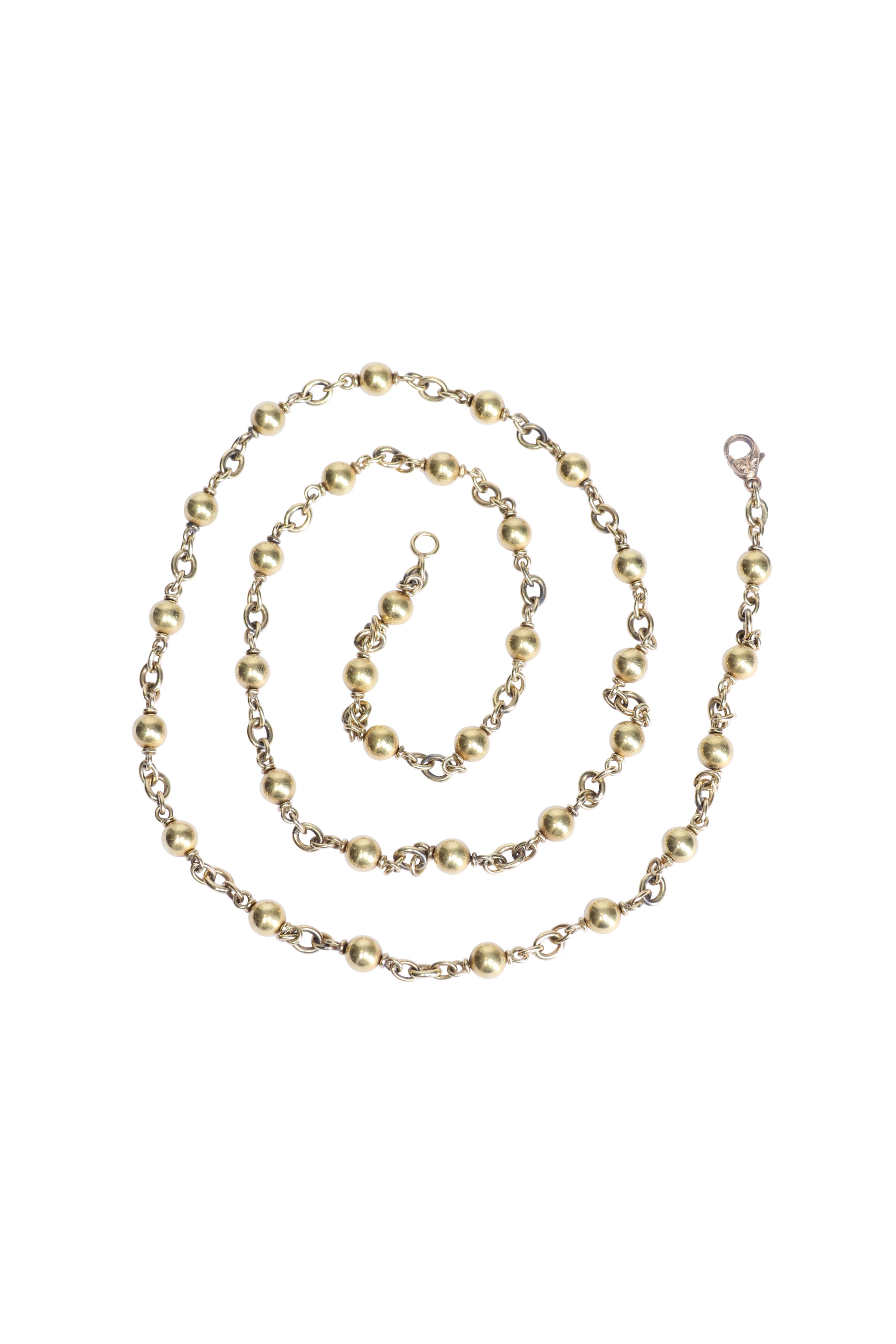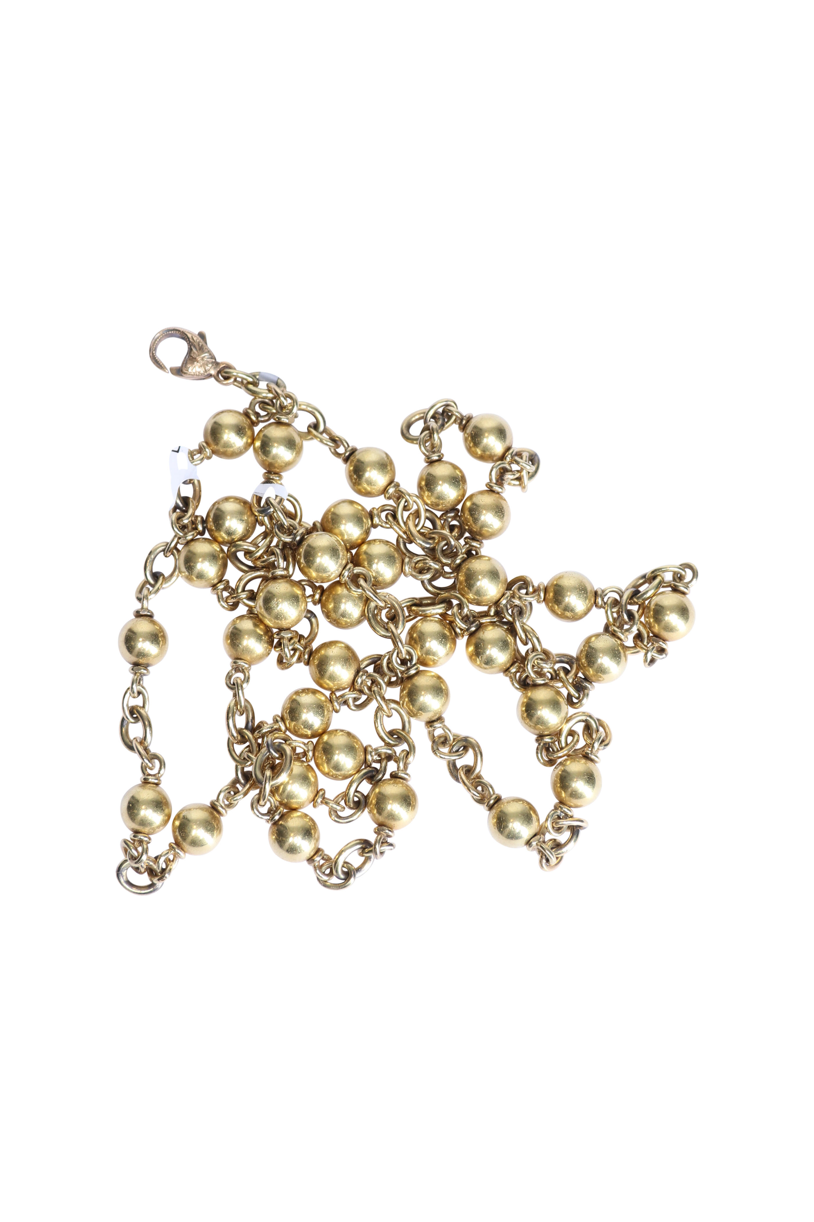 18k gold. Ball beads. Chain links. Lobster claw clasps. Made in the USA. Length: 28”.