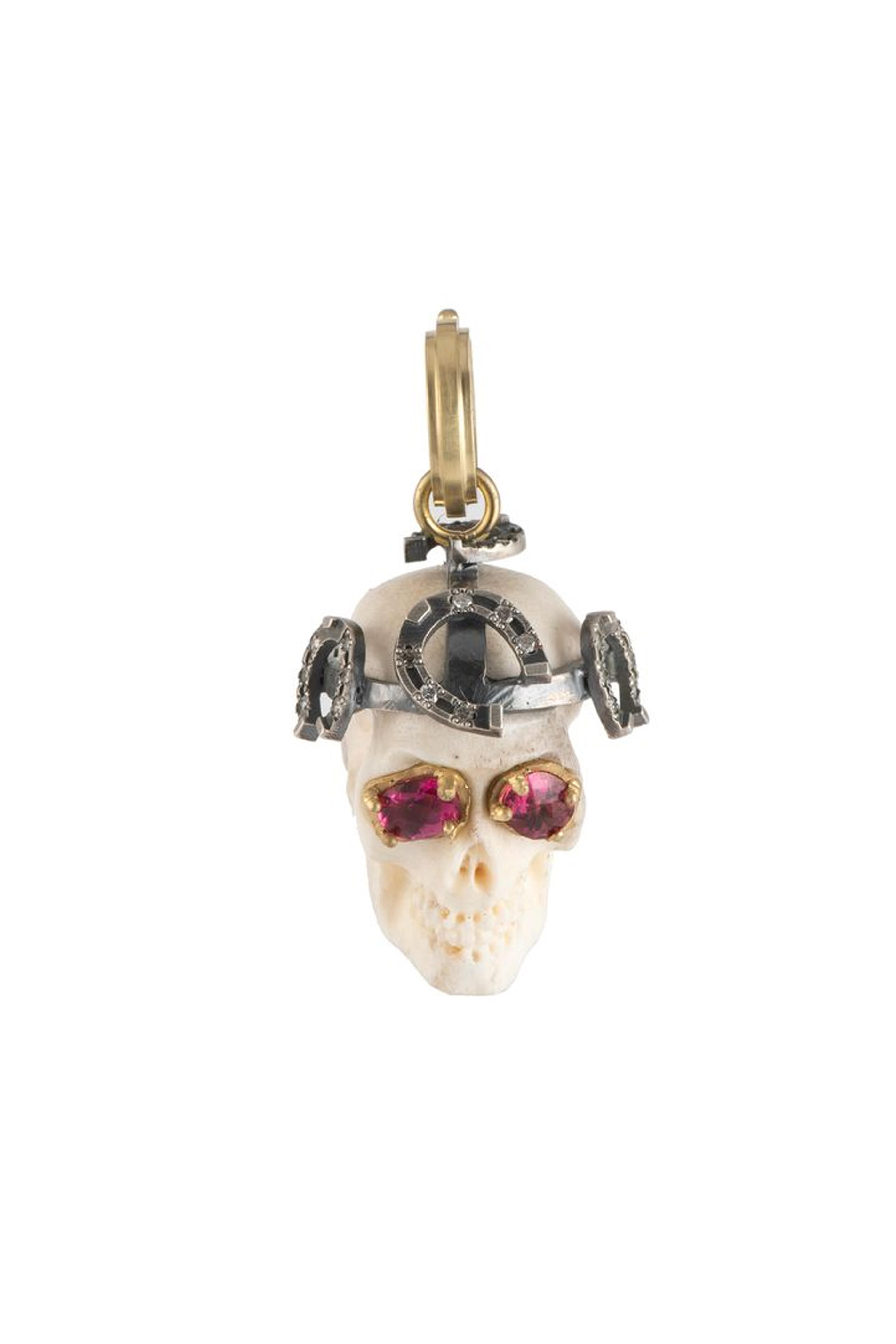 18k gold. Diamond. Rubellite. Horseshoe designed crown. Ruby eyes. Skull design. Hinge bail. Made in the USA.