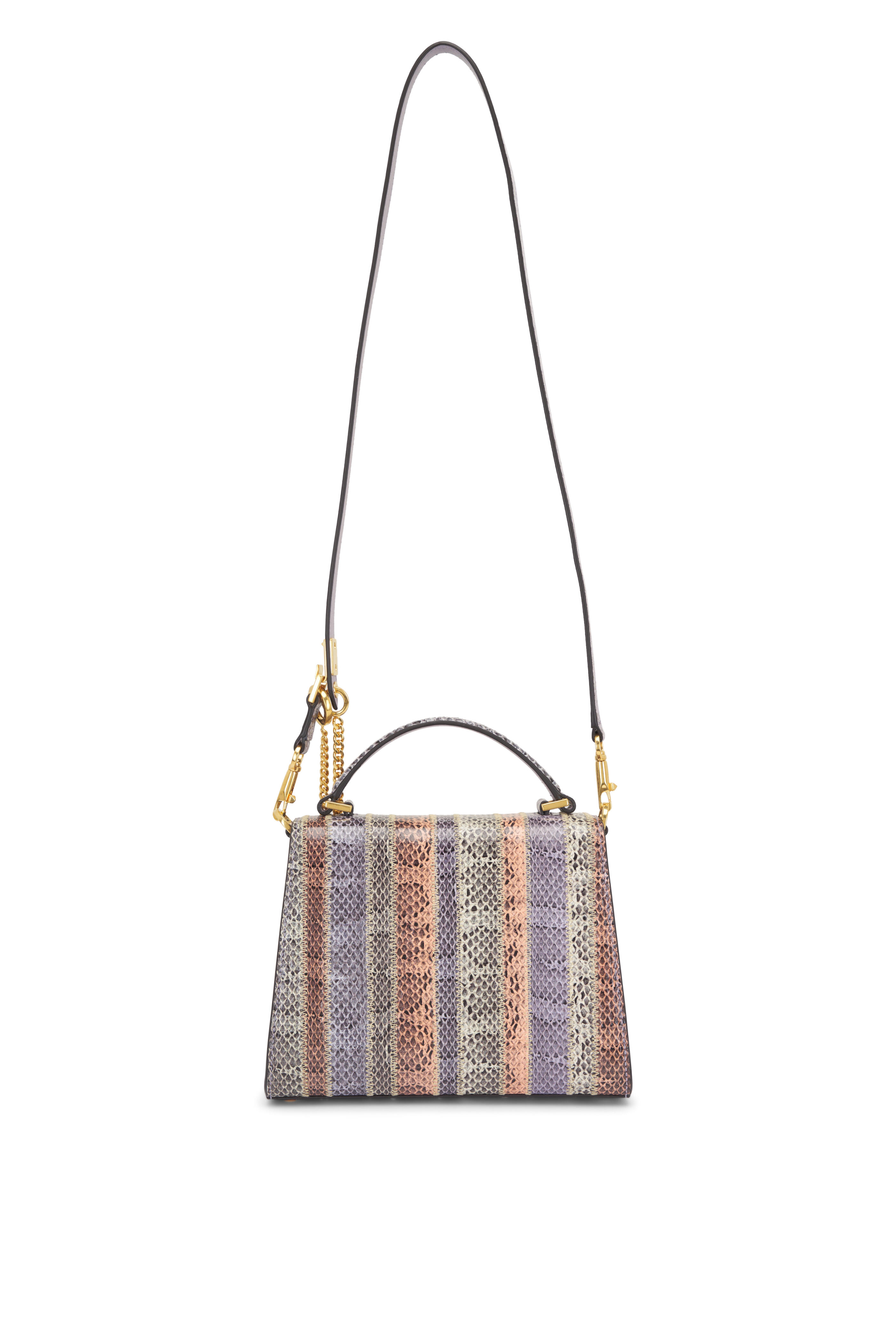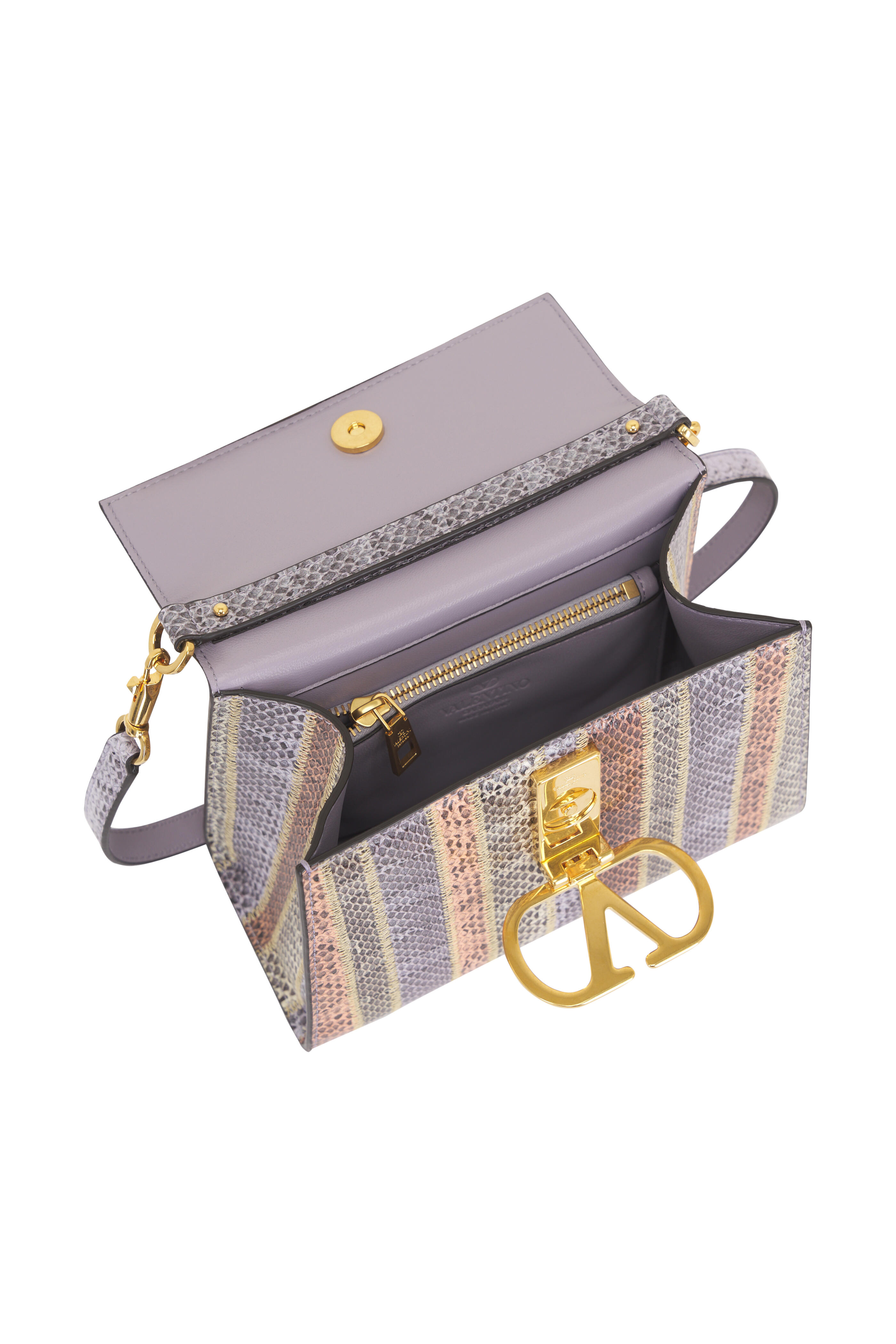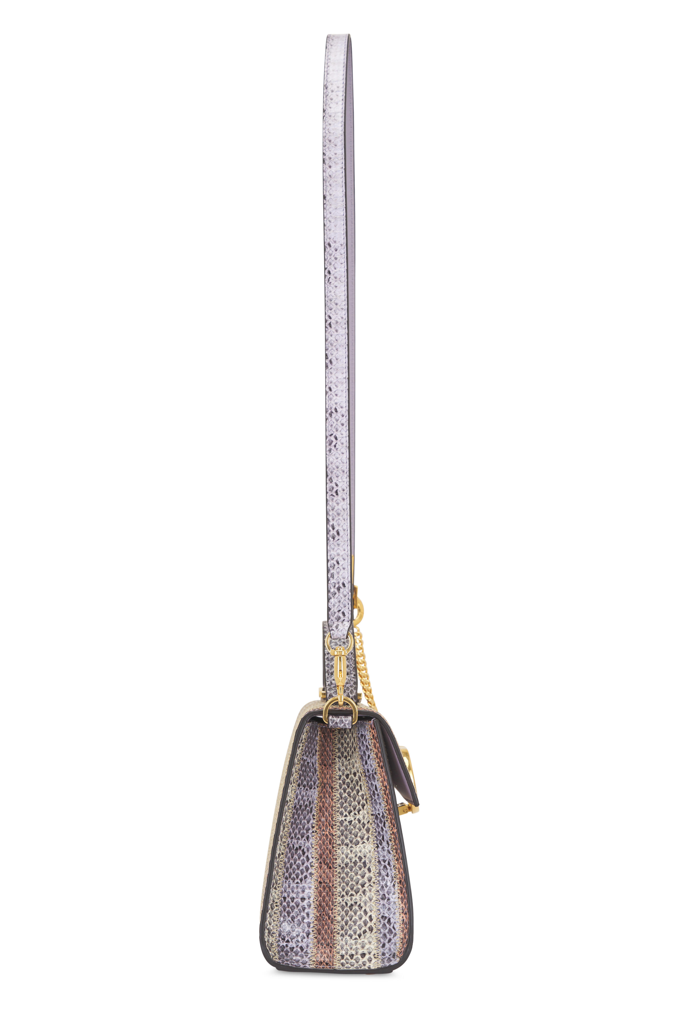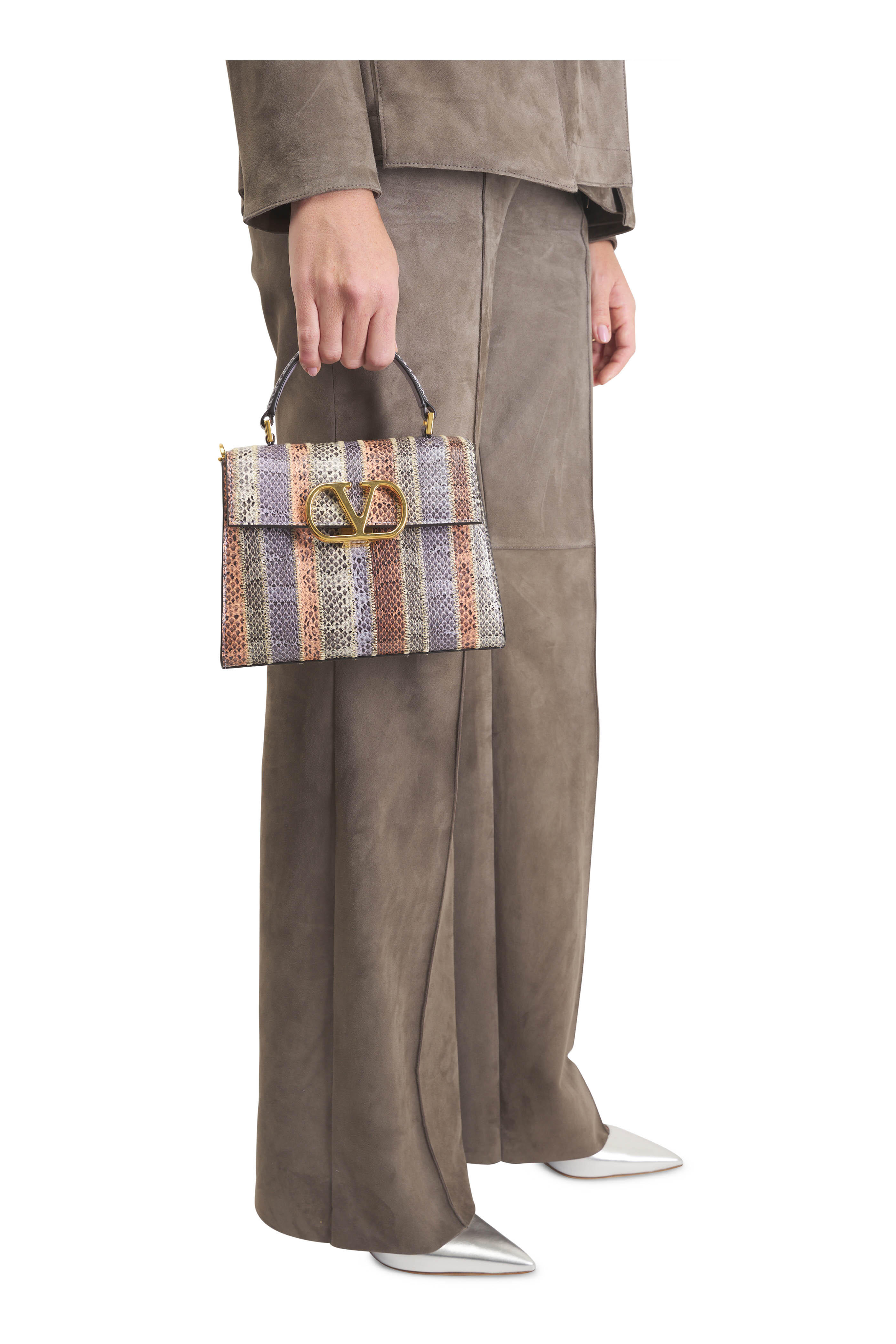 Snake. Single top handles; removable and adjustable shoulder strap. Front flap; magnetic closure; VLogo latch. Interior zip pocket. Smooth leather lining. Protective metal feet. Made in Italy. 8" width. 6" height. 3.5" depth. 2" top handle drop. 23" shoulder strap drop.