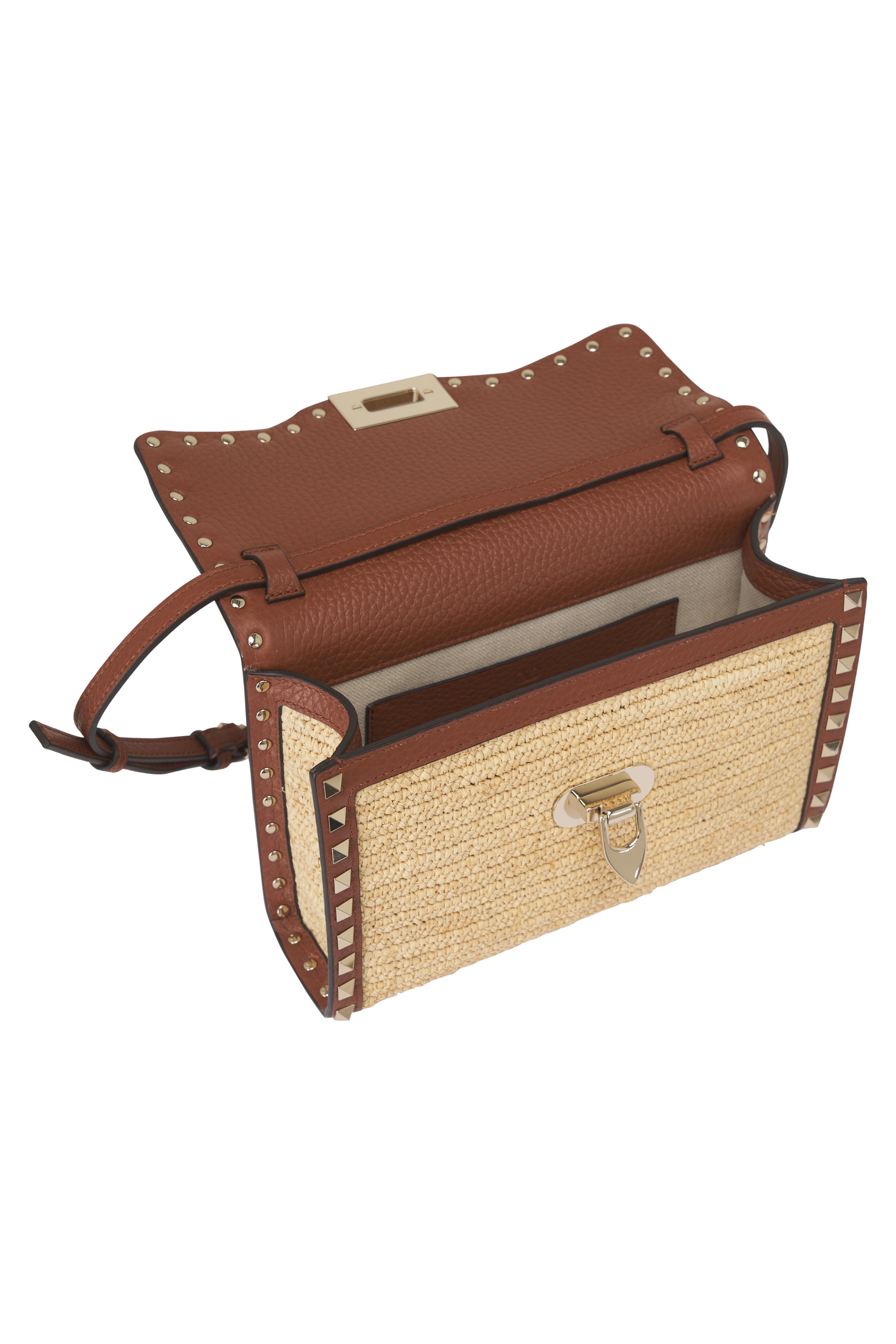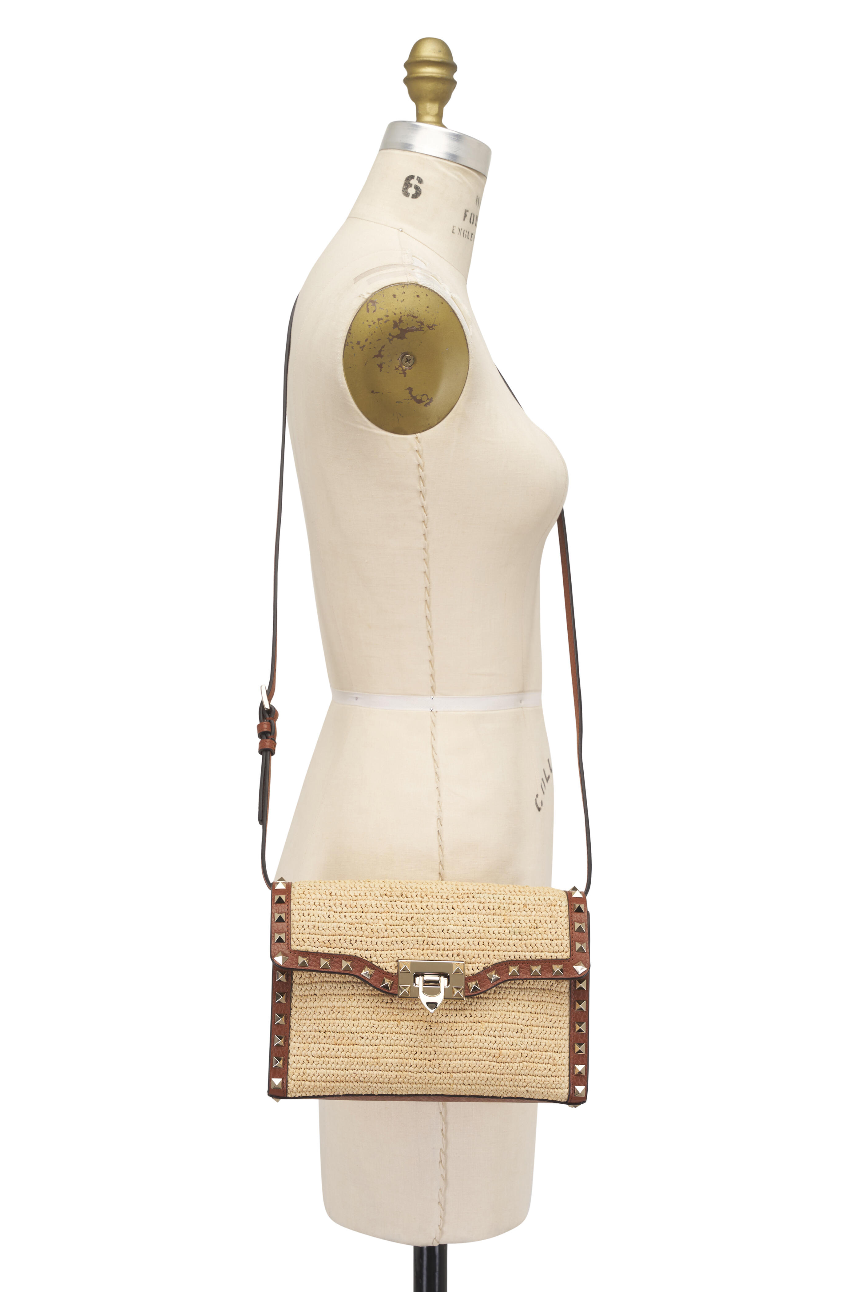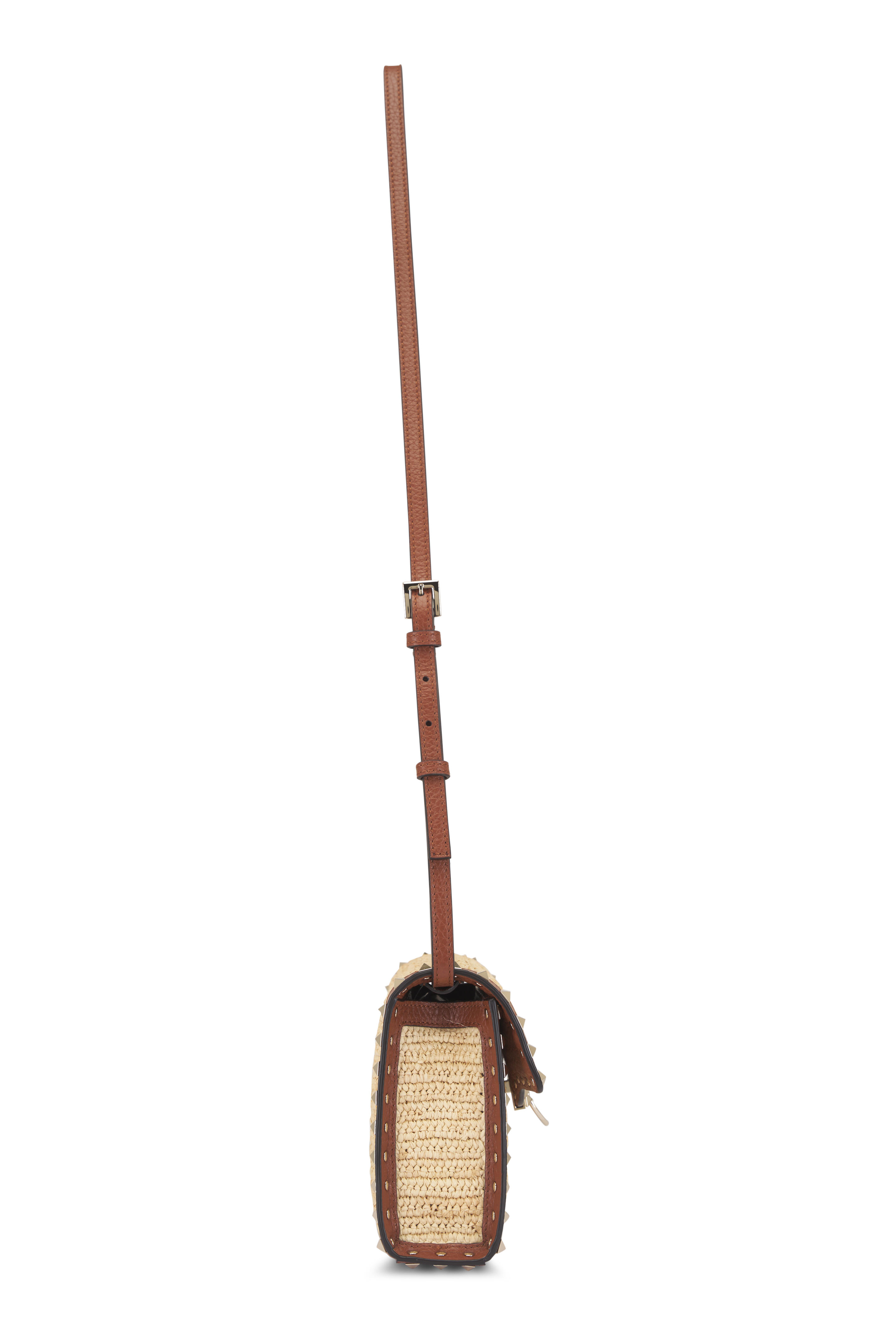 Raffia and leather outer. Canvas lining. Fold over flap; Hook closure. Adjustable leather shoulder strap. Platinum finish studs and hardware. Interior wall pocket. Made in Italy. Dimensions: 8.9" W x 5.9" H x 2.4" D. Shoulder strap drop: 21.3".