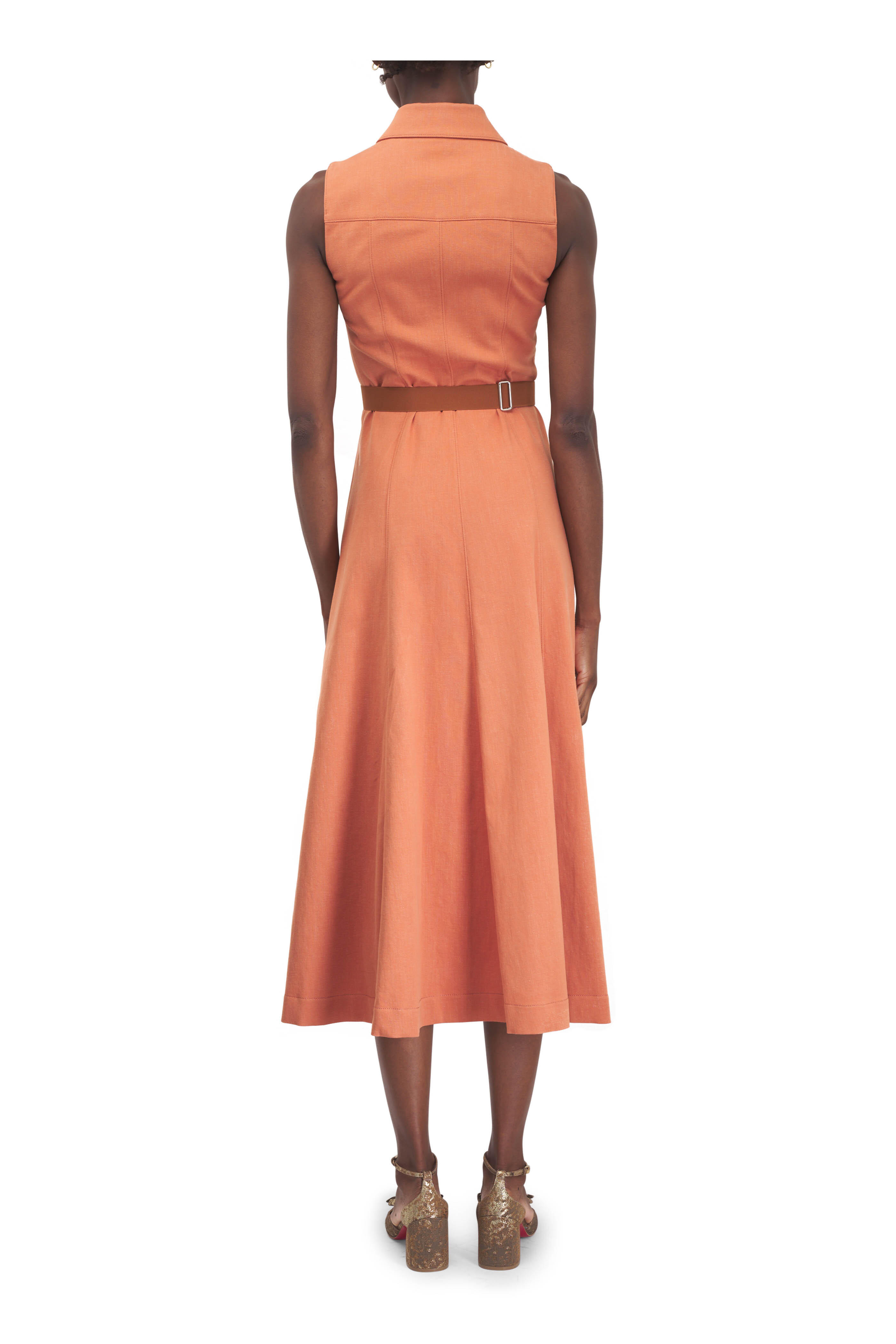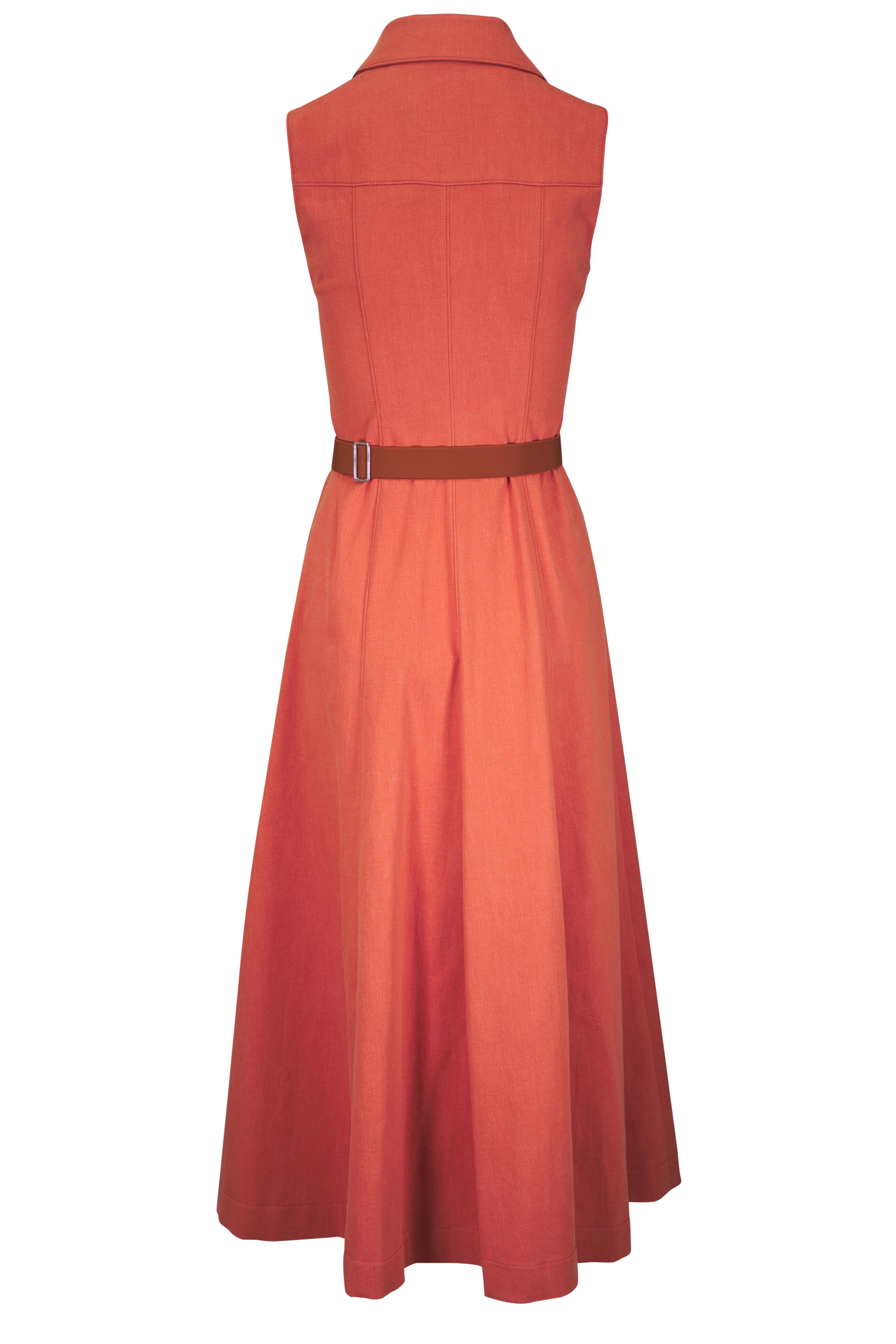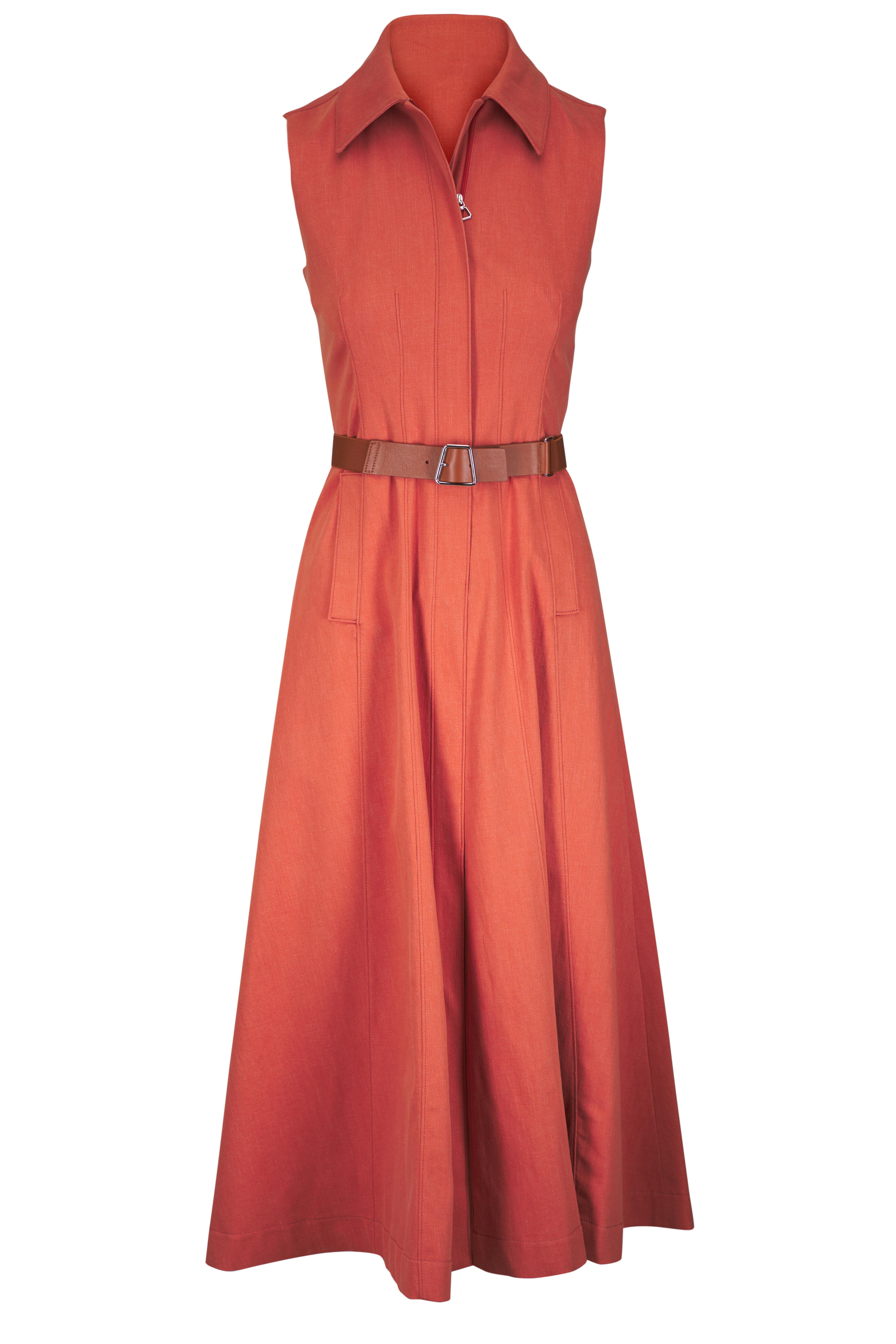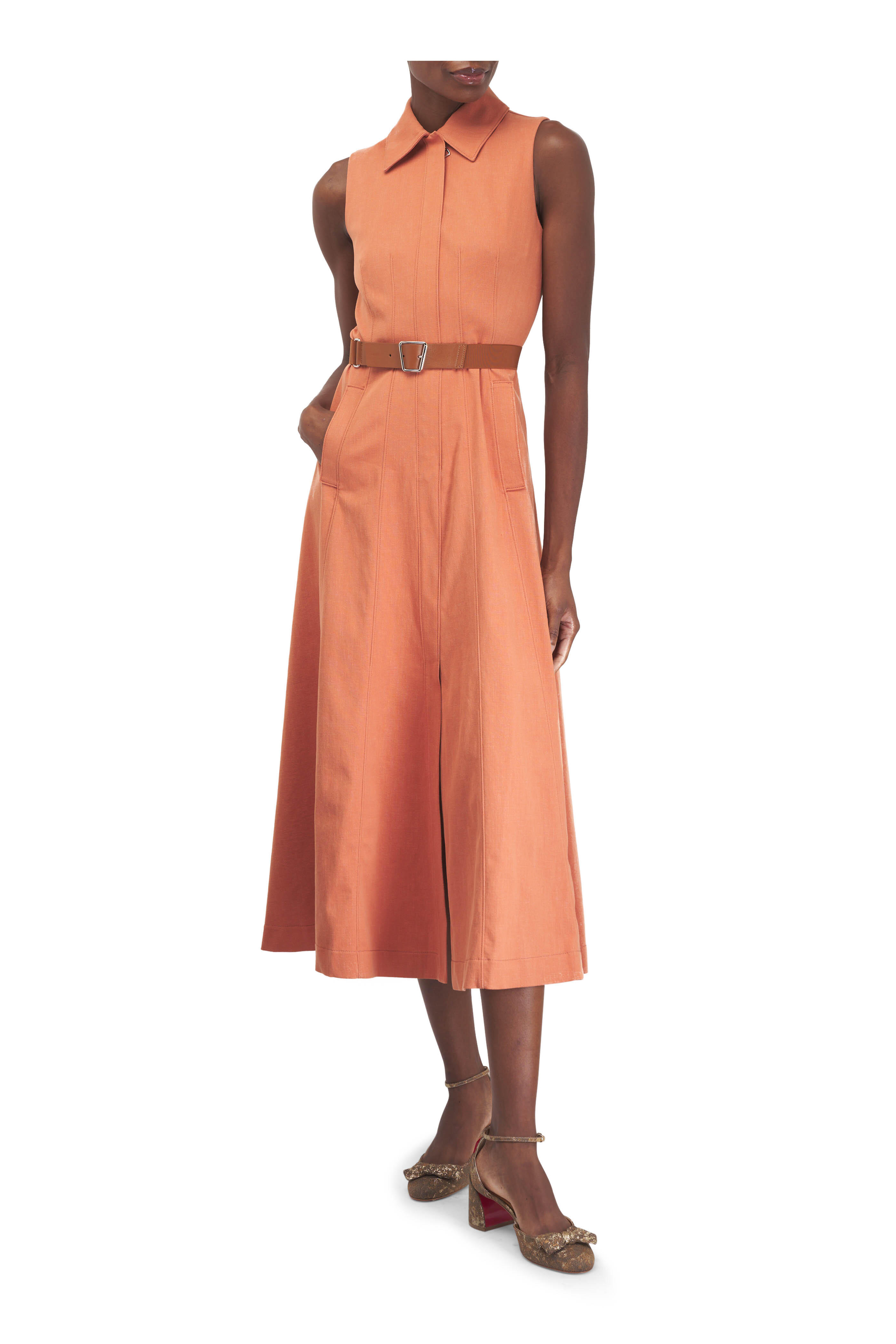 Spread collar. Concealed front zip. Removable self belt. Front slip pockets. Front vent. Imported. 50" shoulder to hem. 98% cotton, 2% polyurethane. Dry clean.
