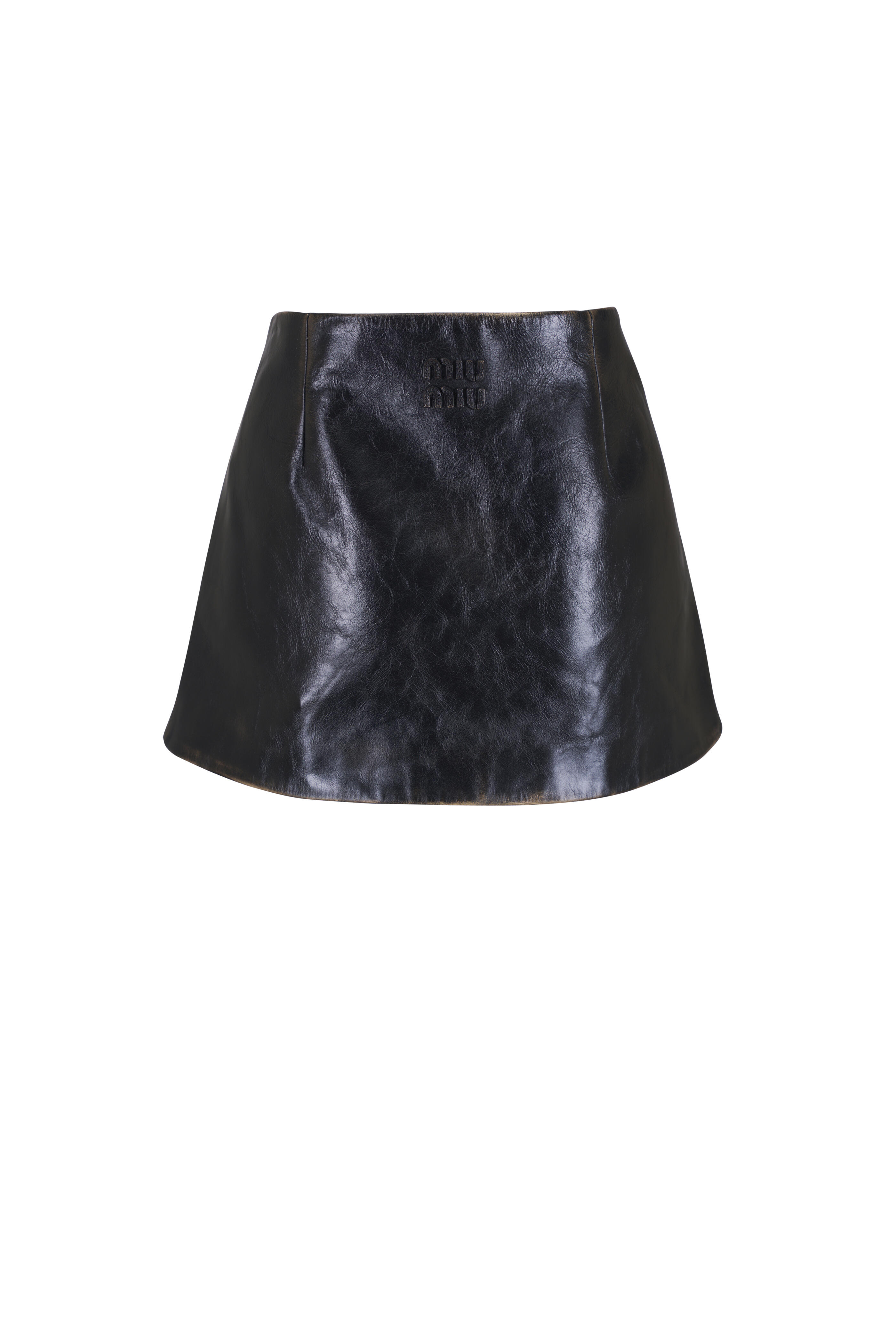 Crinkled calfskin leather; fully lined. Off set front slit. Concealed side zip. Tonal logo detail. Made in Italy. 12.5" length. Hand wash.