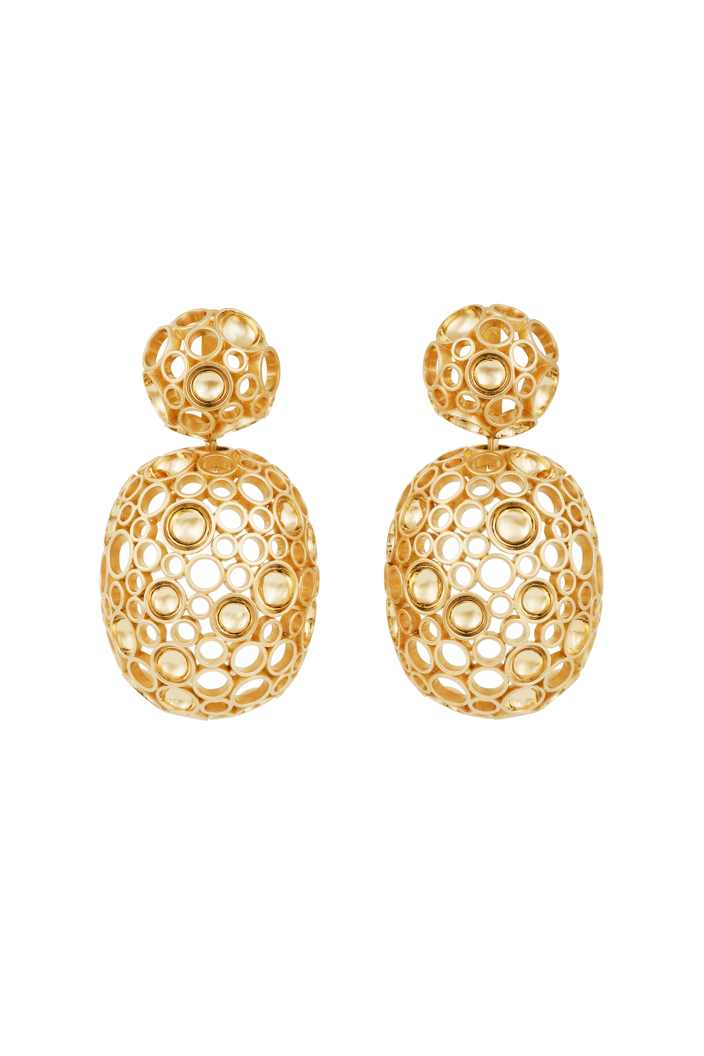 18k Brushed Yellow Gold. Open & Concave Circular Motifs. High Polished Mirror-Like Finish. Please store your jewelry in the supplied pouches and cases, to prevent them from scratching.. Please avoid contact with water, perfume, other liquids or strong substances.