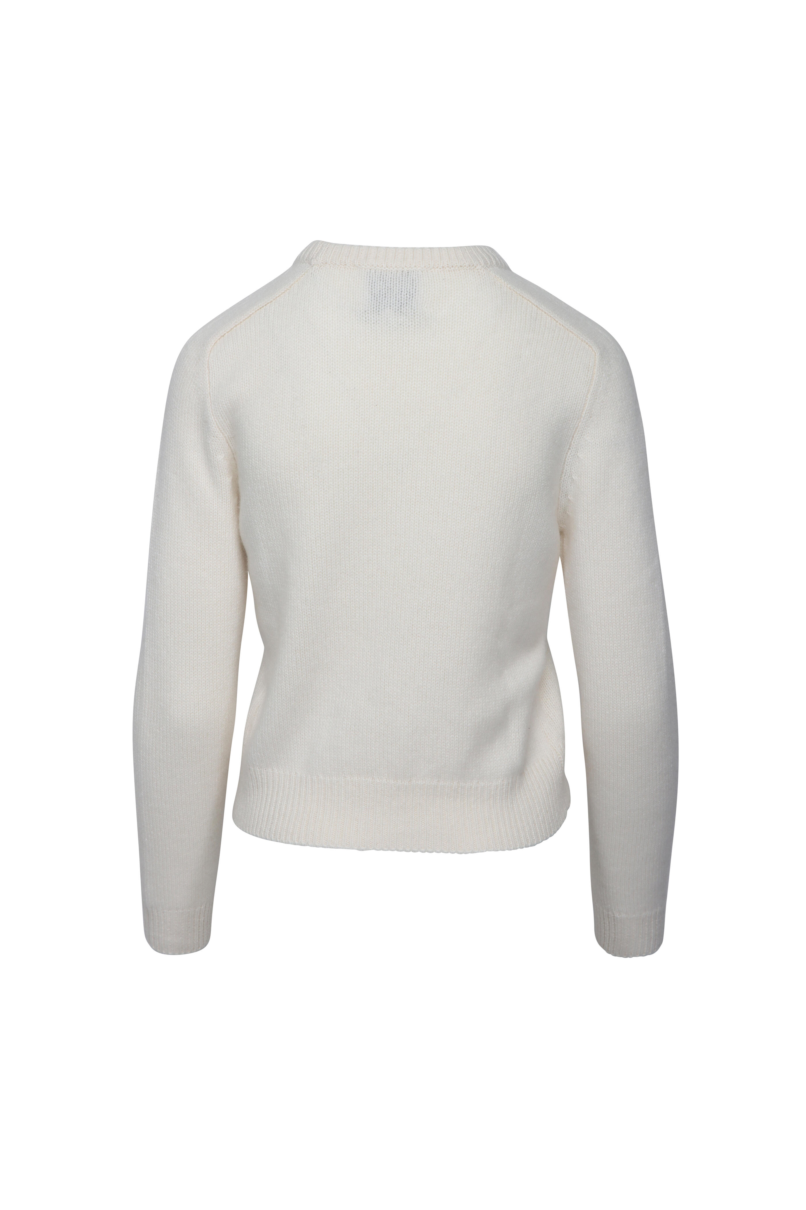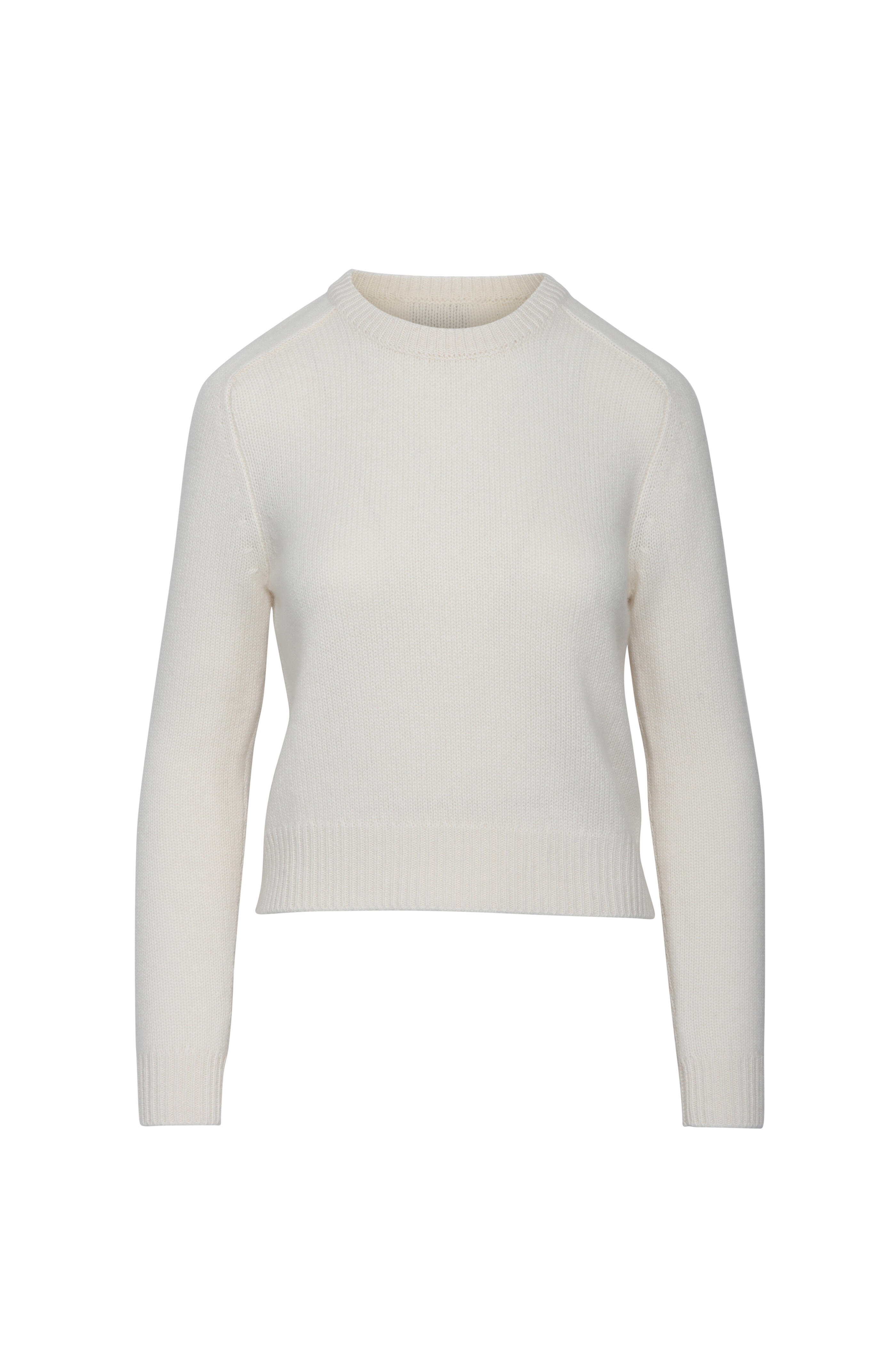 Cry clean. Crewneck. Long sleeves. Relaxed fit. Straight hem. Imported. Cropped length. 100% cashmere.