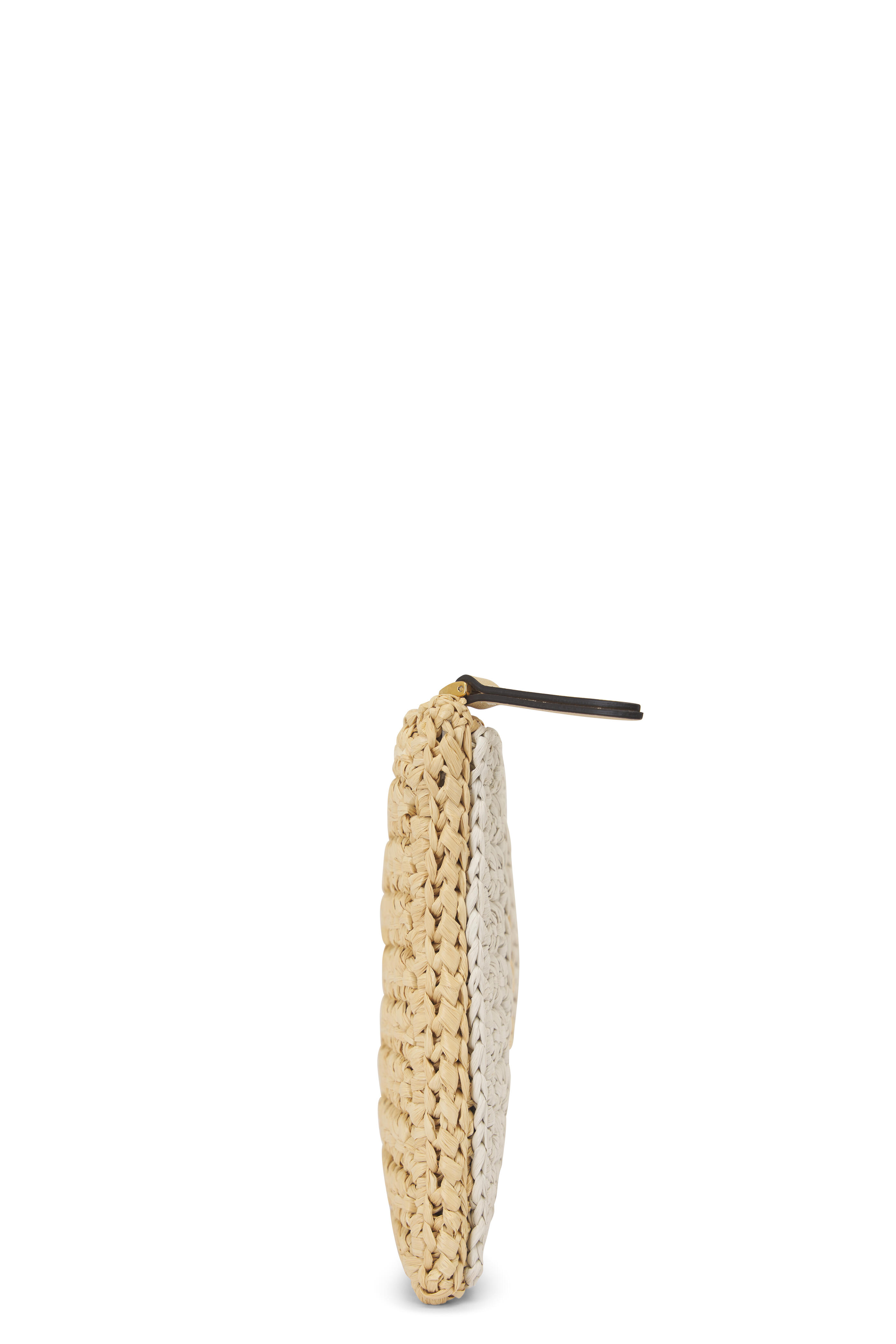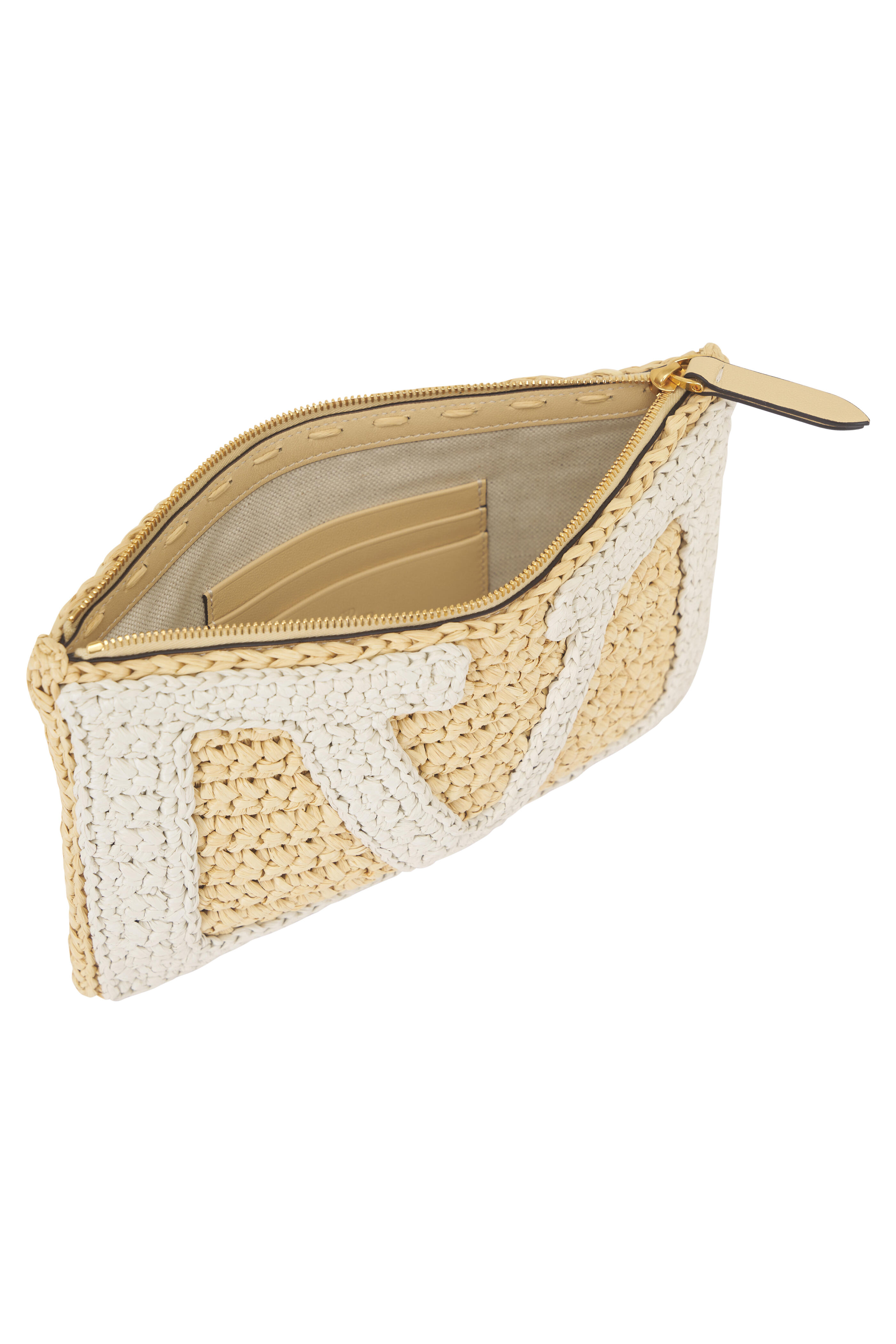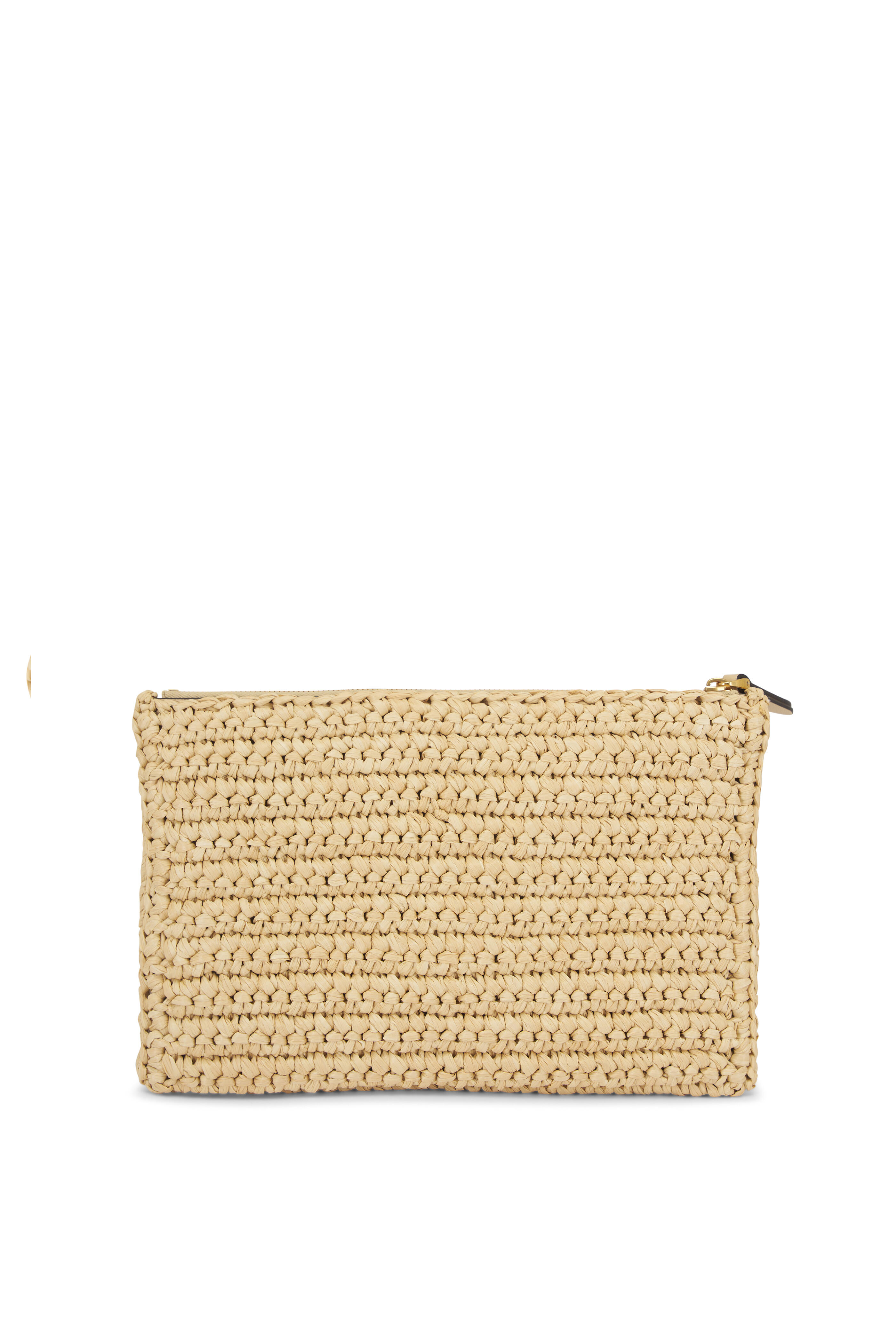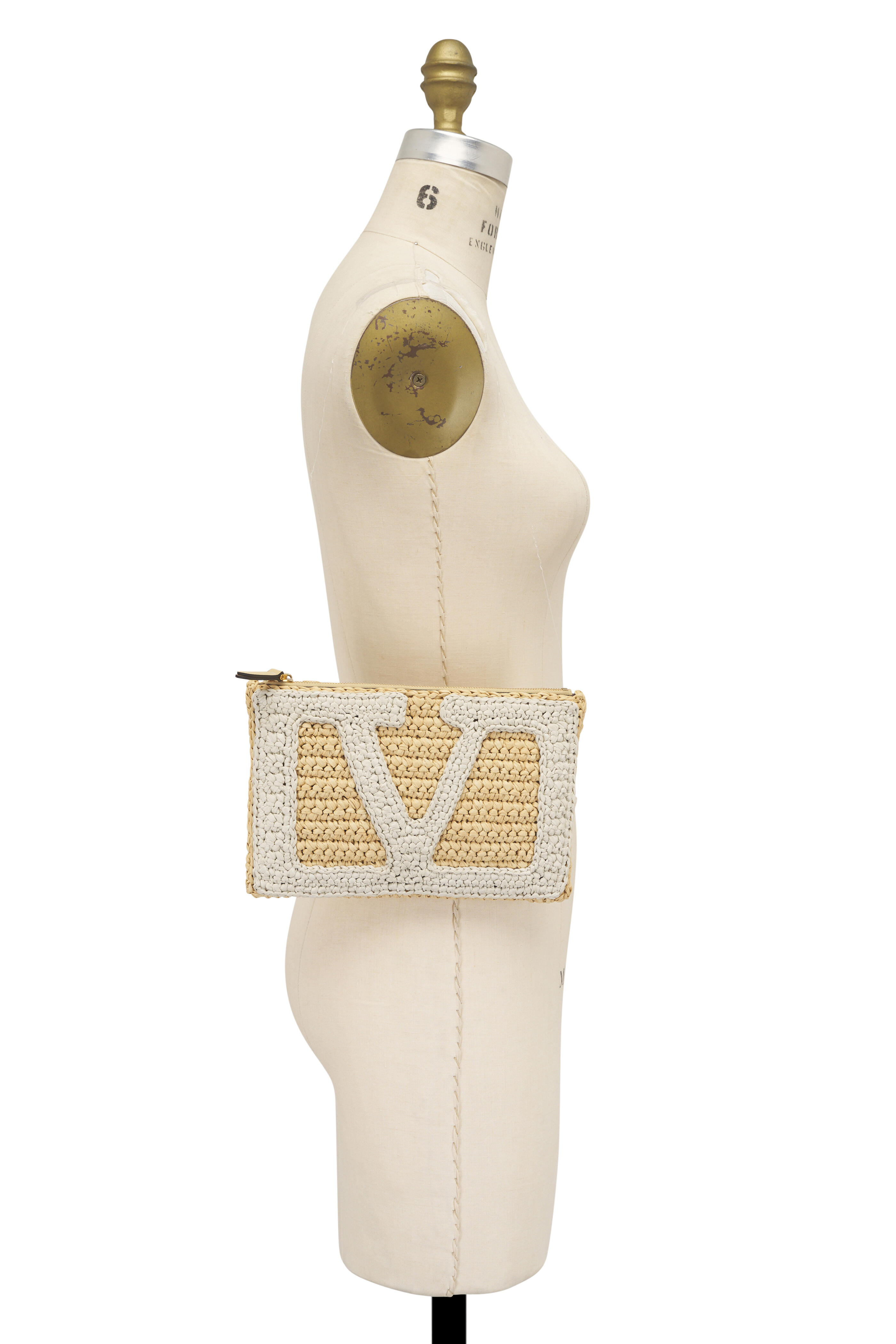 Raffia outer. Canvas lining. Zipper closure. Antique gold-finish hardware. VLogo signature logo. Interior wall pocket. Made in Italy. Width: 9.1". Height: 6.3".