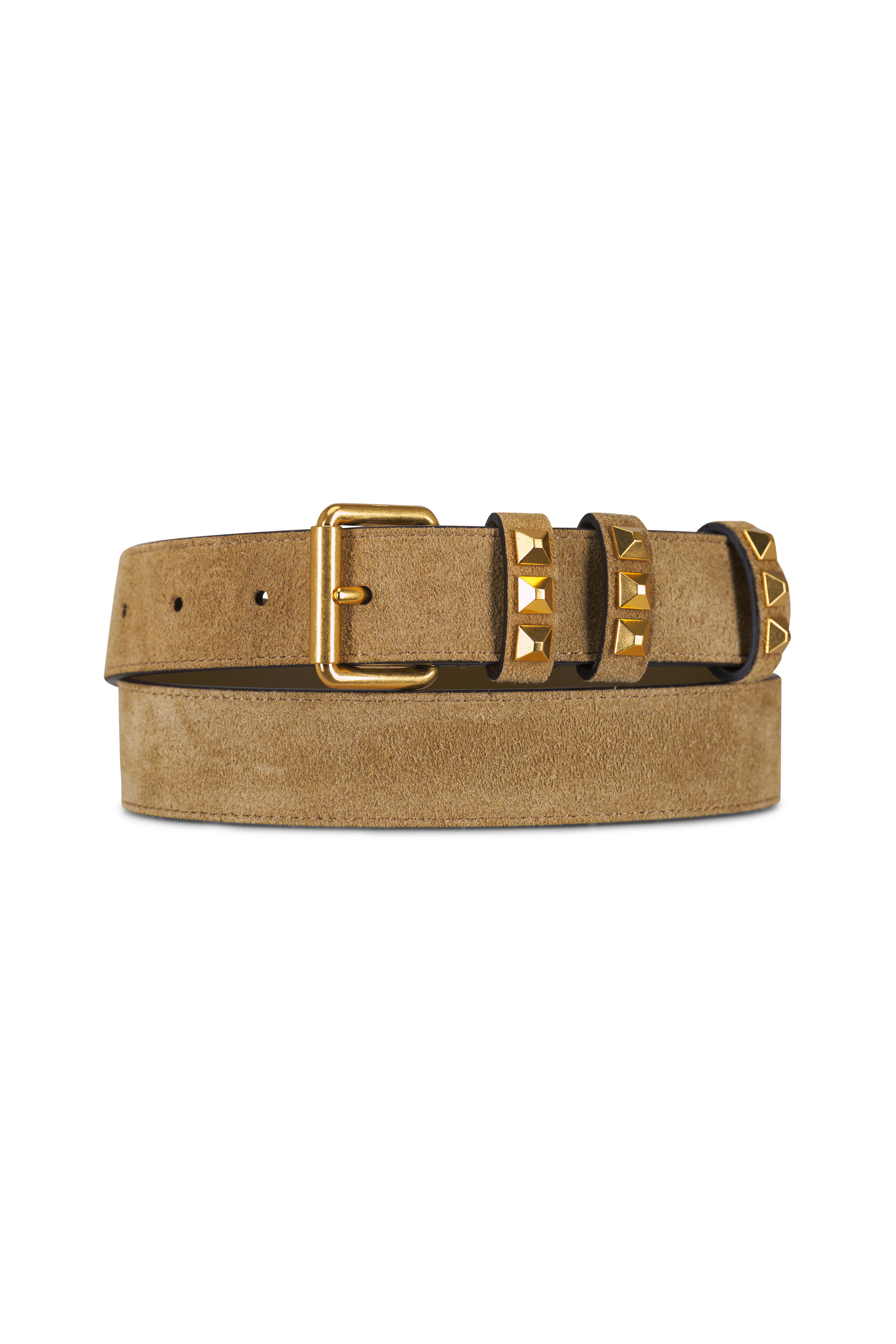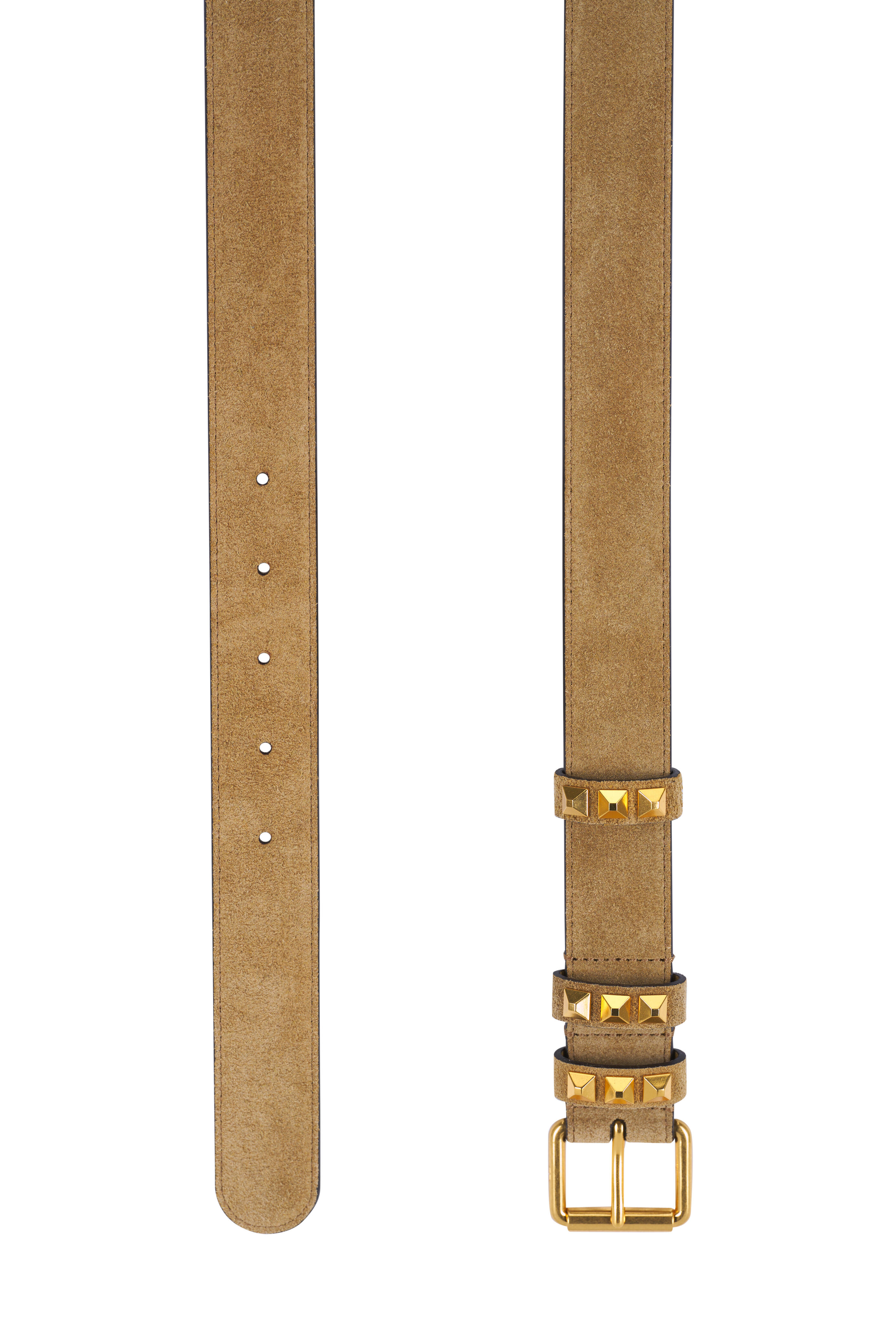 Suede. Square brass buckle. Triple loop keeper with Rockstud embellishments. Round tip. Made in Italy. Width: 30mm.