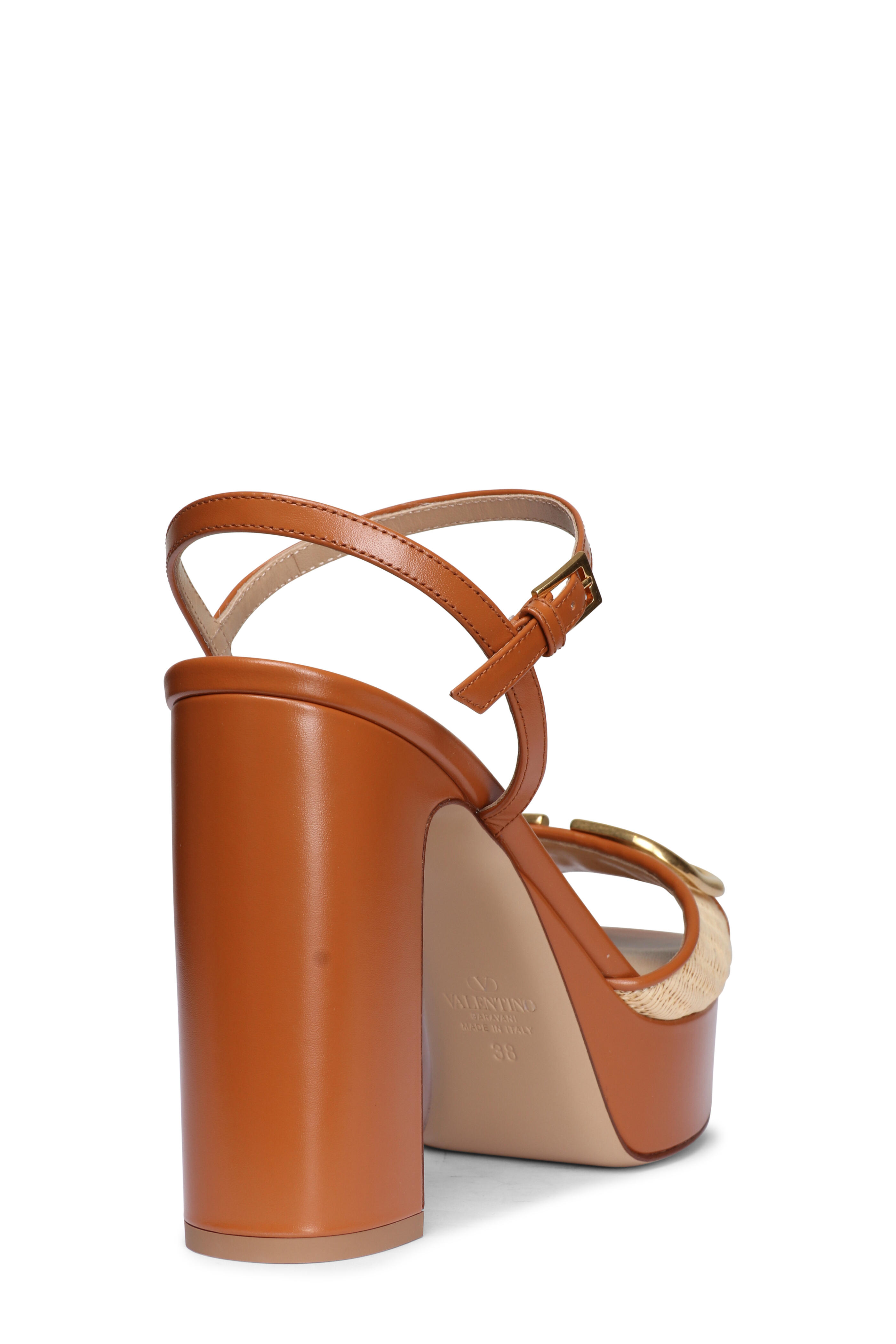 Raffia and leather upper. Leather lining and sole. Open toe. Adjustable ankle strap. VLogo signature accessory. Antique-effect brass finish. Slip-on style. Block heel. Made in Italy. Heel measurement: 115mm.
