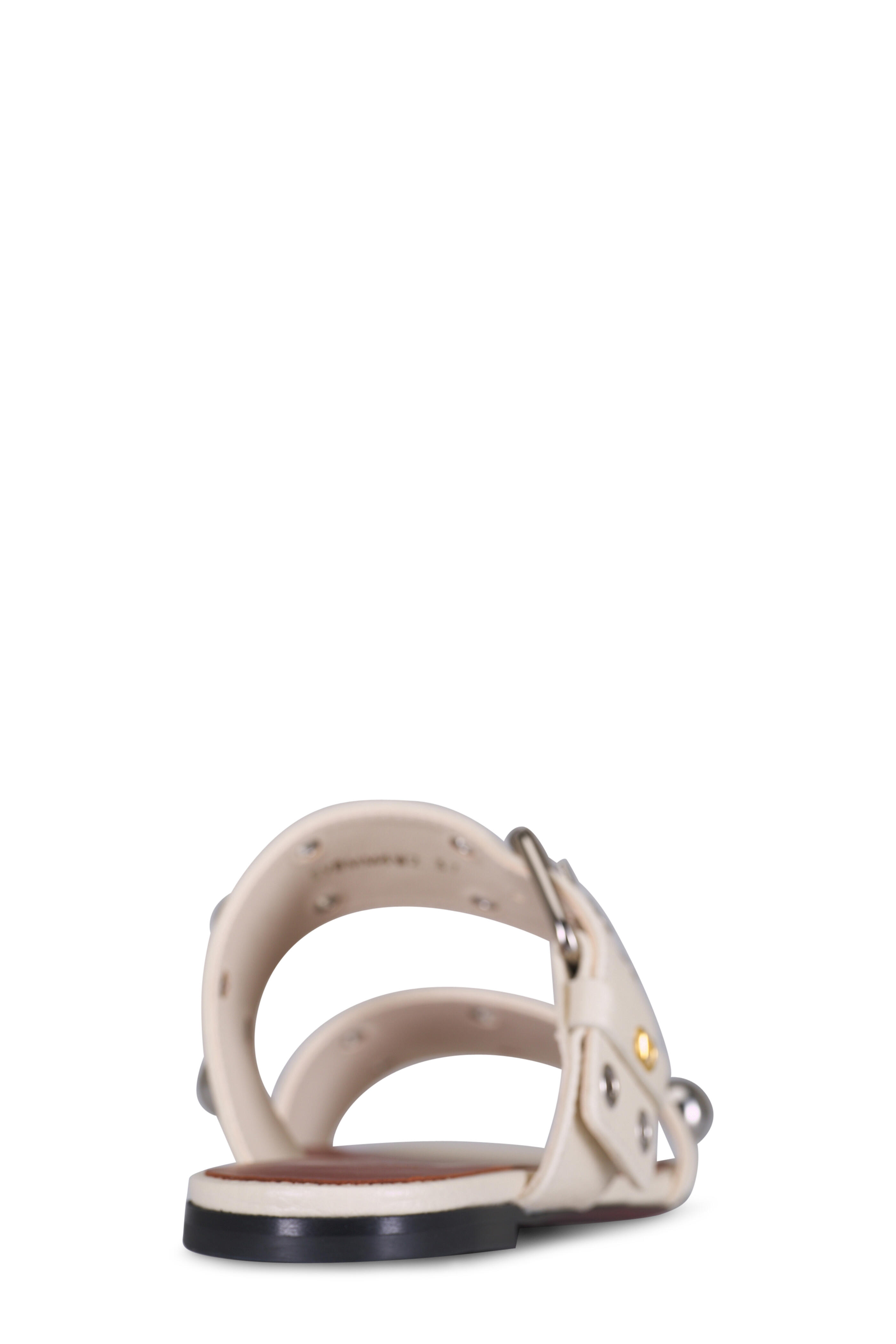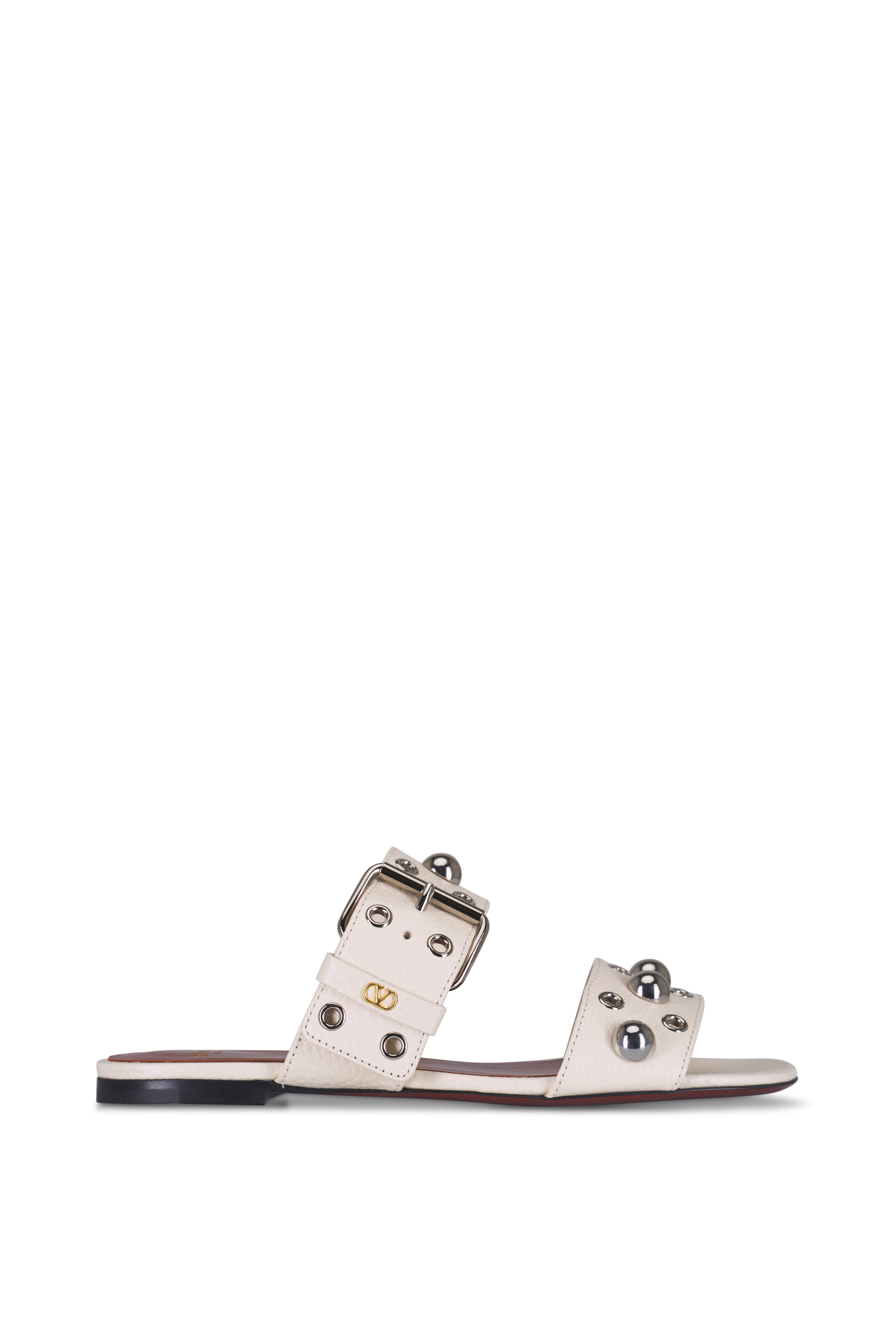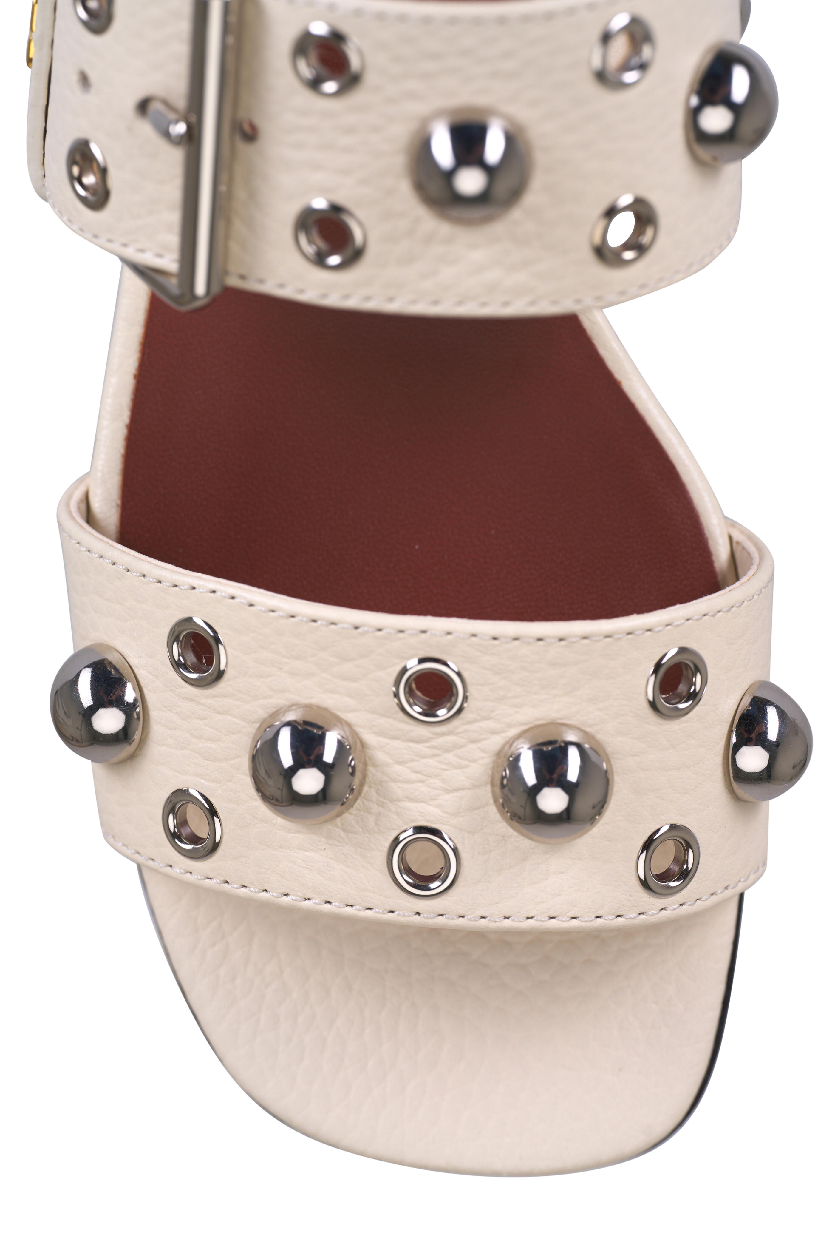 Leather upper. Open, square toe. Slip on style. Adjustable buckle strap. Palladium-finish ball studs and eyelets. Leather lining and insole. Made in Italy.