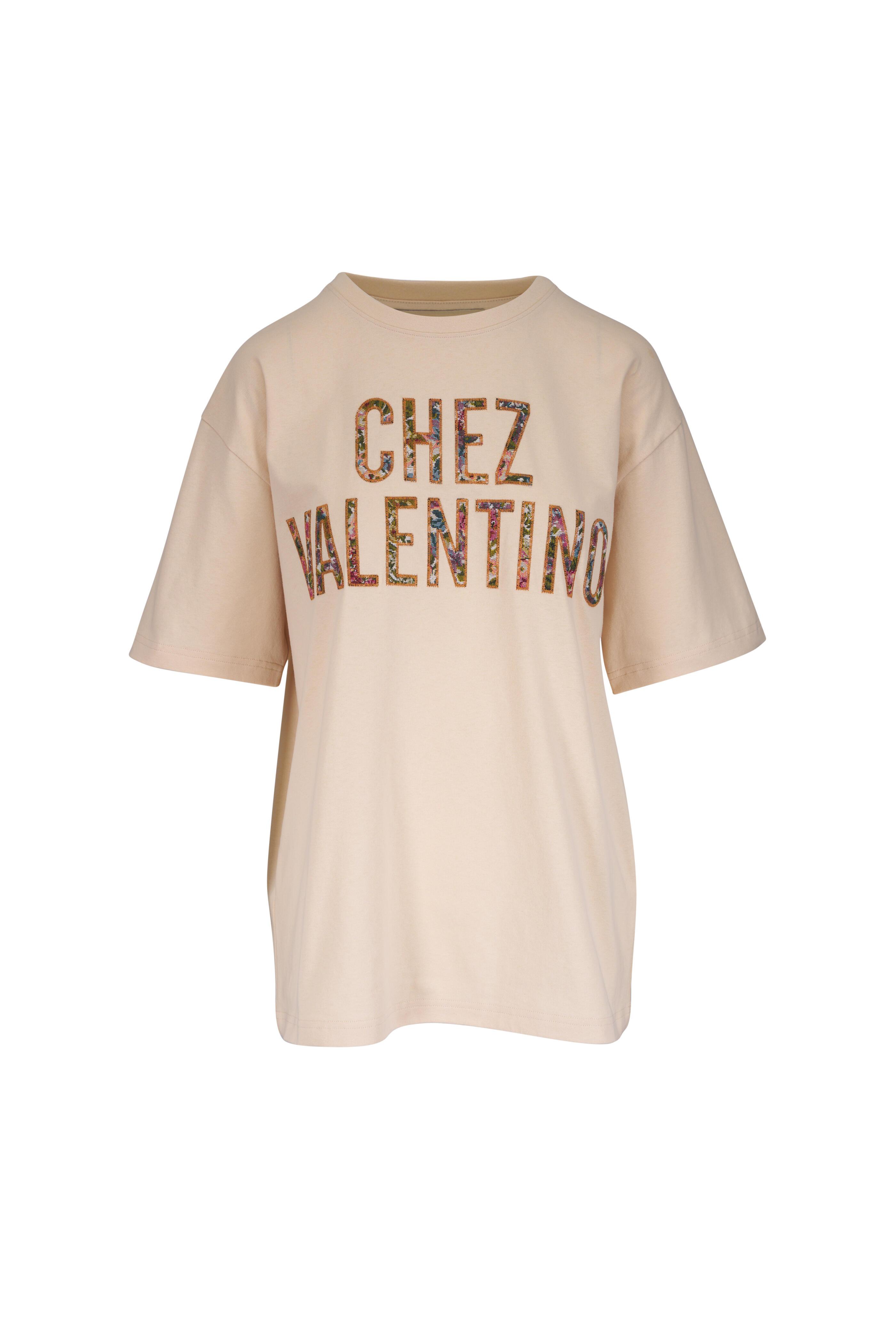 Crew neckline. Pullover style. "Chez Valentino" print. Straight hem. Made in Italy. Shoulder to hem 27" (size s). 100% Cotton. Dry clean.