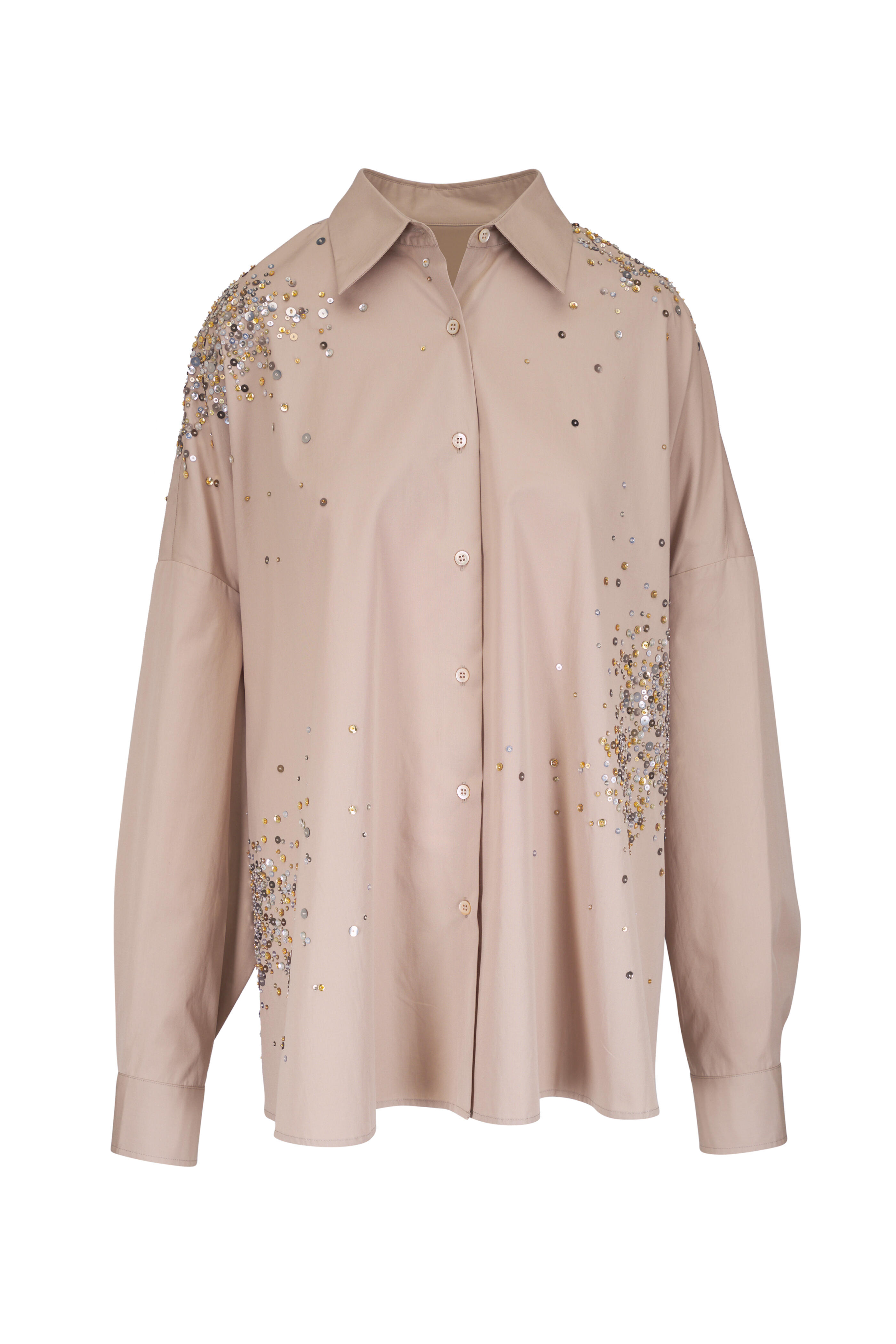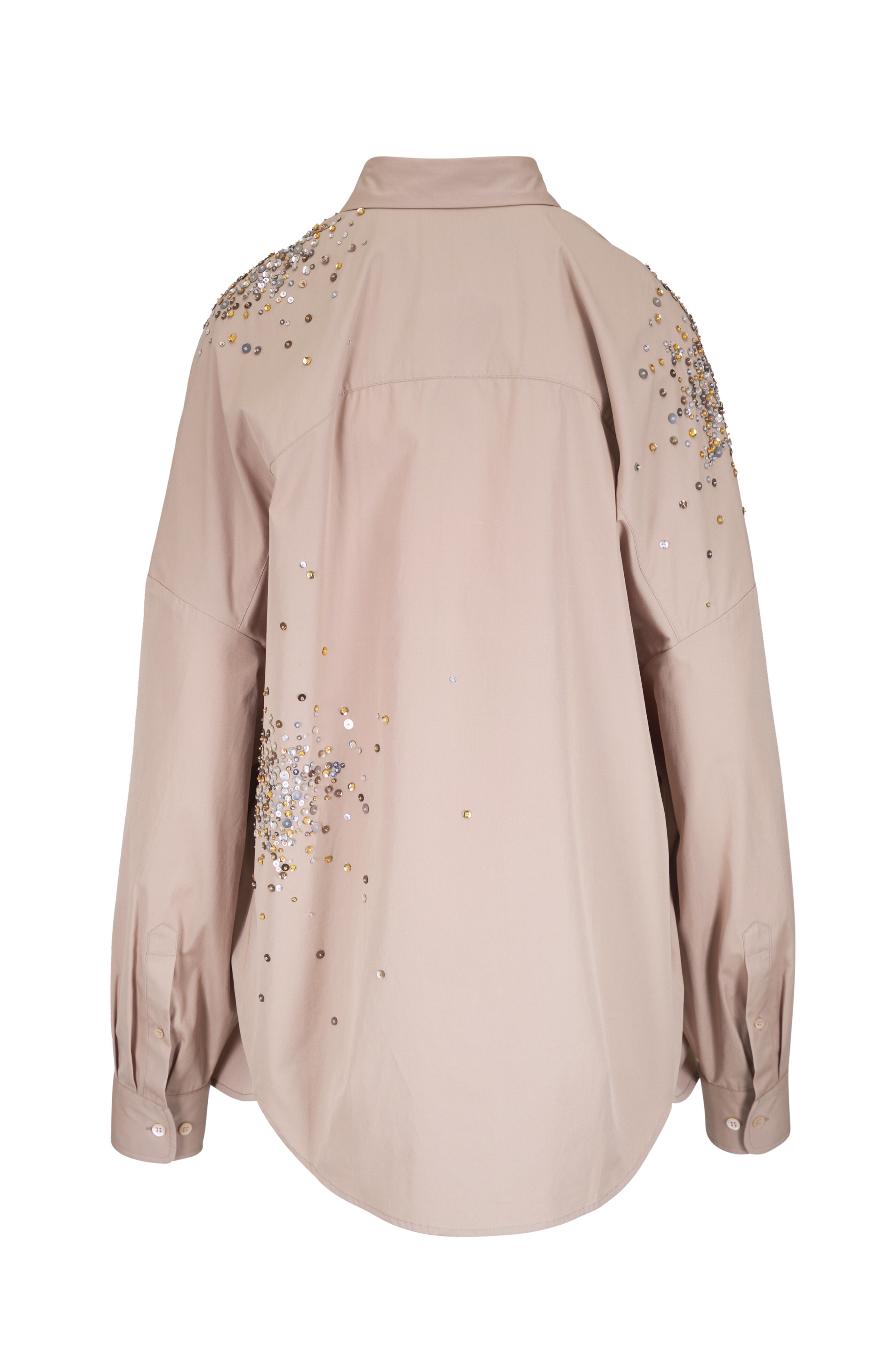 Spread collar. Front button placket. Embellished sequin detailing. Made in India. Oversized. 100% cotton. Dry clean.