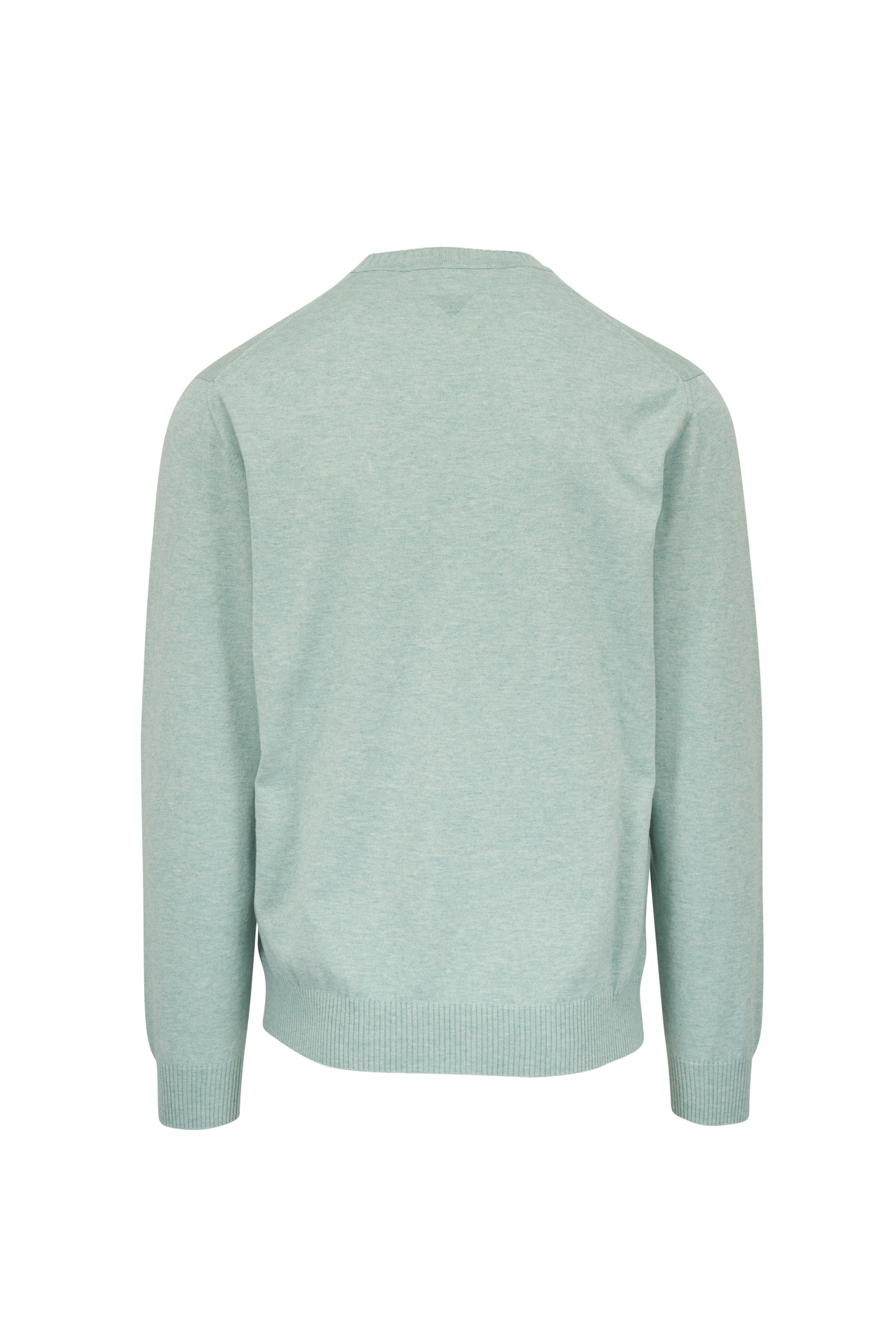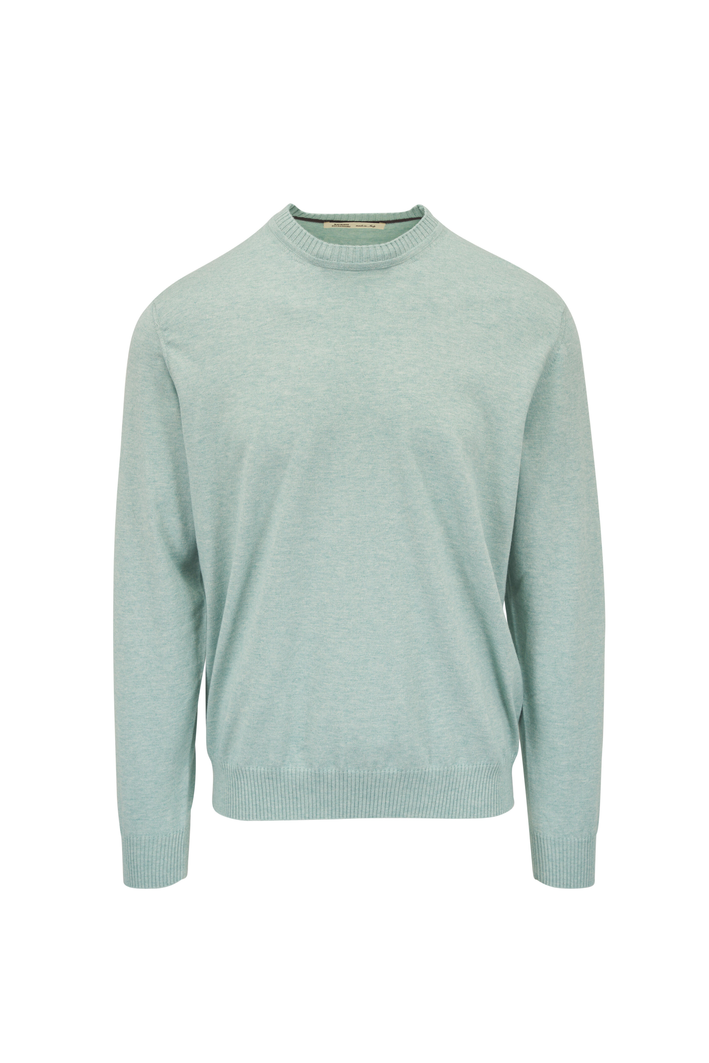 Crew neckline. Ribbed trims. Made in Italy. 85% cotton, 15% cashmere. Hand wash.