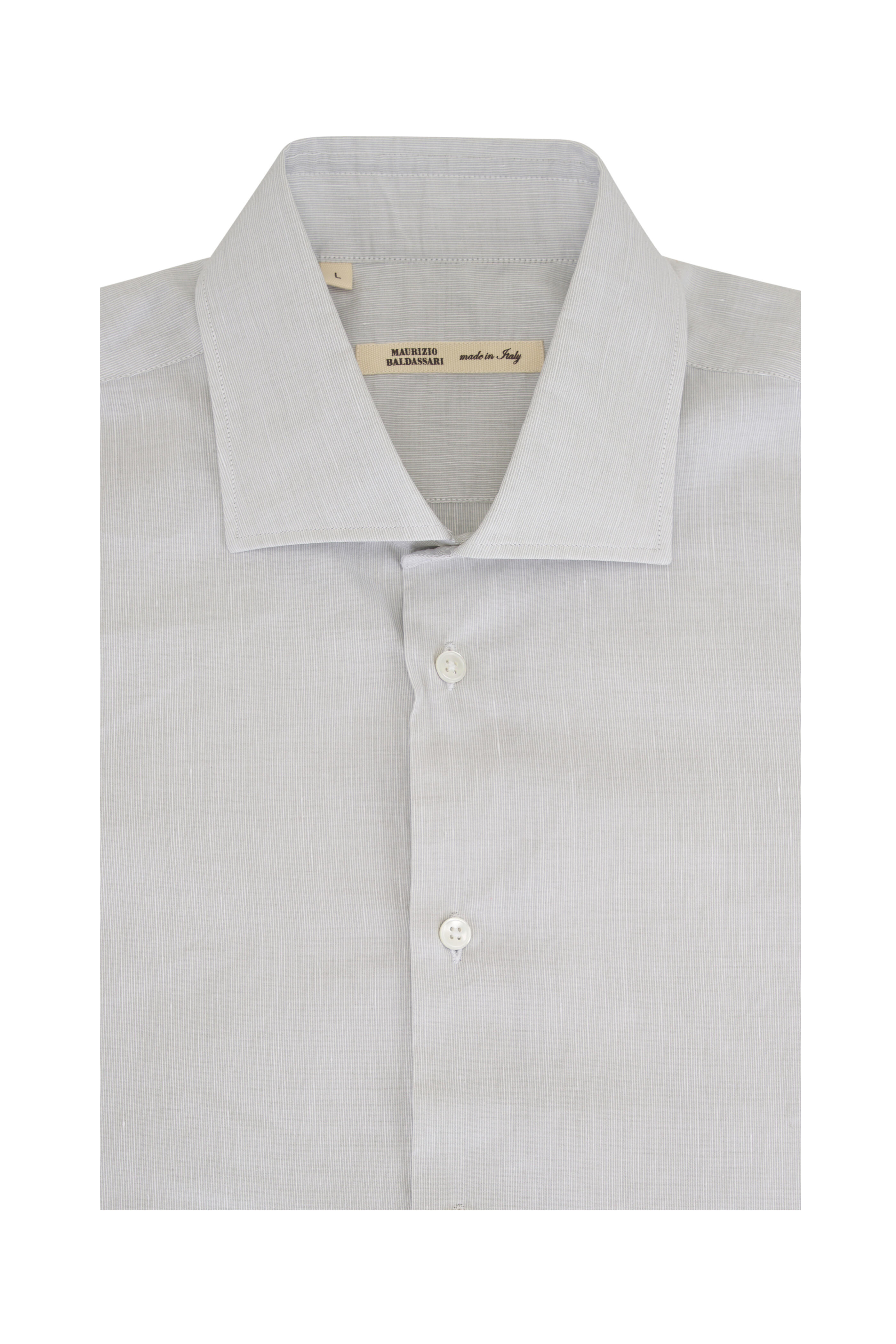 Spread collar. Front button placket. Single button mitered cuffs. Made in Italy. Shoulder to hem 29" (size L). 54% Cotton, 25% flax, 21% lyocell. Machine wash.