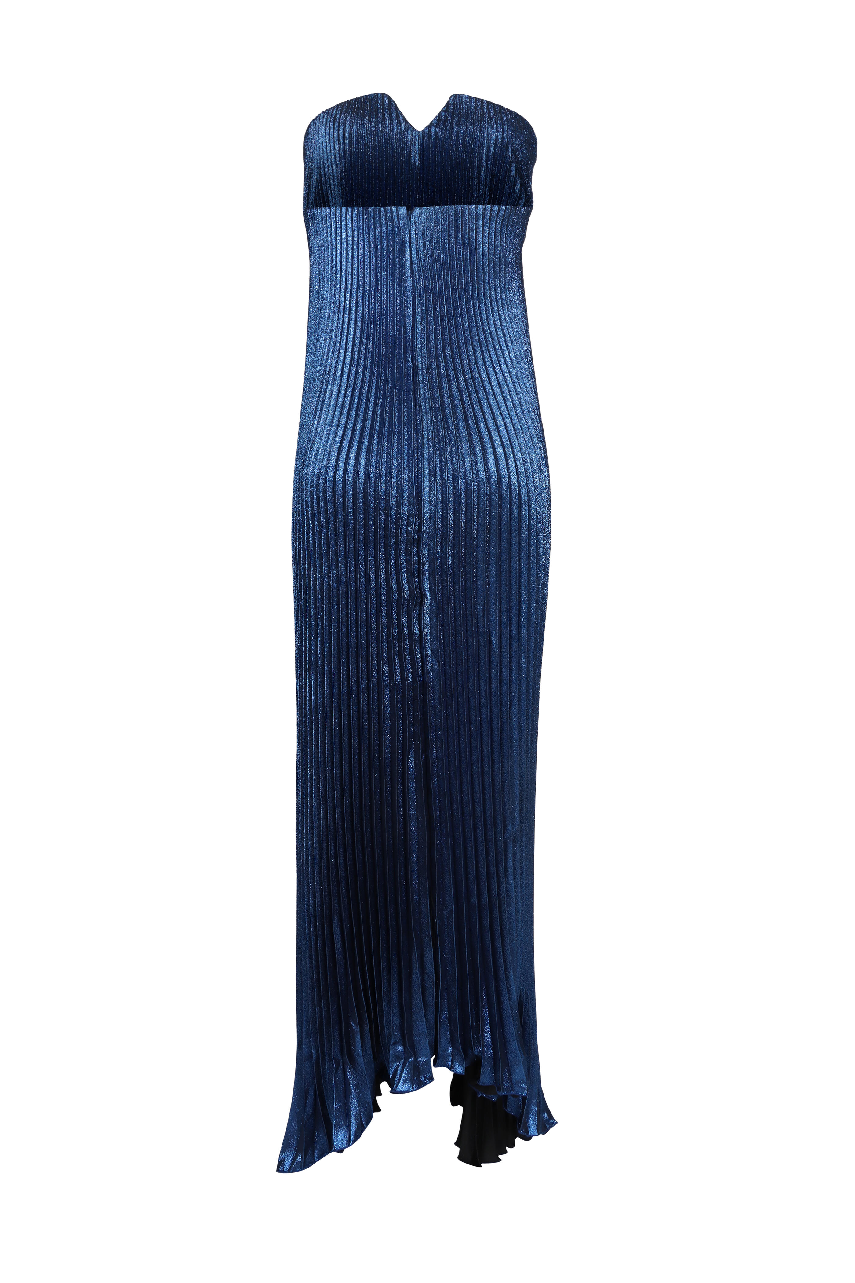 V-notch bandeau neck. Strapless. Pleated. Corseted bodice. Asymmetric hem. Back zip closure. Imported. Maxi length. 100% polyester.