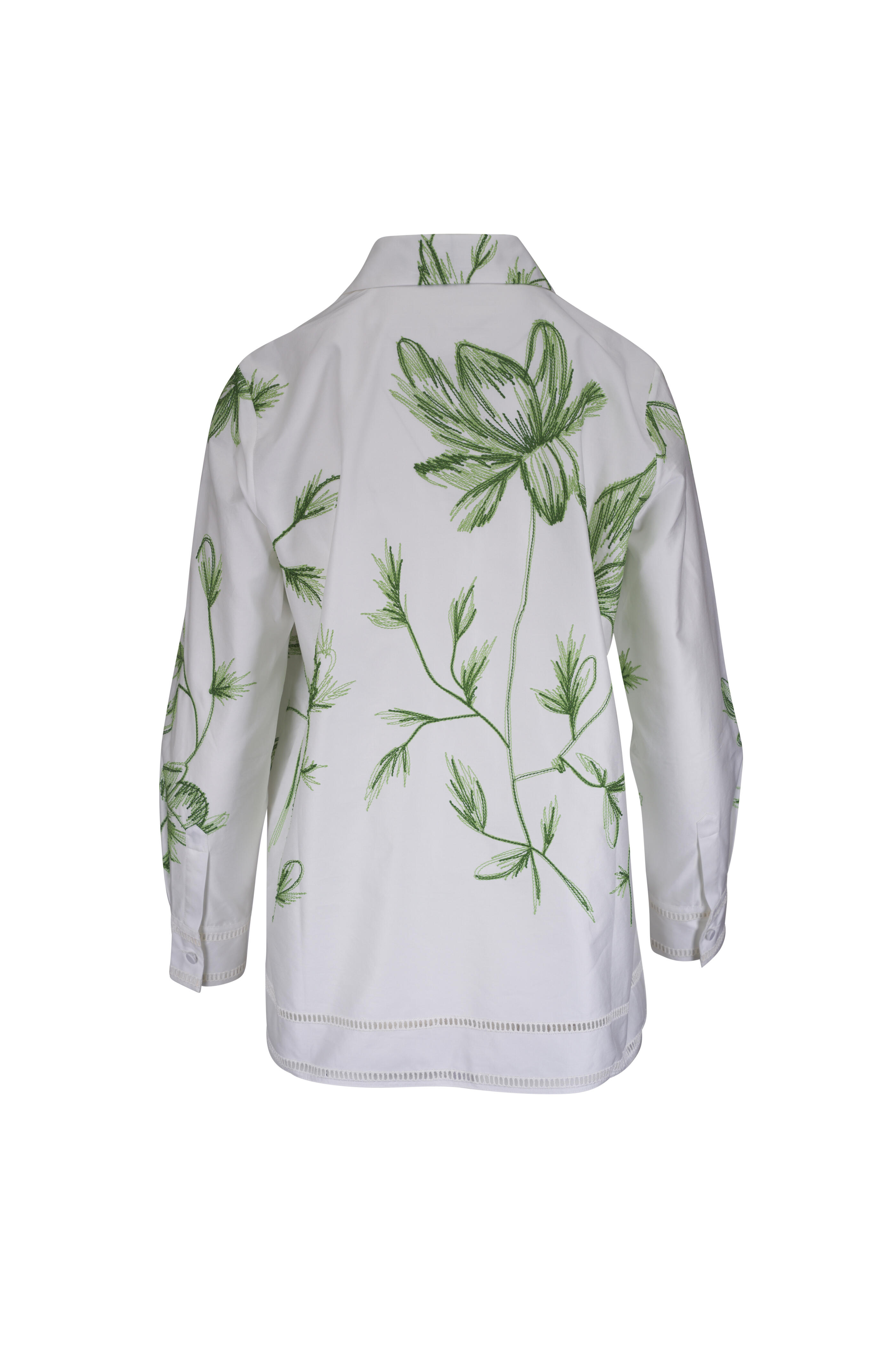 Spread collar. Concealed button placket. Single button squared cuffs. Embroidered detail at hem and sleeves. Vented hem. Made in Italy. Shoulder to hem 27" (size s). 100% Cotton. Dry clean.