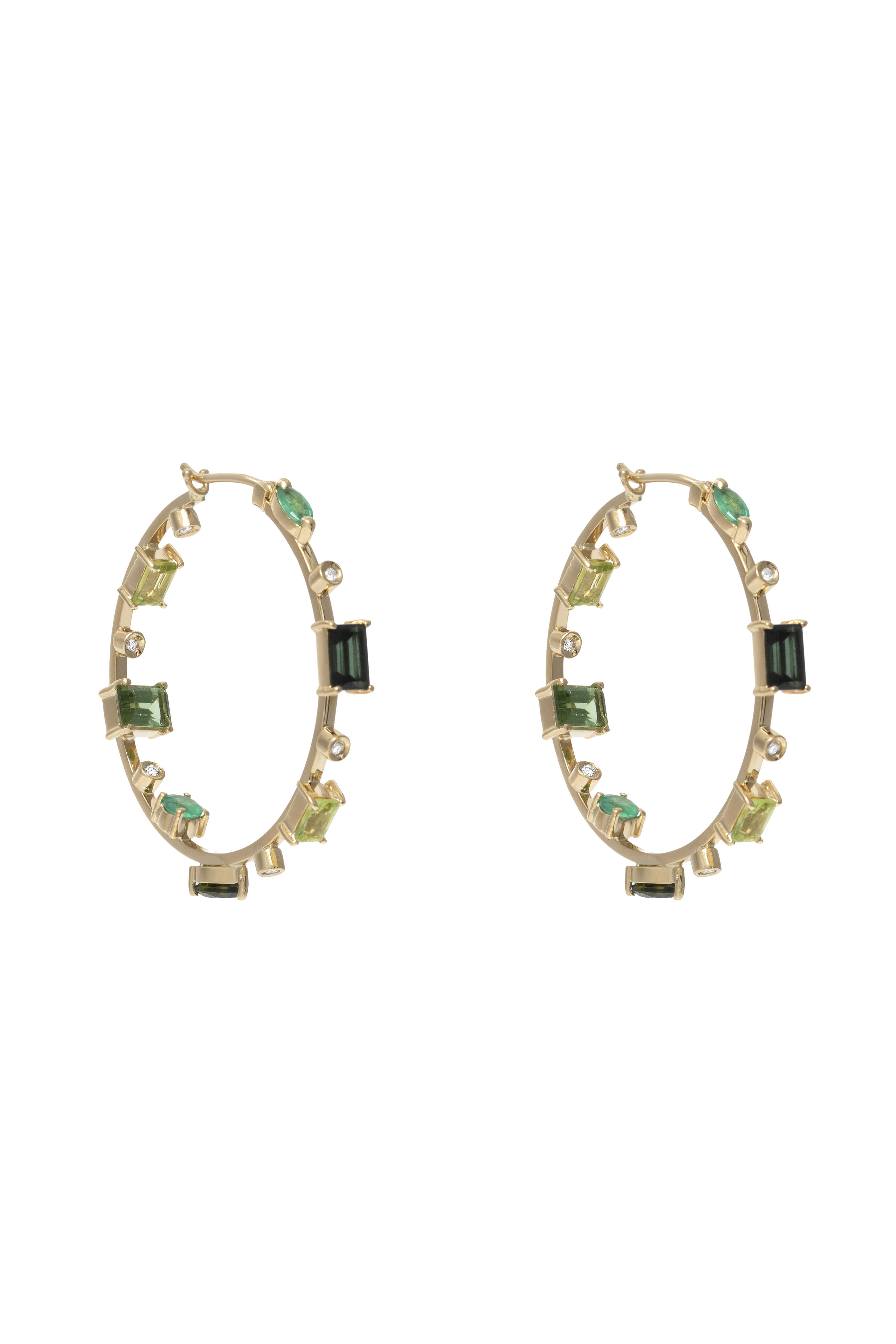 18k gold. Diamond 0.12 total carat weight. Emerald 1.40 total carat weight. Peridot 1.40 total carat weight. Green tourmaline 3.96 total carat weight. Mixed cut stones. Hoop style. Prong setting. Latch back. Made in Brazil.