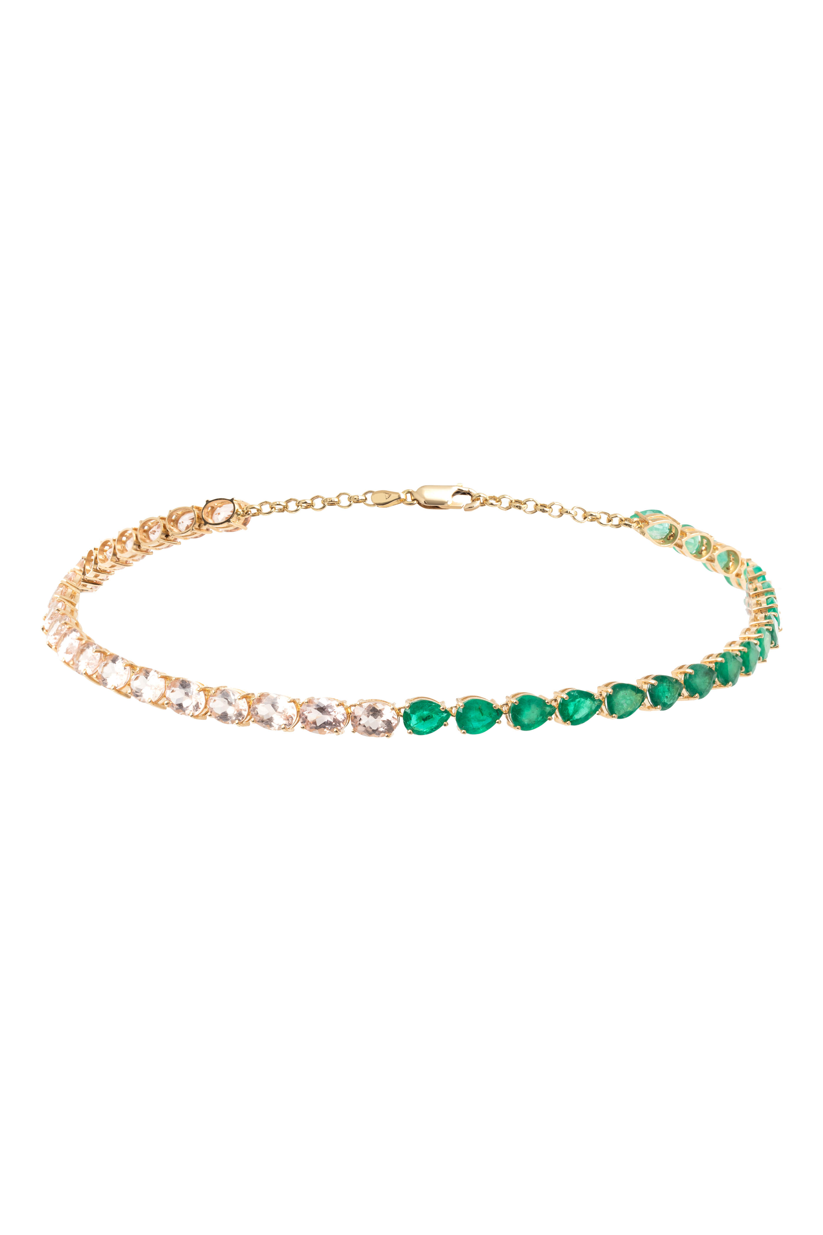 18k gold. Morganite 21.34 total carat weight. Green tourmaline 23.50 total carat weight. Oval cut morganite. Pear cut green tourmaline. Half and half. Prong setting. Chain link. Lobster claw claps. Made in Brazil.