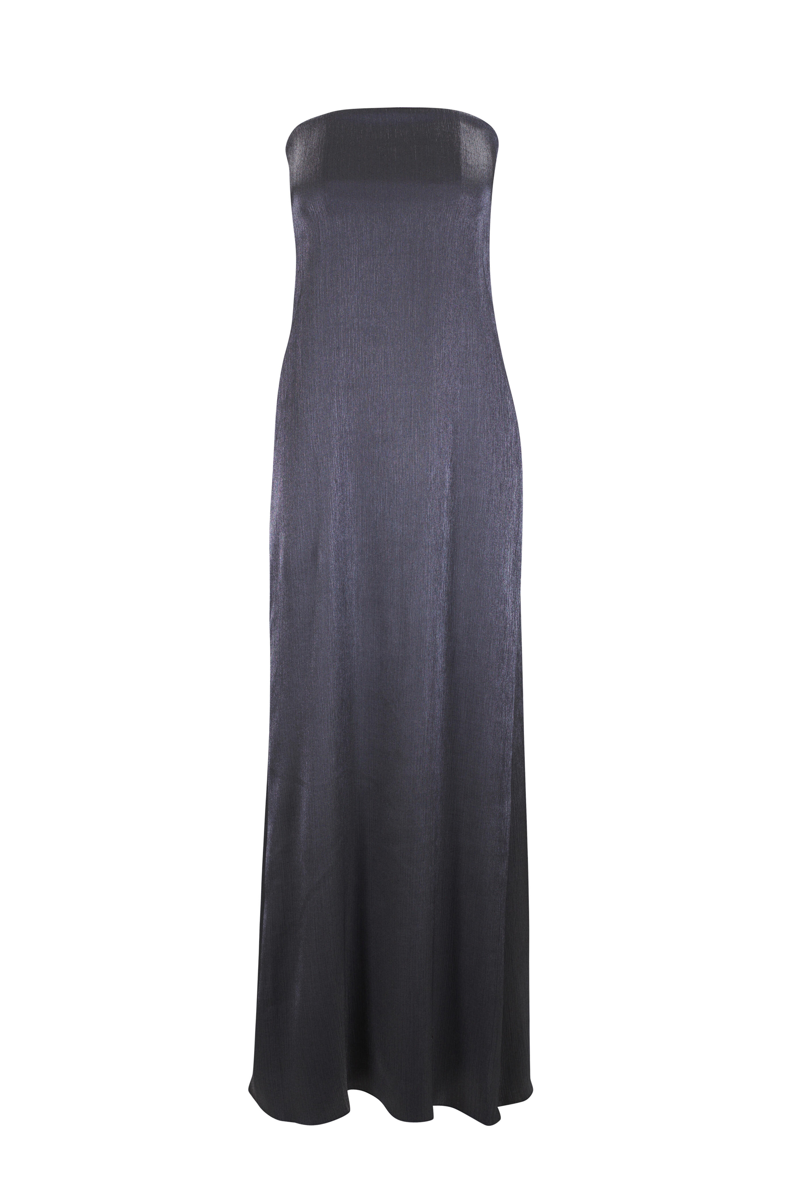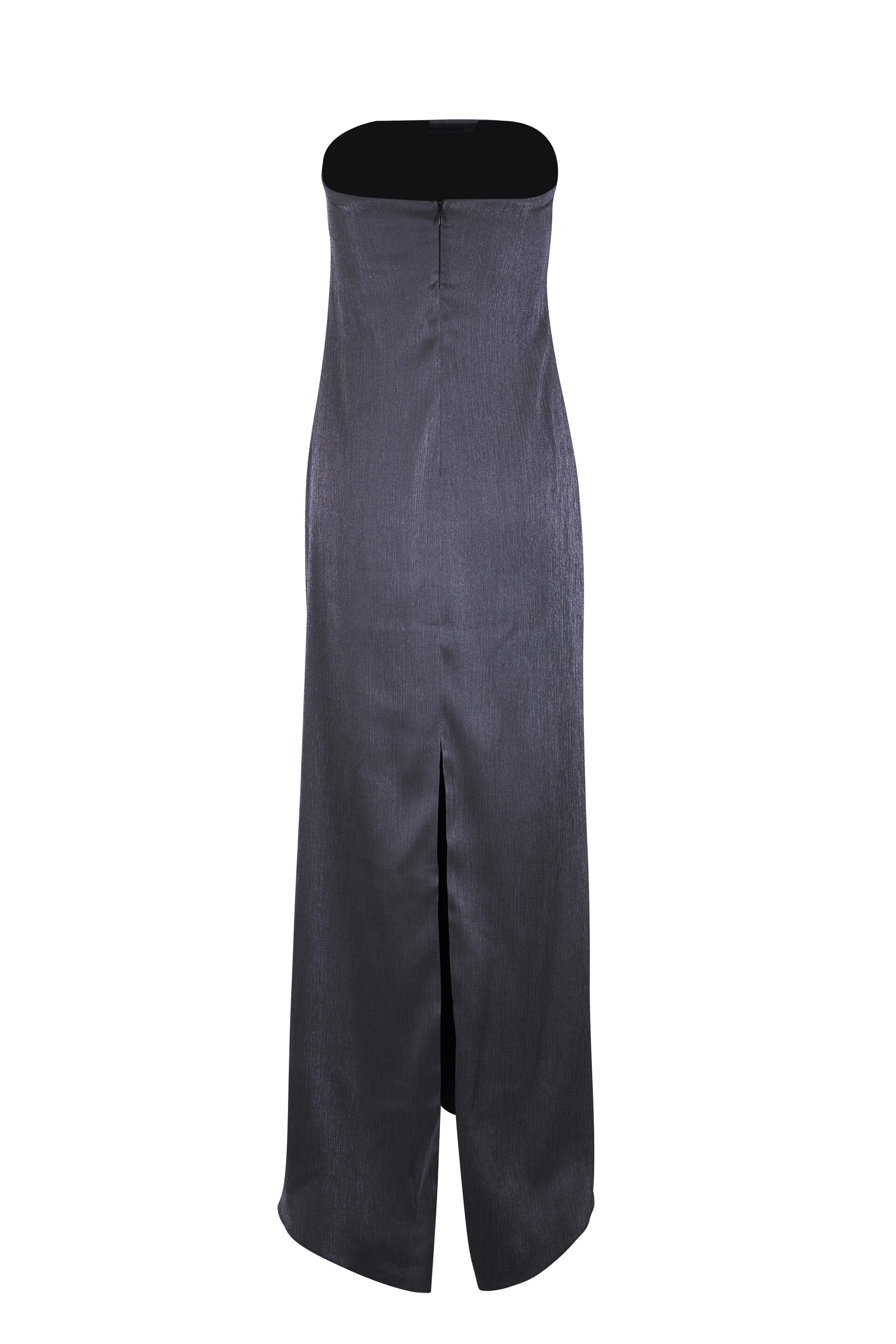 Strapless neckline. Concealed back zip. Internal boning at bust. Back slit. Made in the USA. Approximately 53 ½" top of garment to hem (measurements taken from size XS). 78% viscose, 22% elastane; lined. Dry clean.