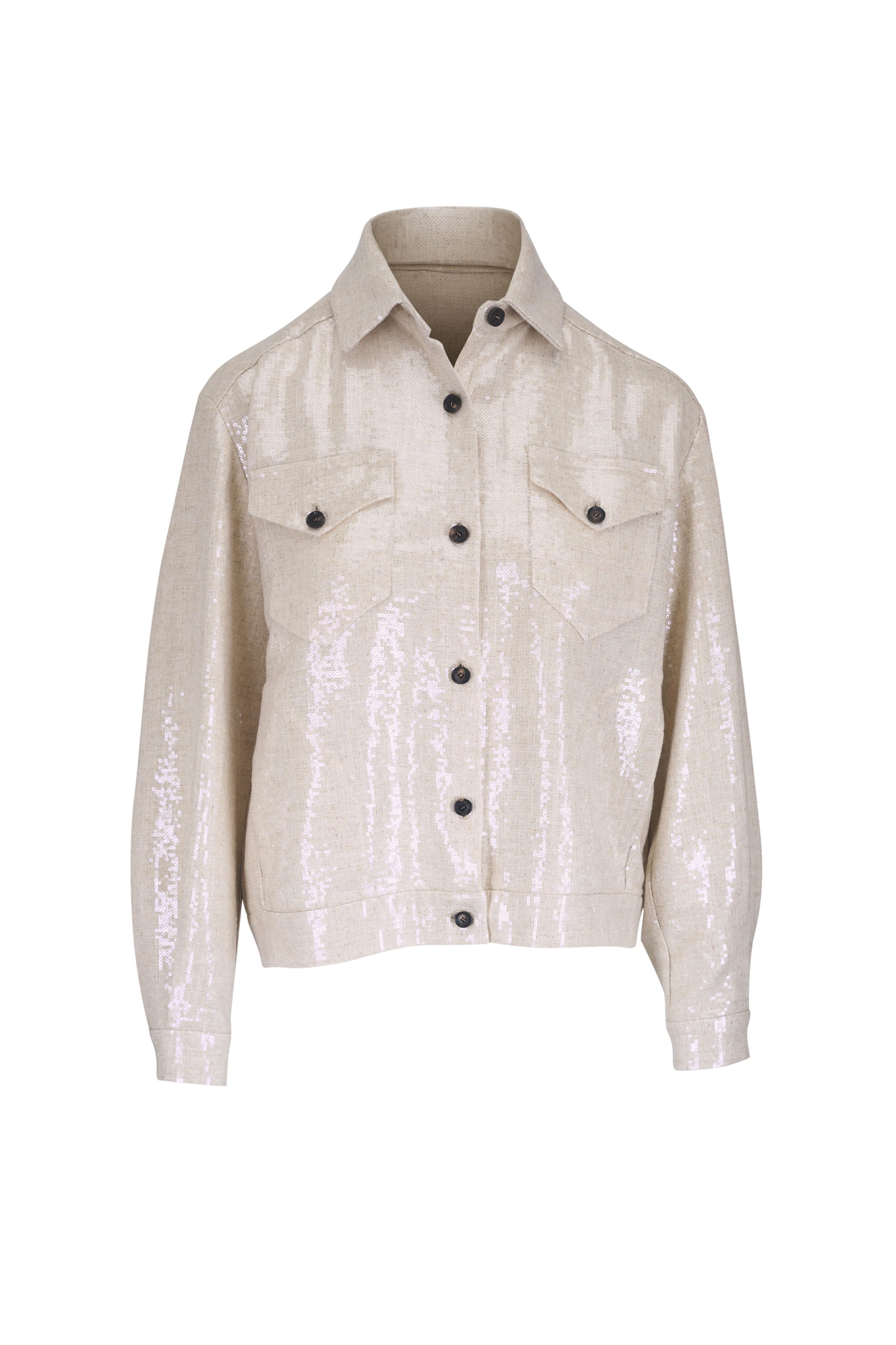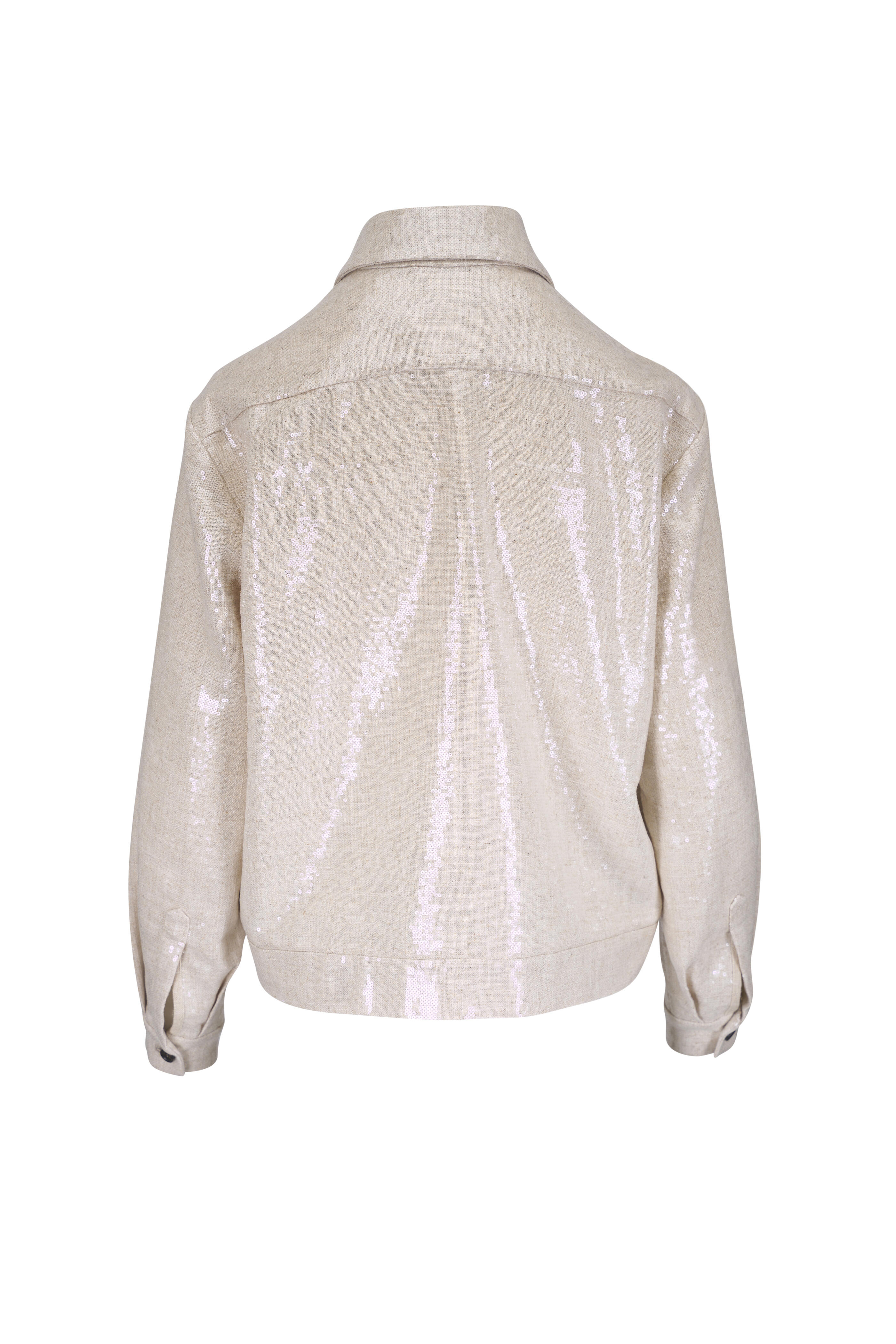 Spread collar. Front button placket. Lower side slip pockets; chest buttoned flap patch pockets. Single button cuffs. Made in Italy. Approx. 23" shoulder to hem (measurements from size 4). 70% viscose, 30% linen. Dry clean.