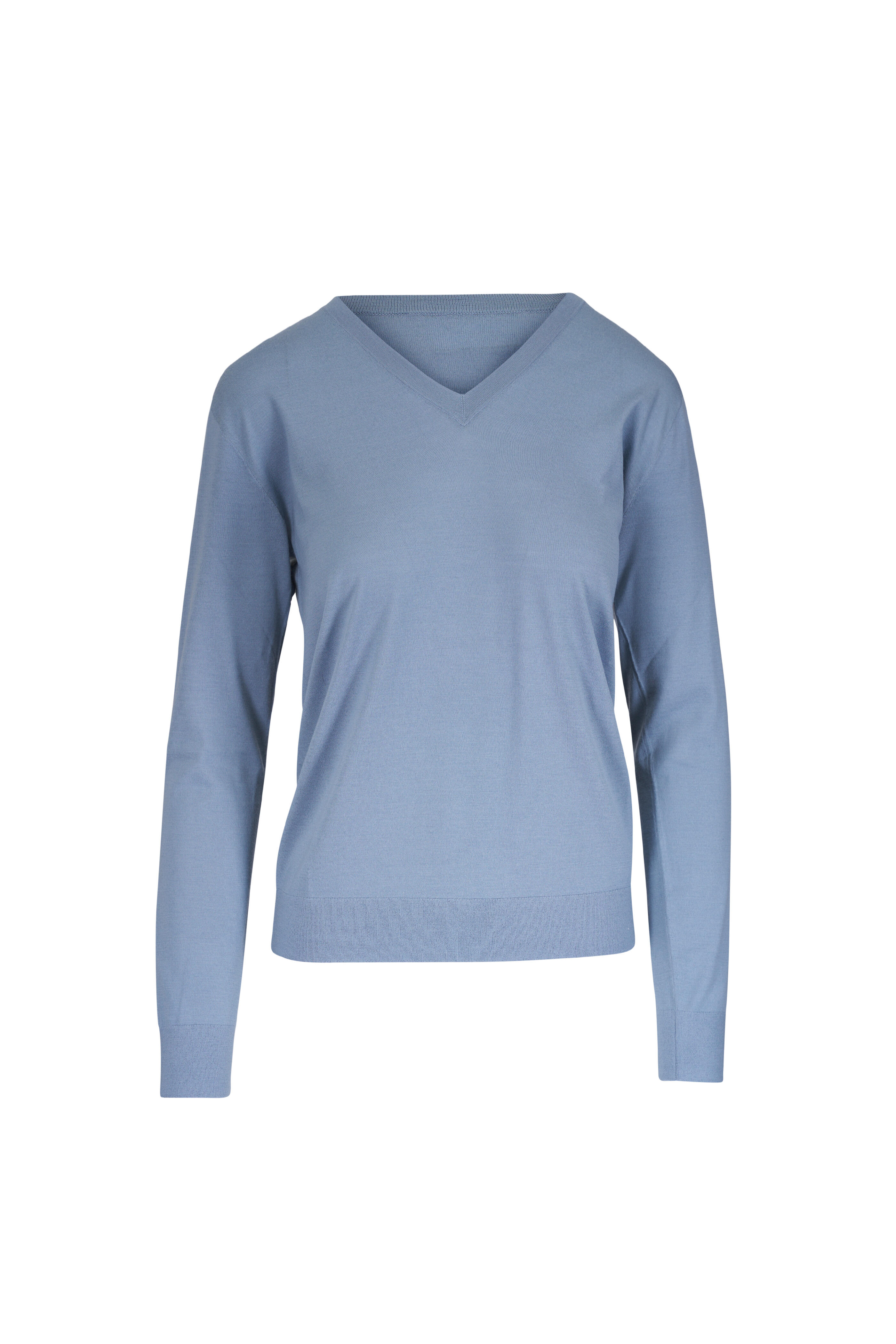 Wool blend. V neckline. Long sleeves. Ribbed cuffs and hem. Pullover style. Made in Italy. Loose fit. Dry clean.