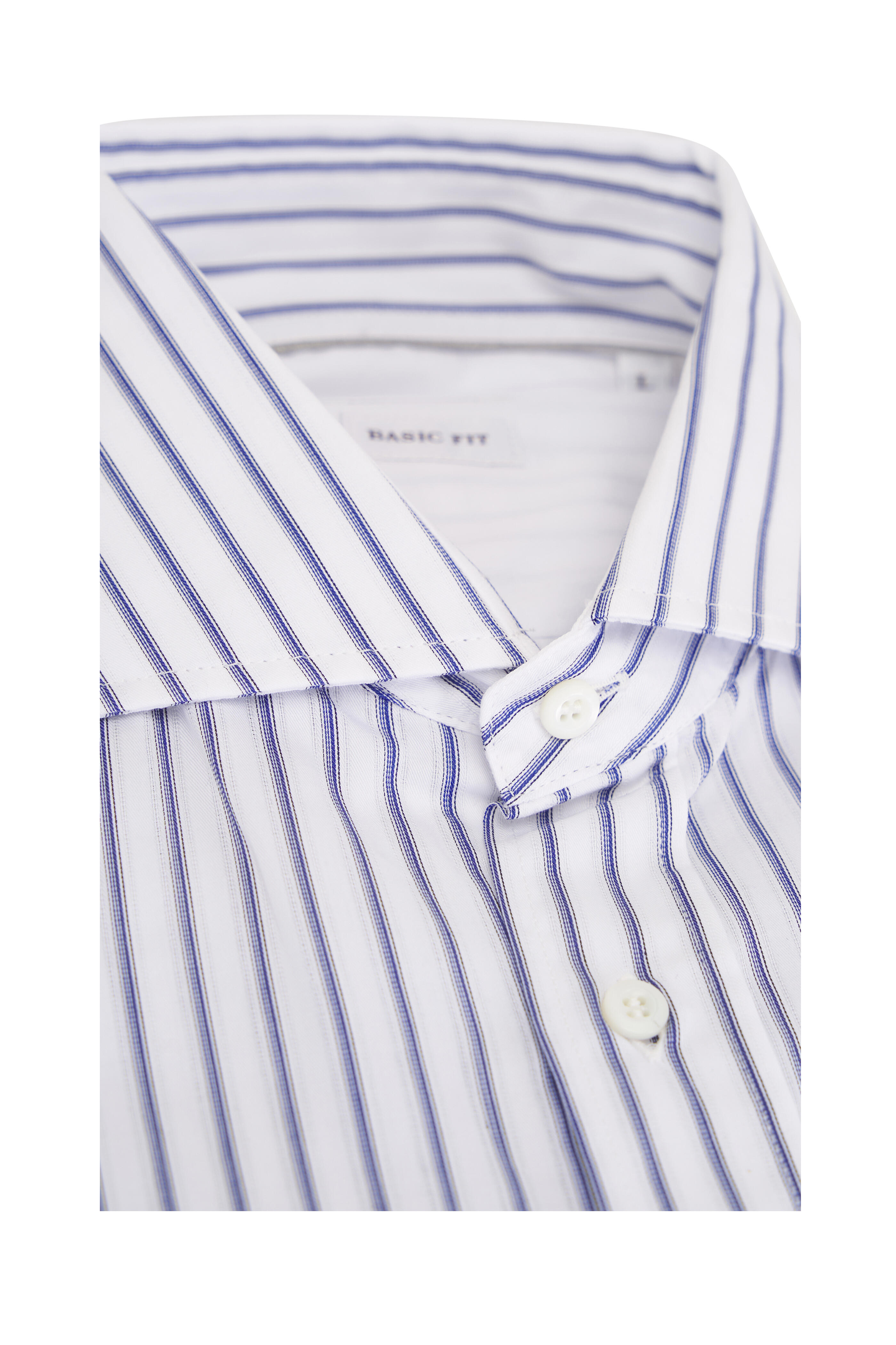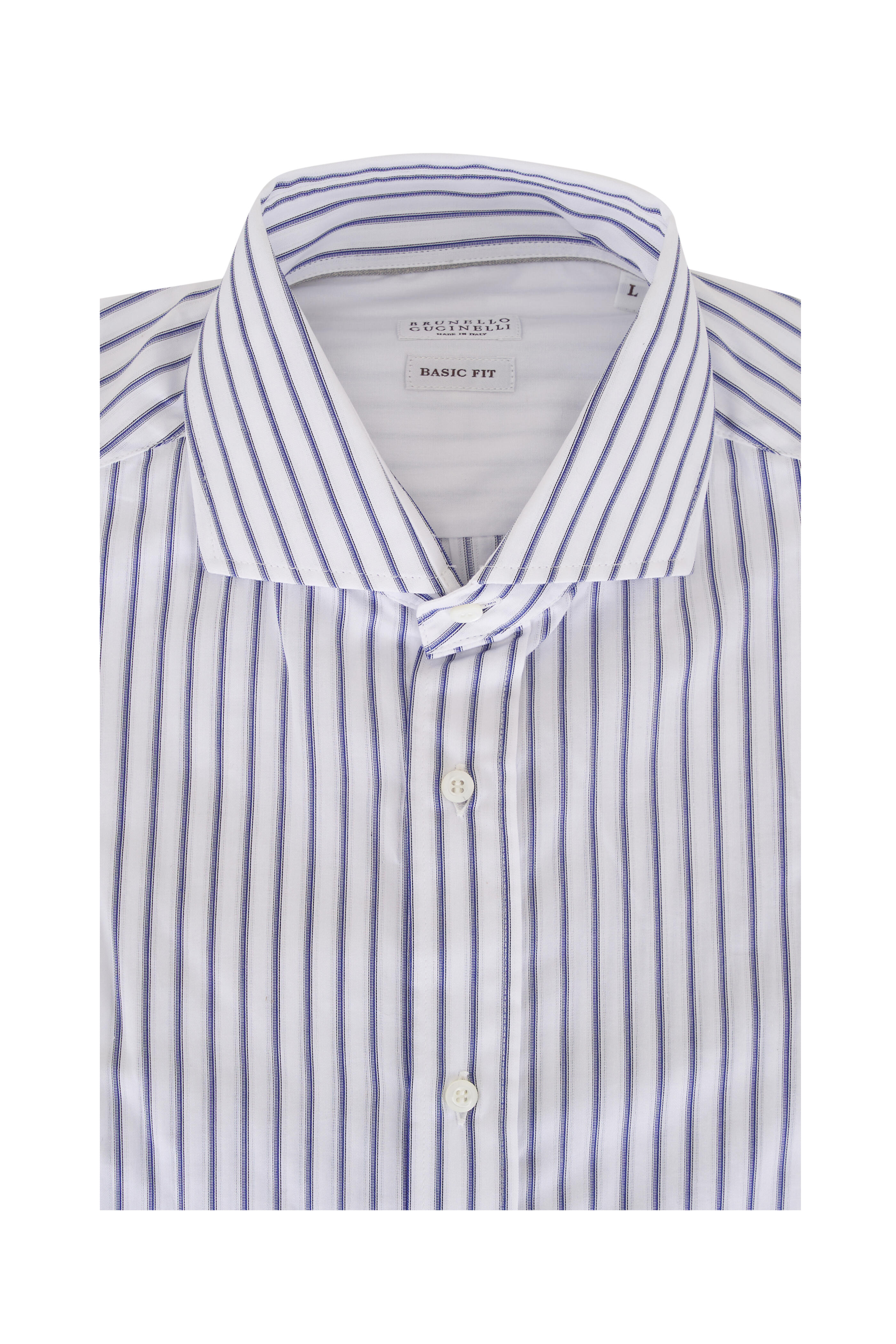 Spread collar. French front button placket. Single button rounded cuffs. Made in Italy. 100% cotton. Dry clean.