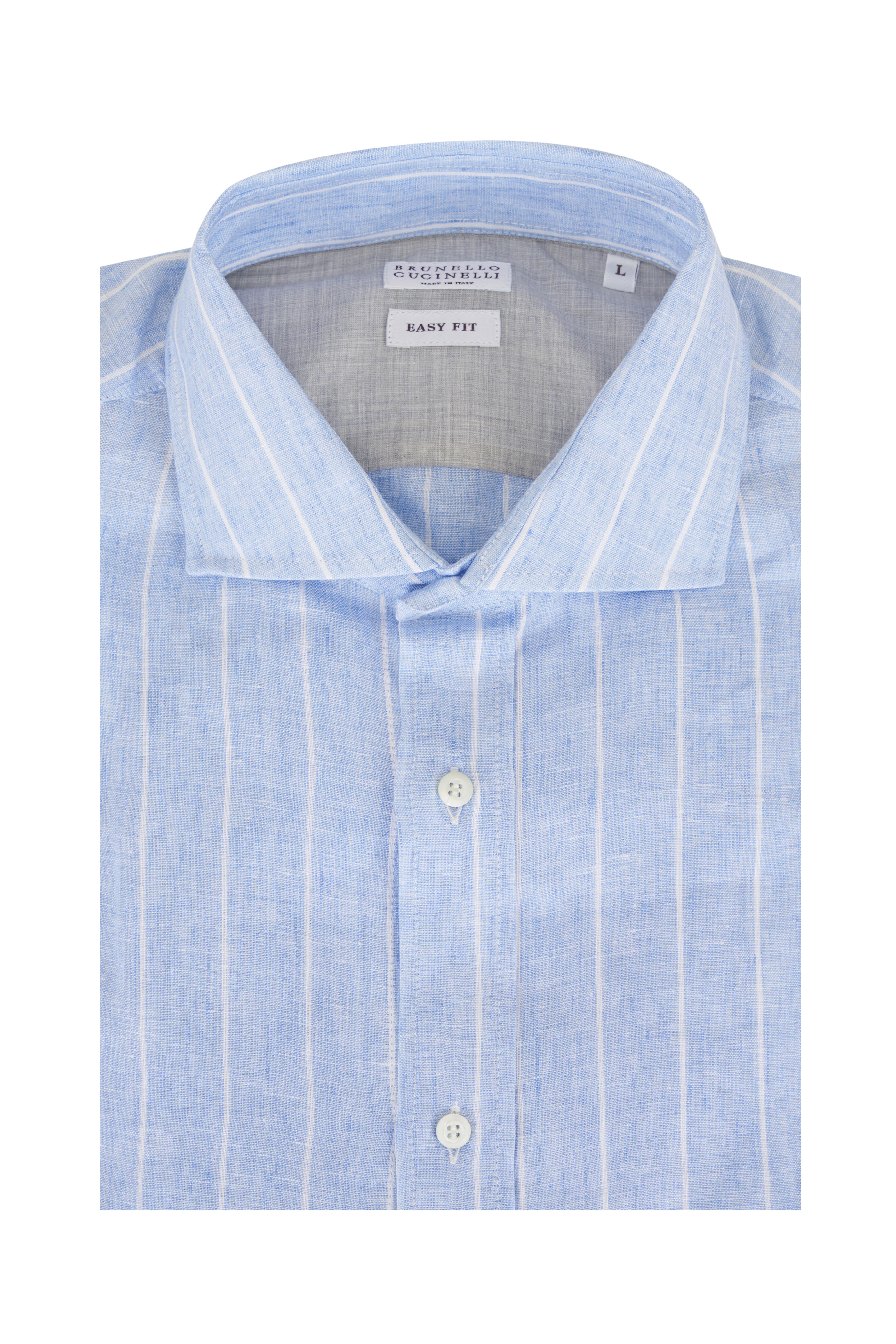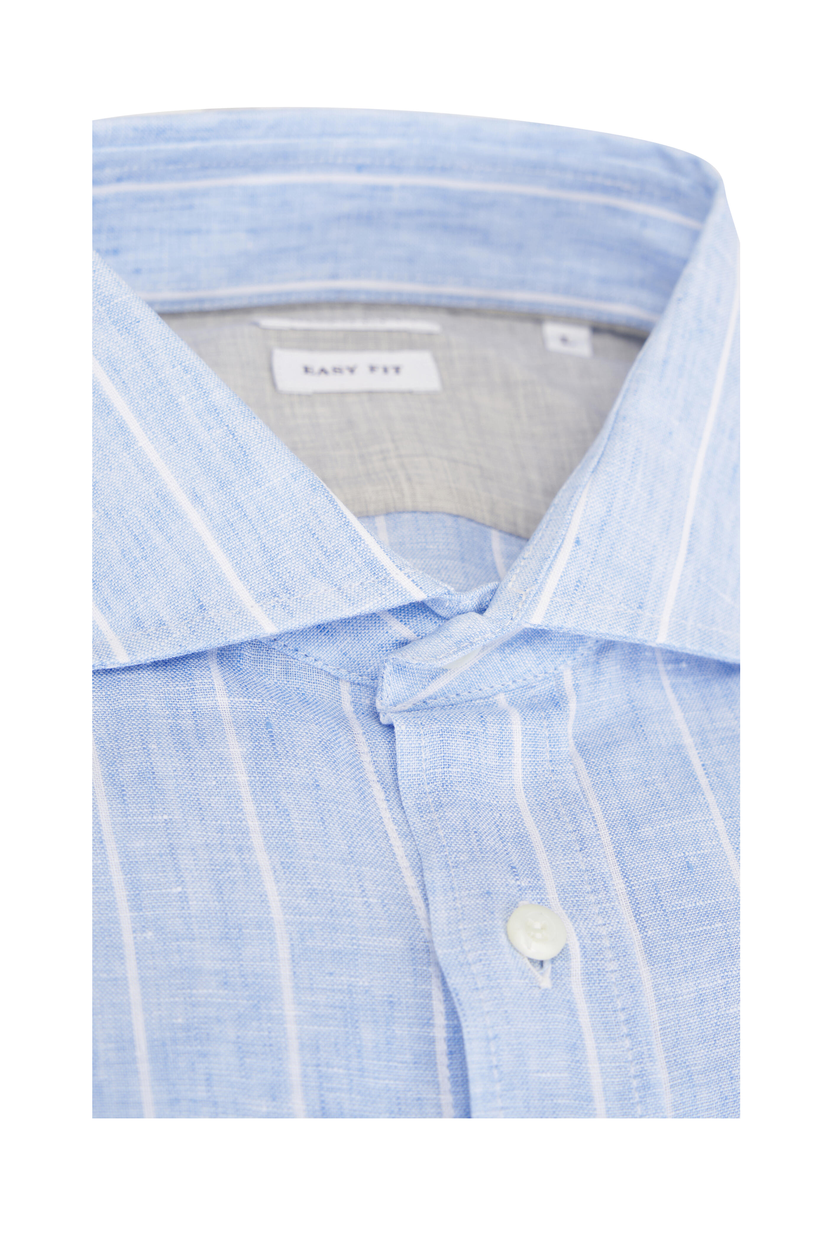 Spread collar. Front button placket. Single button barrel cuffs. Made in Italy. Easy fit. 100% linen. Machine wash.