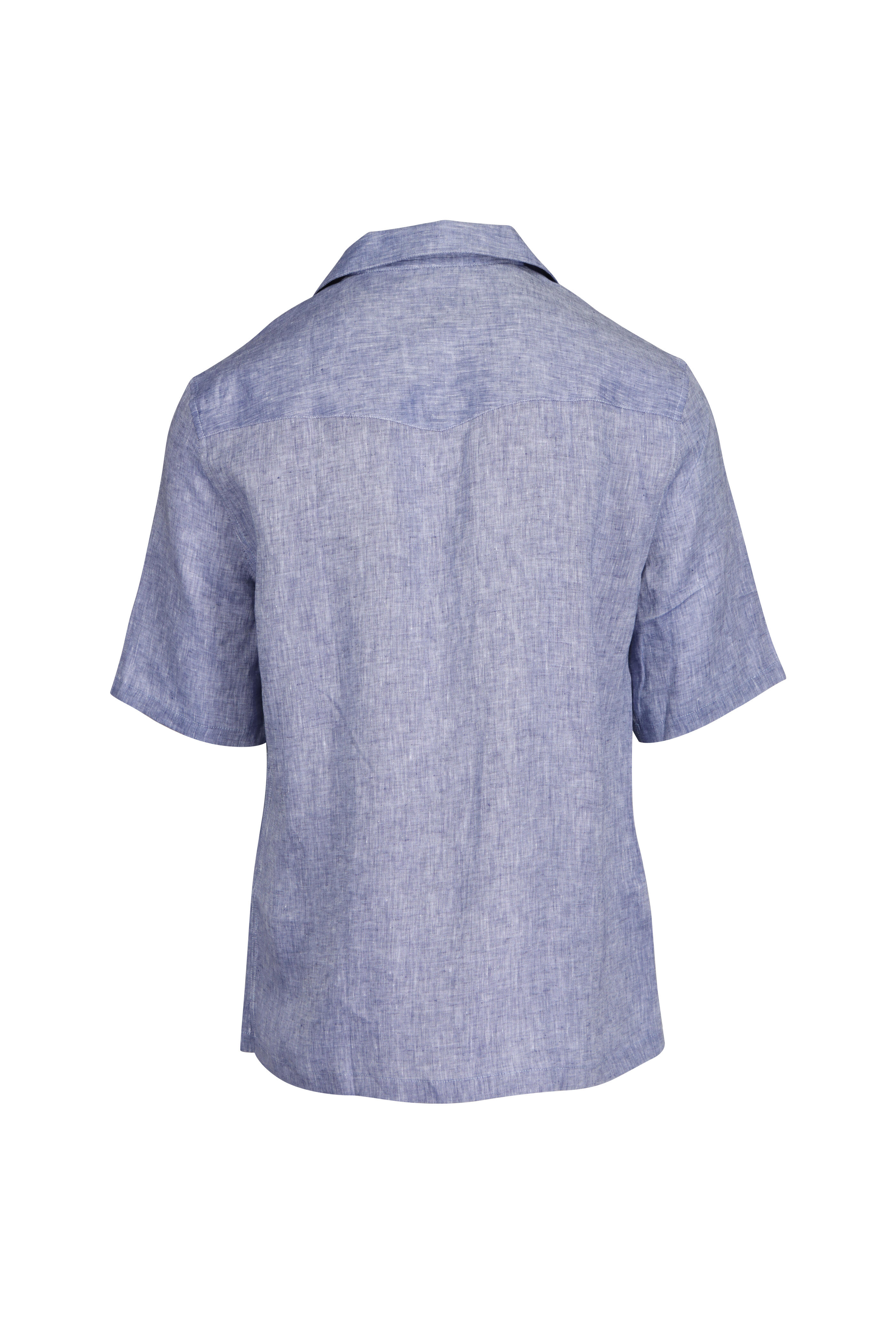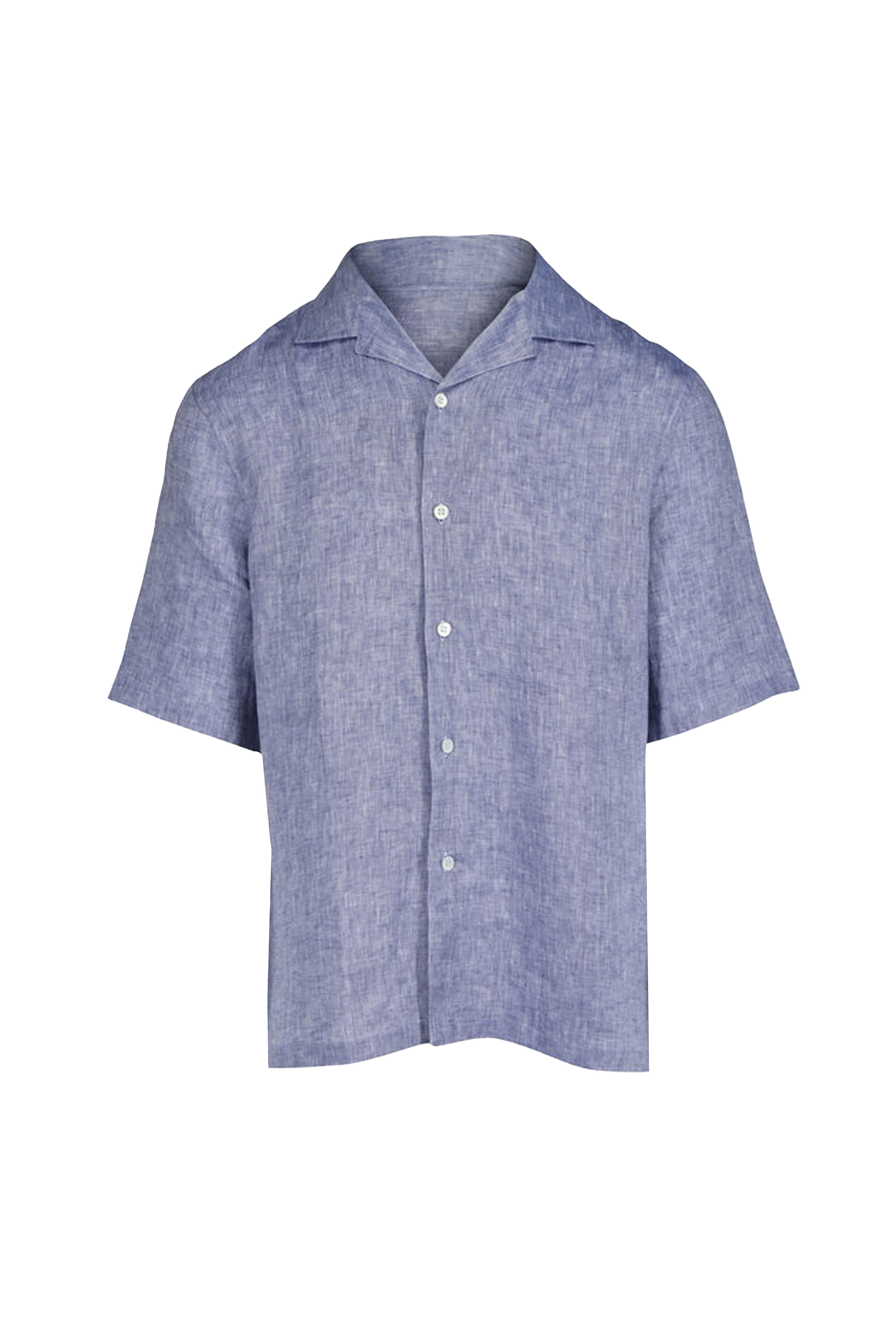 Spread collar. Front button placket. Straight hem. Made in Italy. 100% linen. Hand wash.