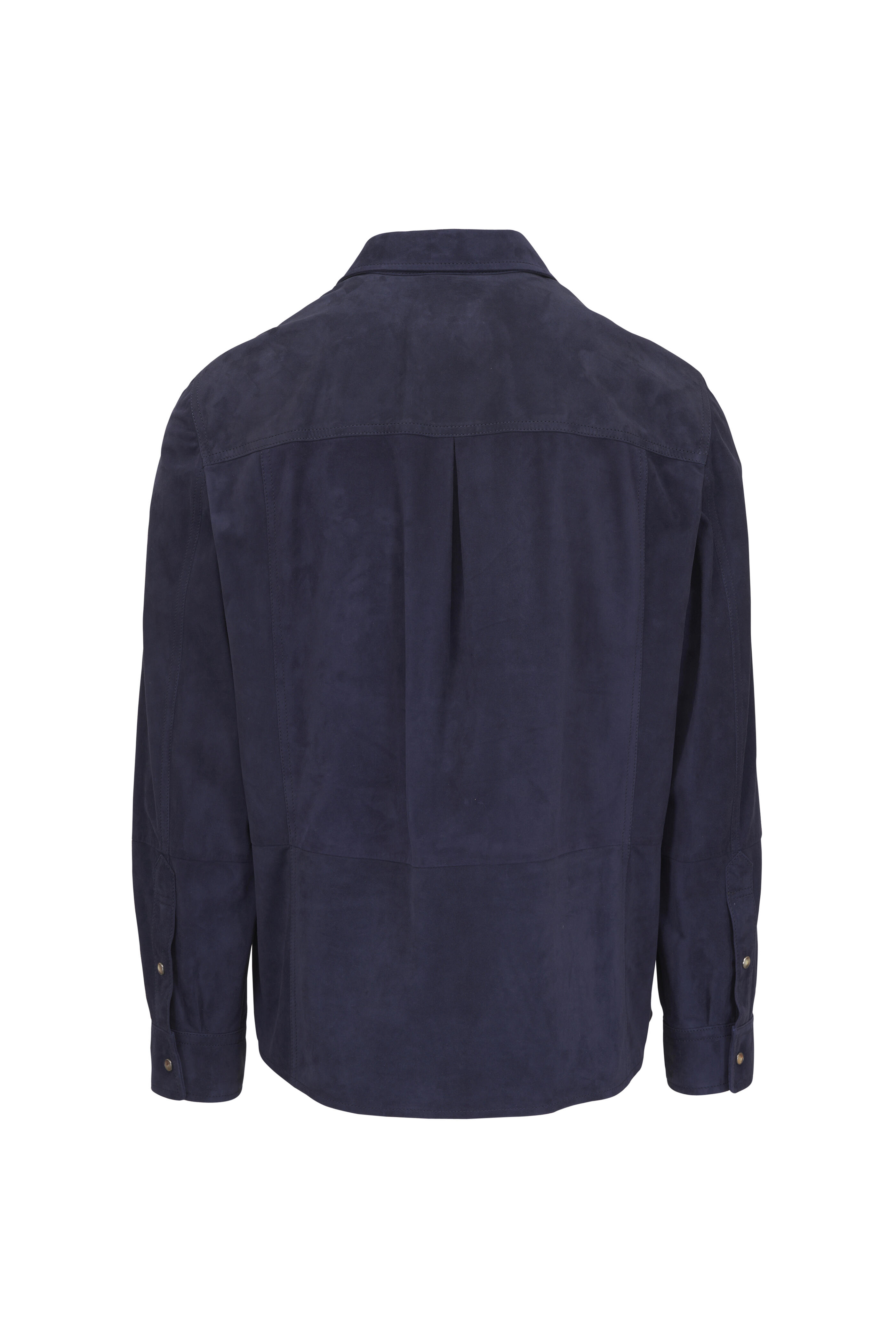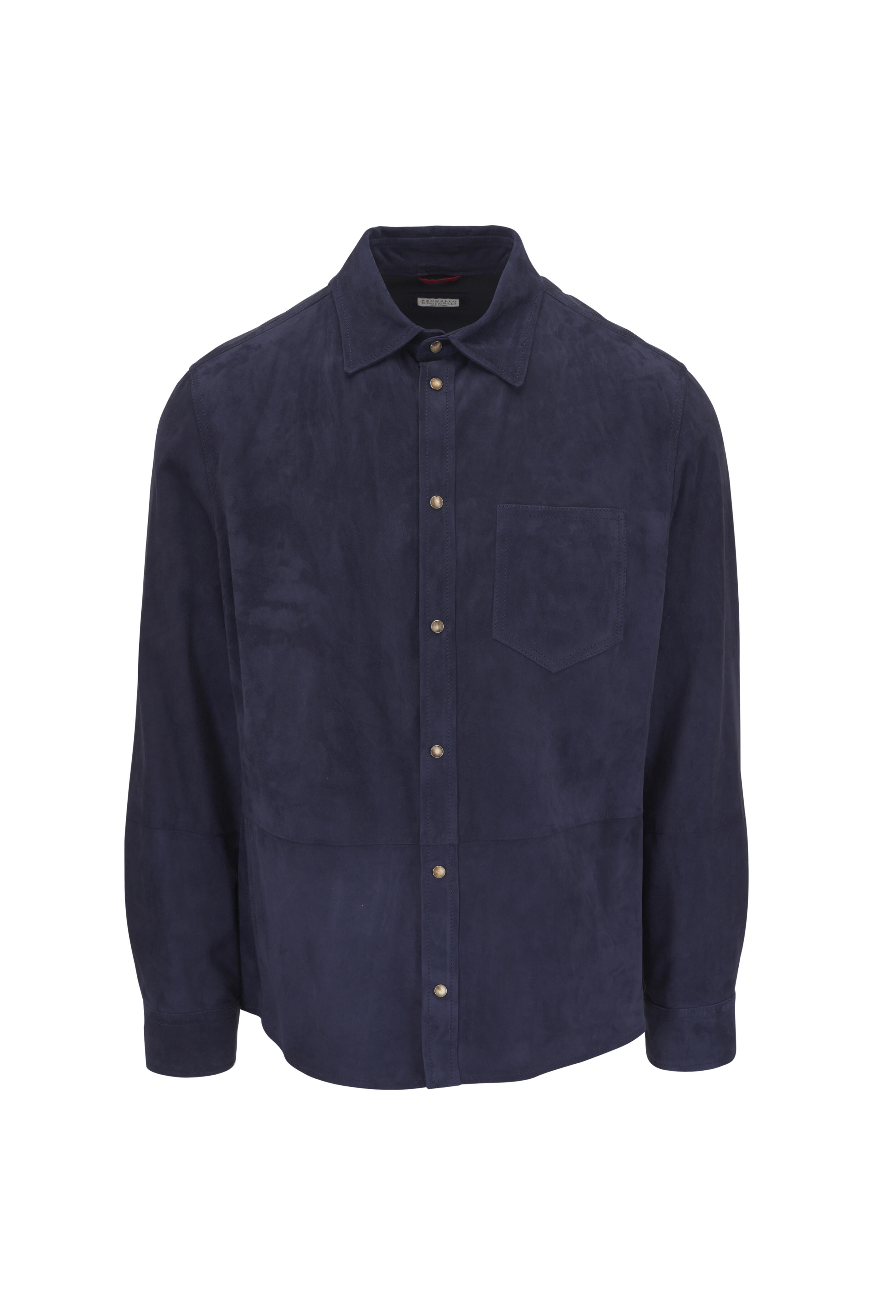 Spread collar. Snap front closure. Chest patch pocket. Long sleeves; snap button cuffs. Straight hem. Made in Italy. Shoulder to hem 28" (size XL R). 100% Leather. Dry clean.