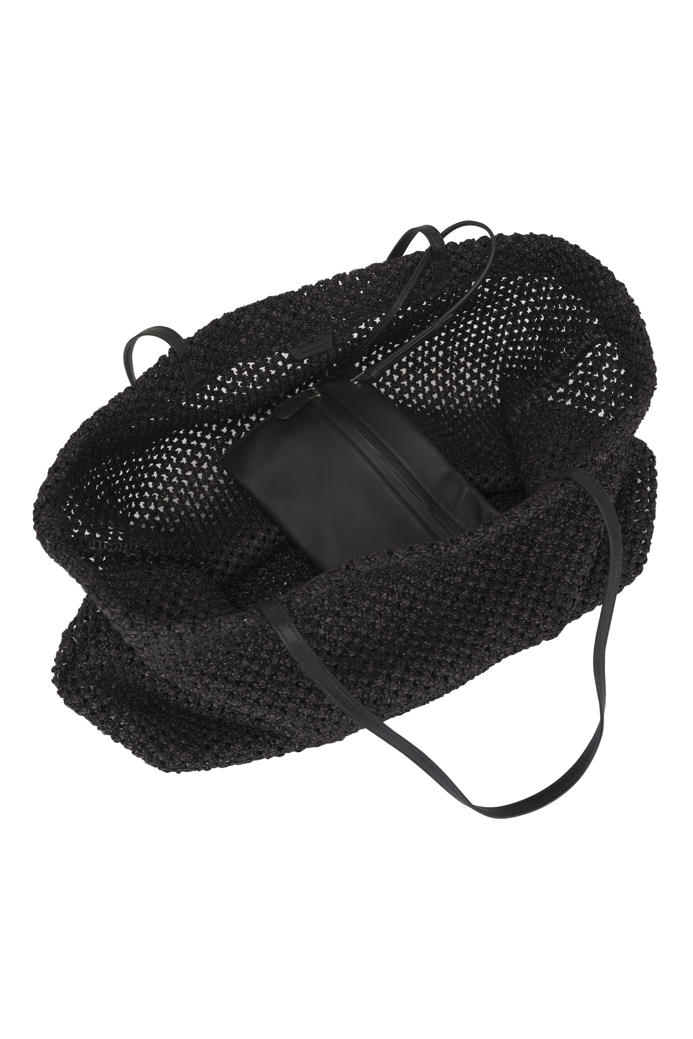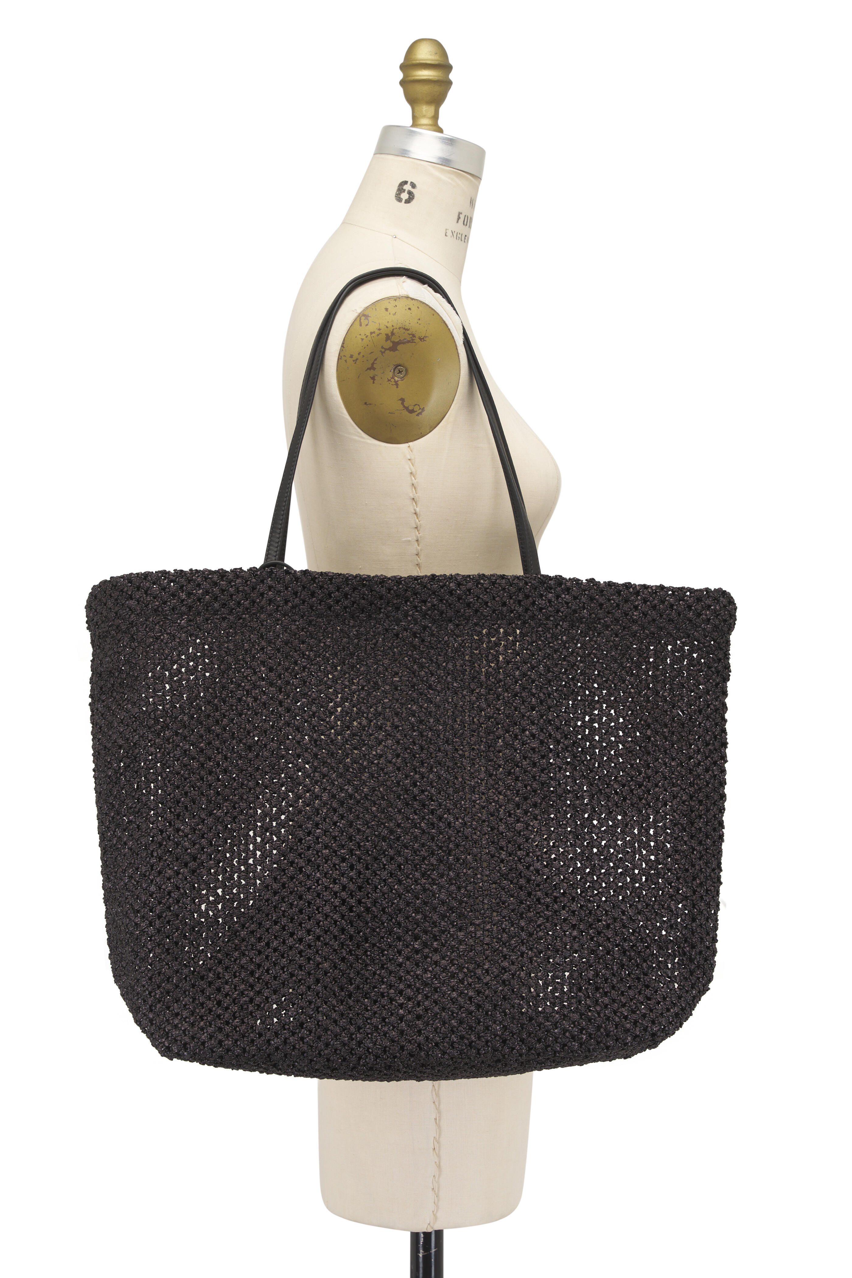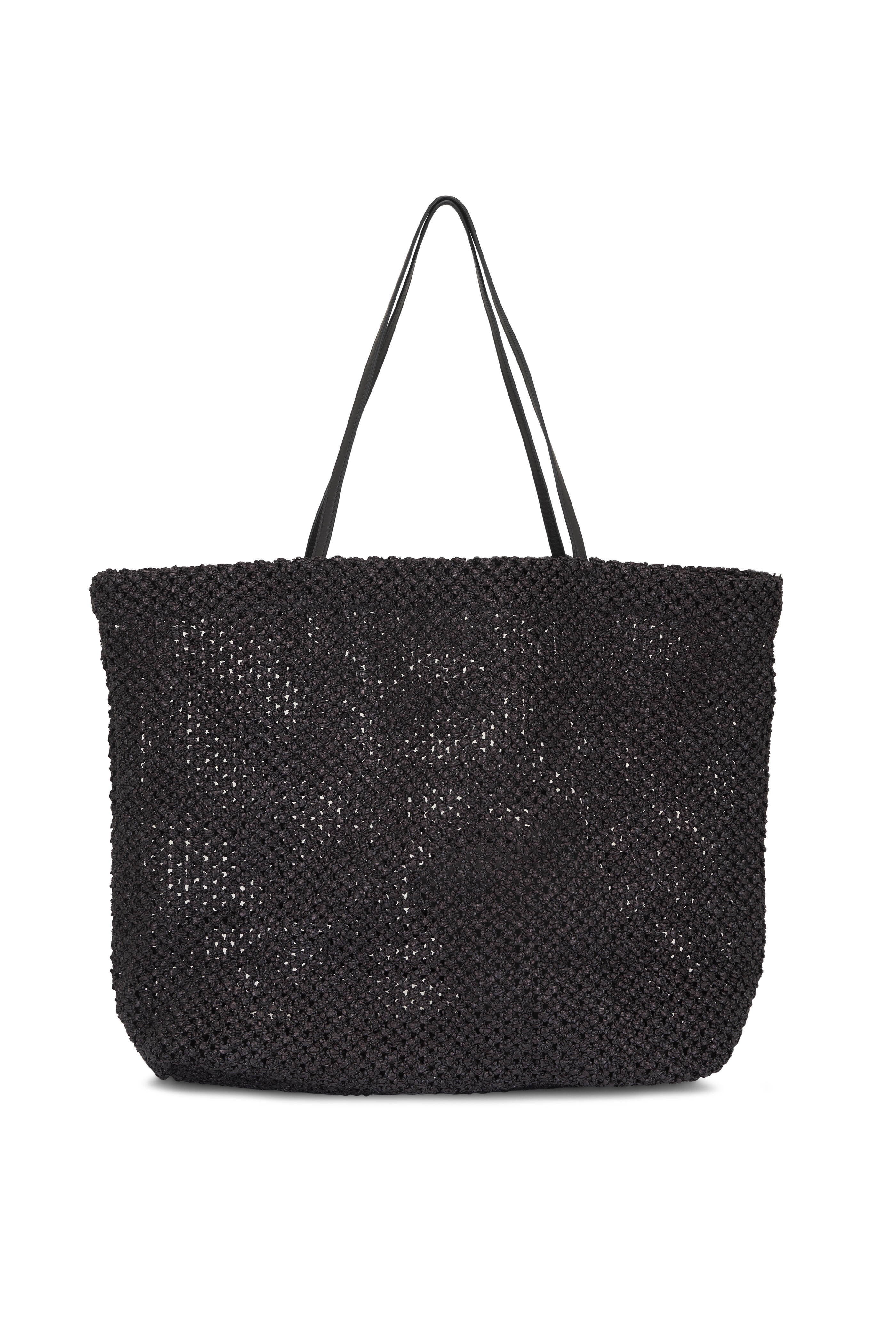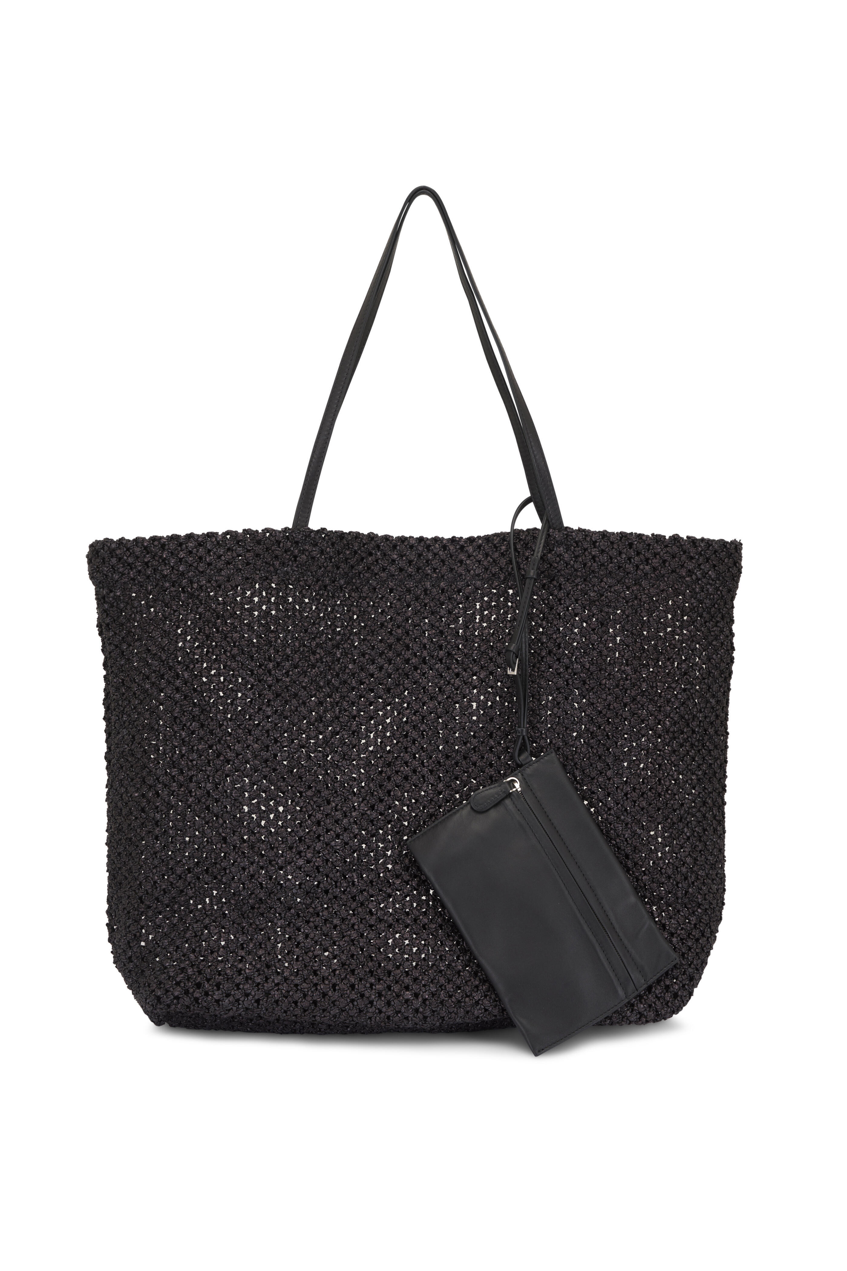 Raffia knit Outer; unlined. Dual top handles. Open top. Detachable pouch. Made in Italy. 14" width. 14" height. 6" depth. 10" strap drop. Clutch: 5" height. 7" width.