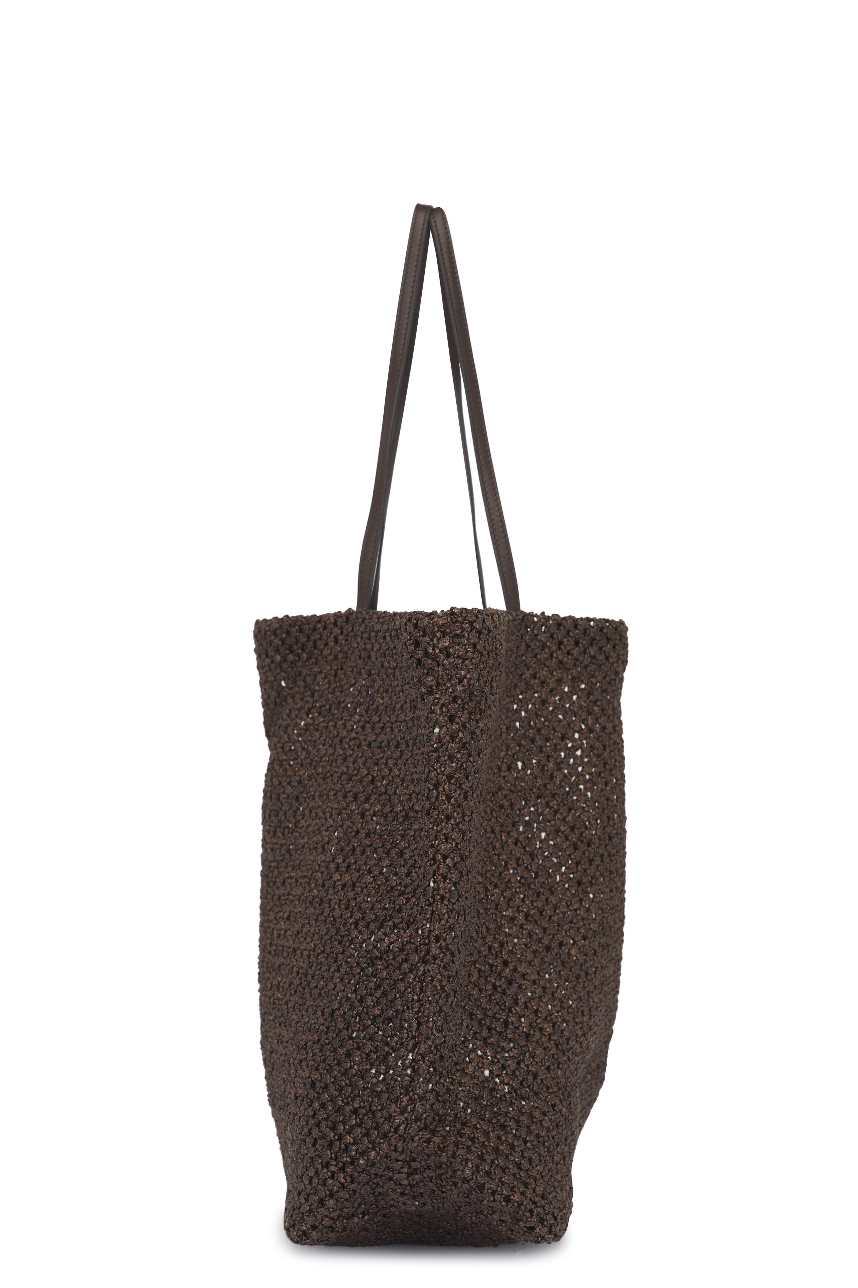 Nylon raffia. Dual leather top handles. Open top. Unlined. Made in Italy. 14.57 x 5.91 x 15.75 in.