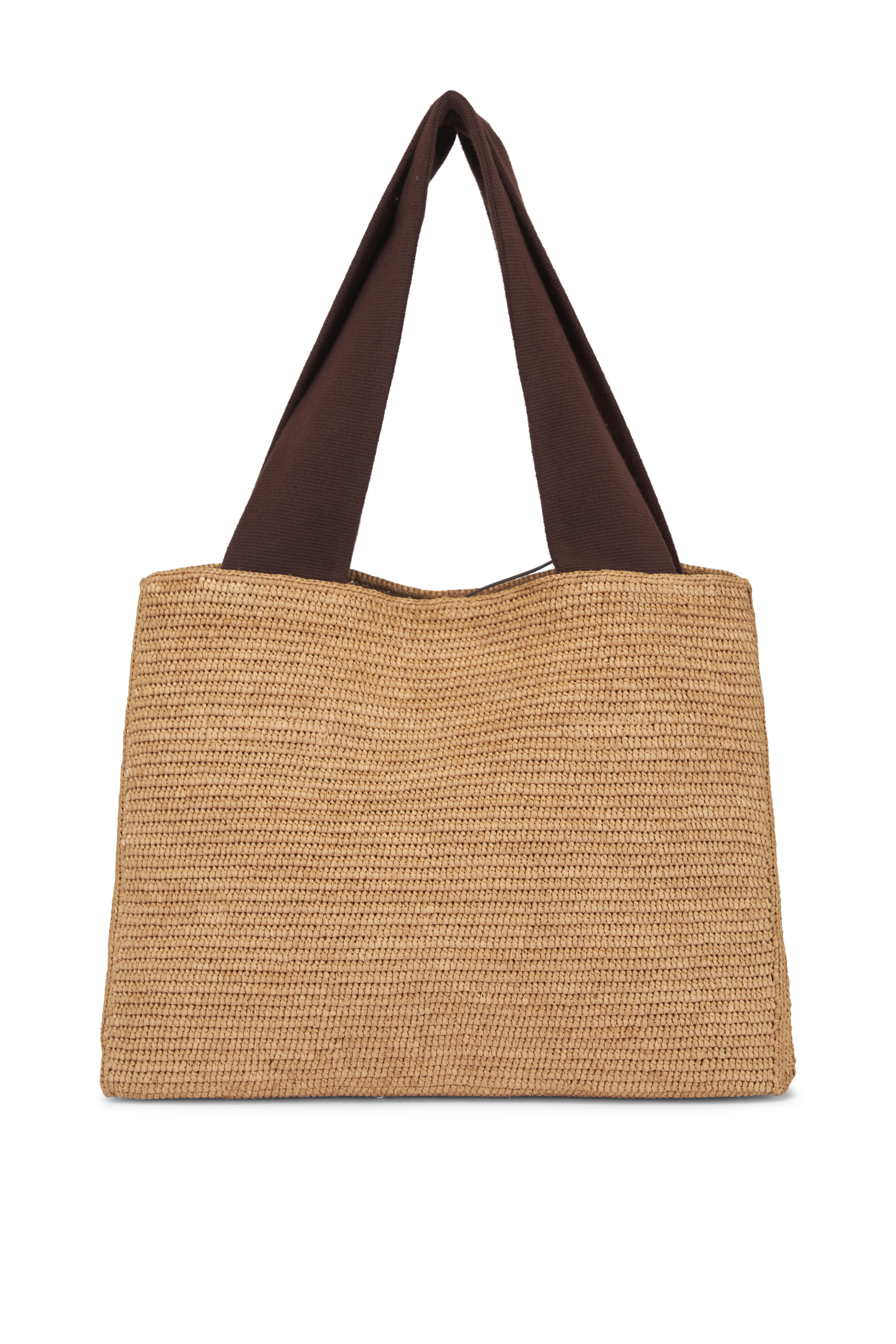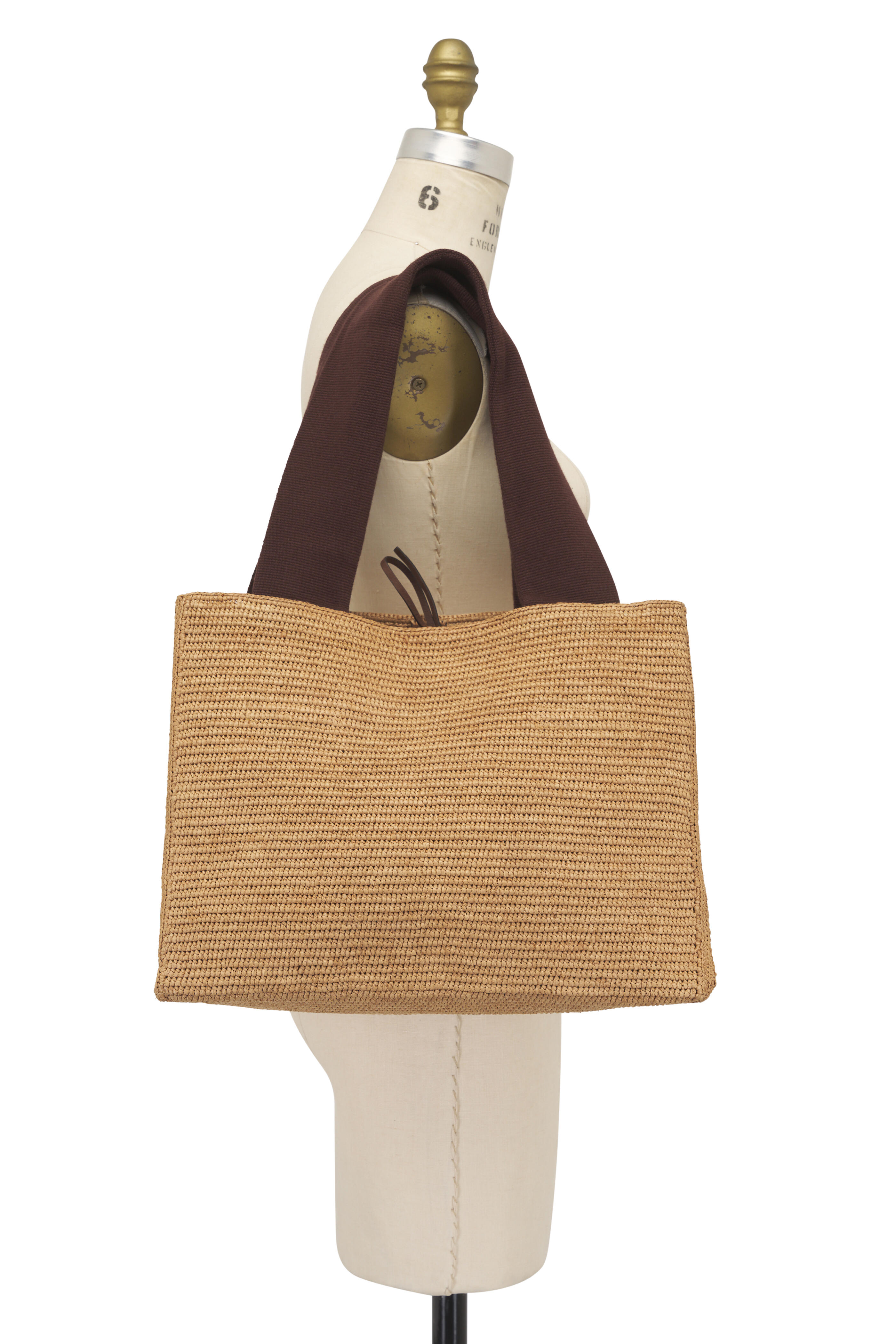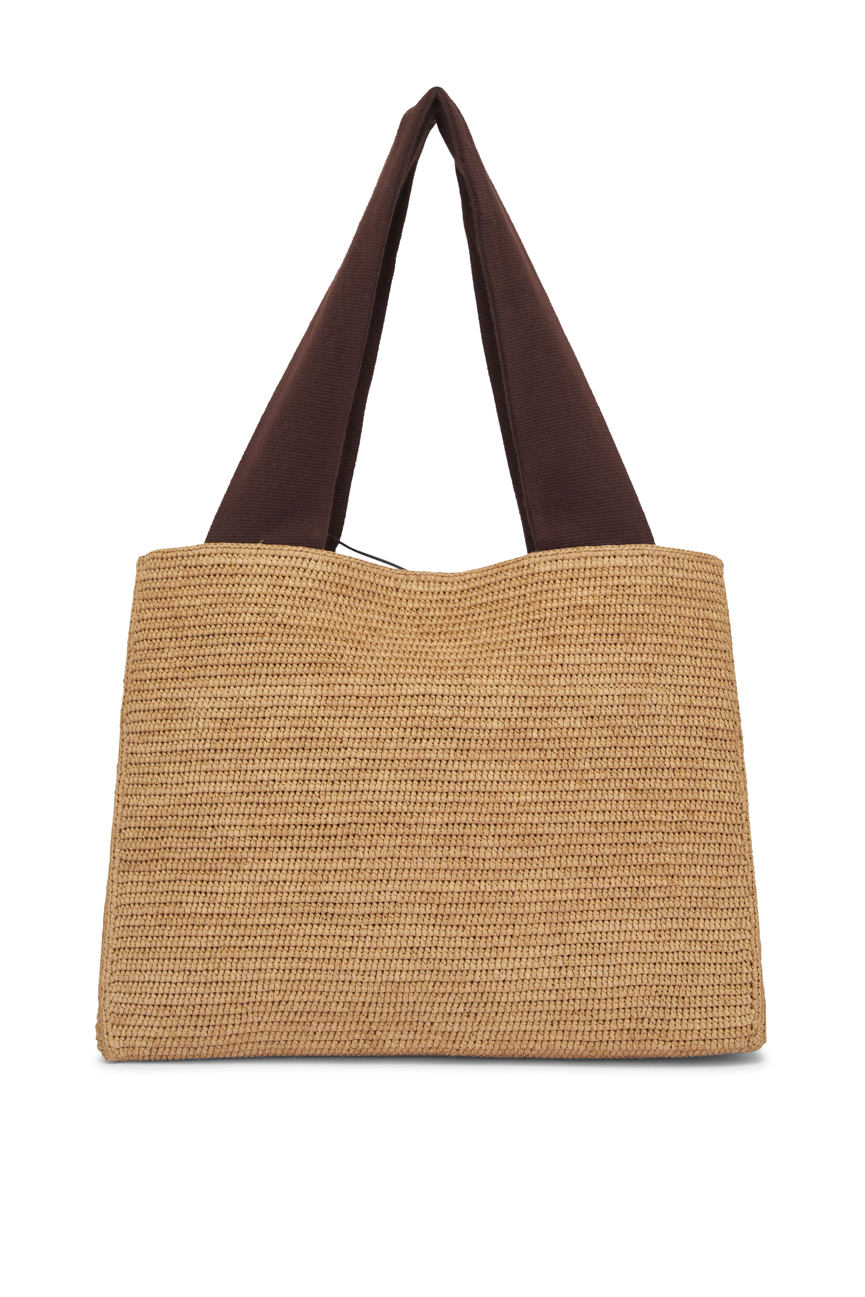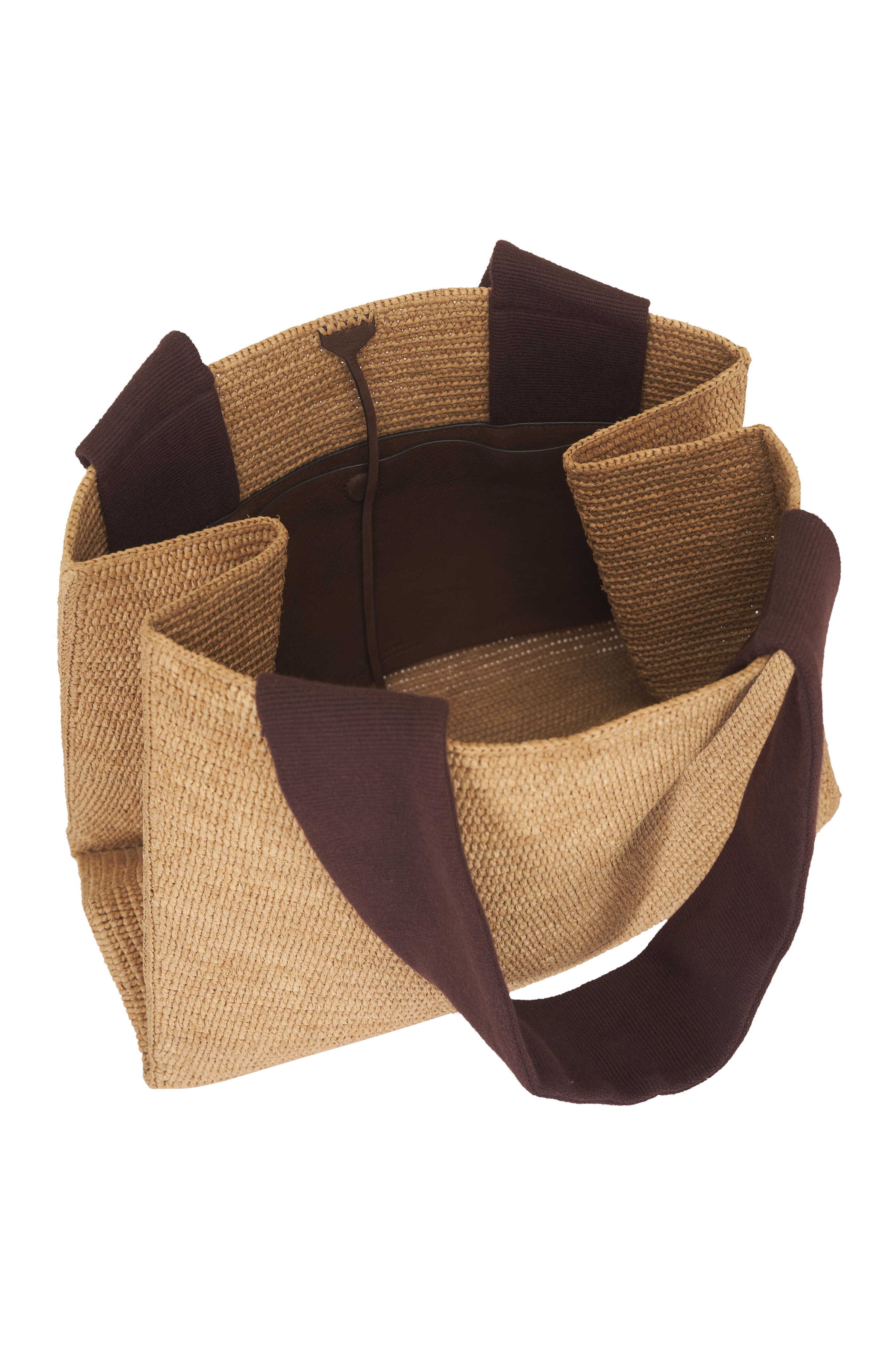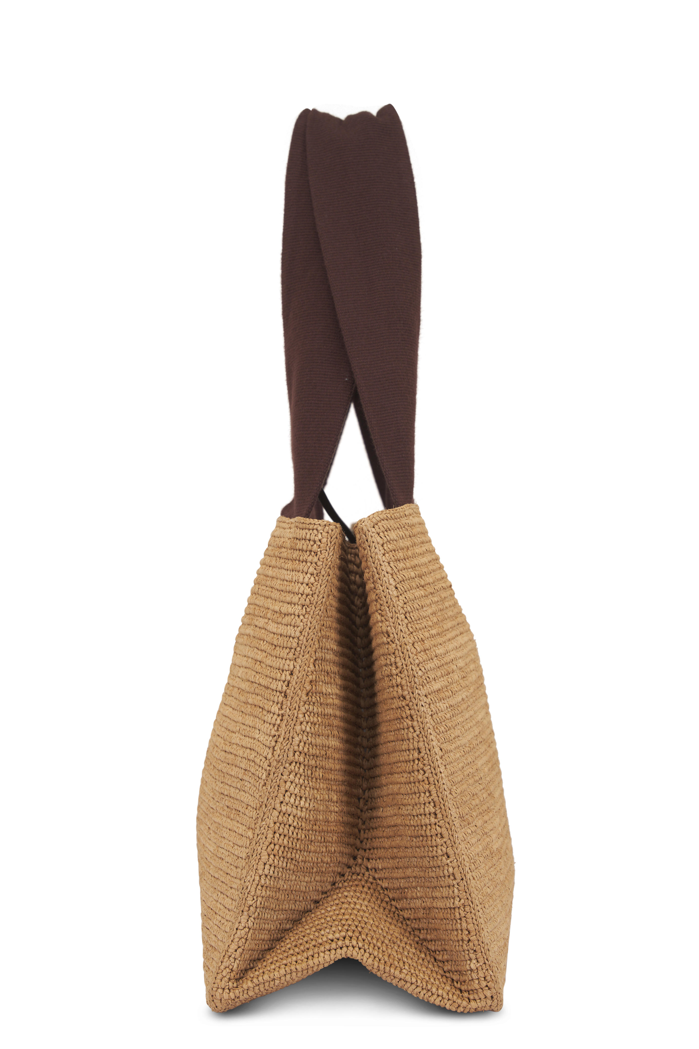 Top tie closure. Wide ribbon dual top handles. Interior patch pocket with magnetic closure. Folded construction. Made in Madagascar. 14.5" length. 10.5" height. 7" depth. 9" handle drop. 80% Raffia, 10% Calfskin Leather, 10% Cotton.