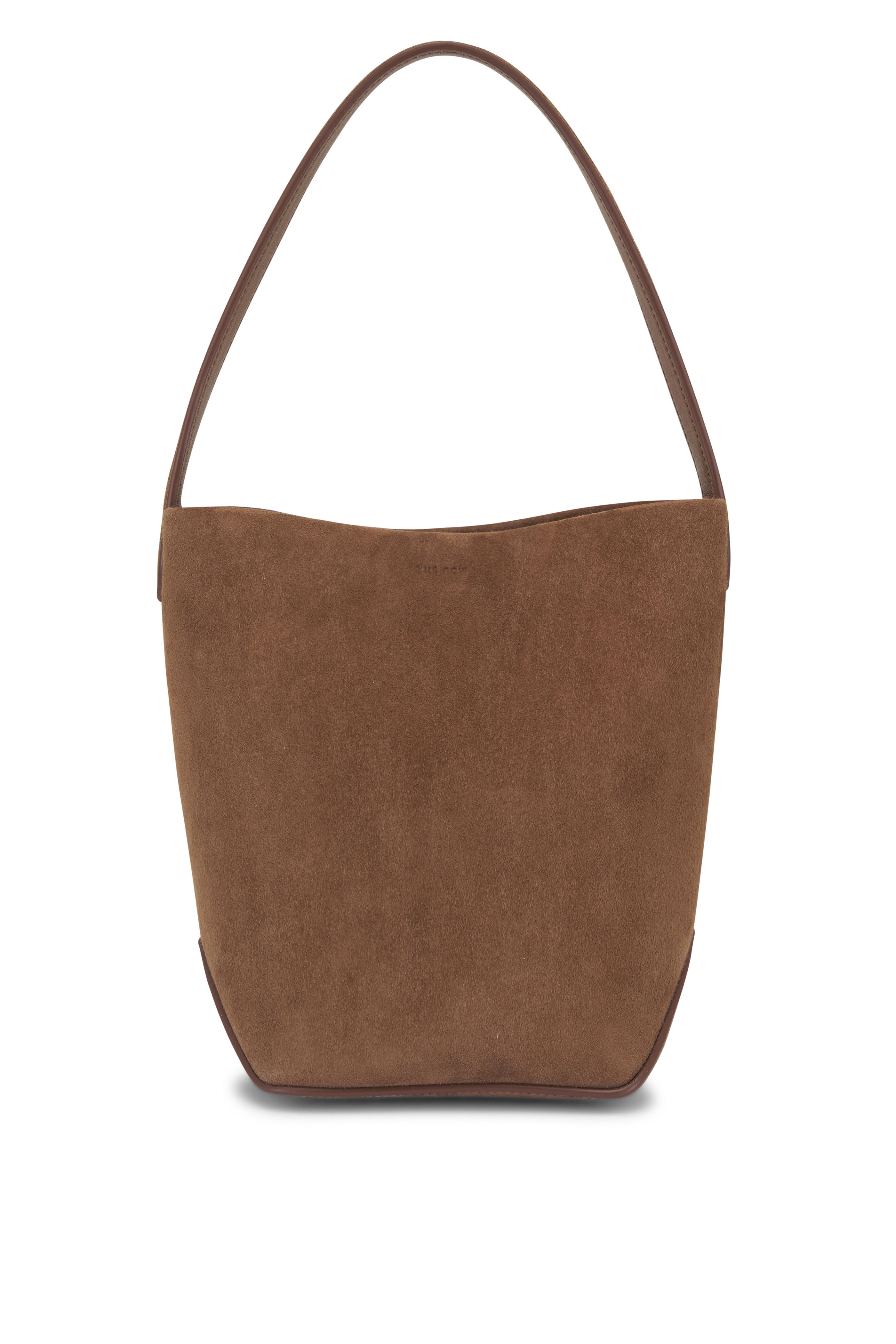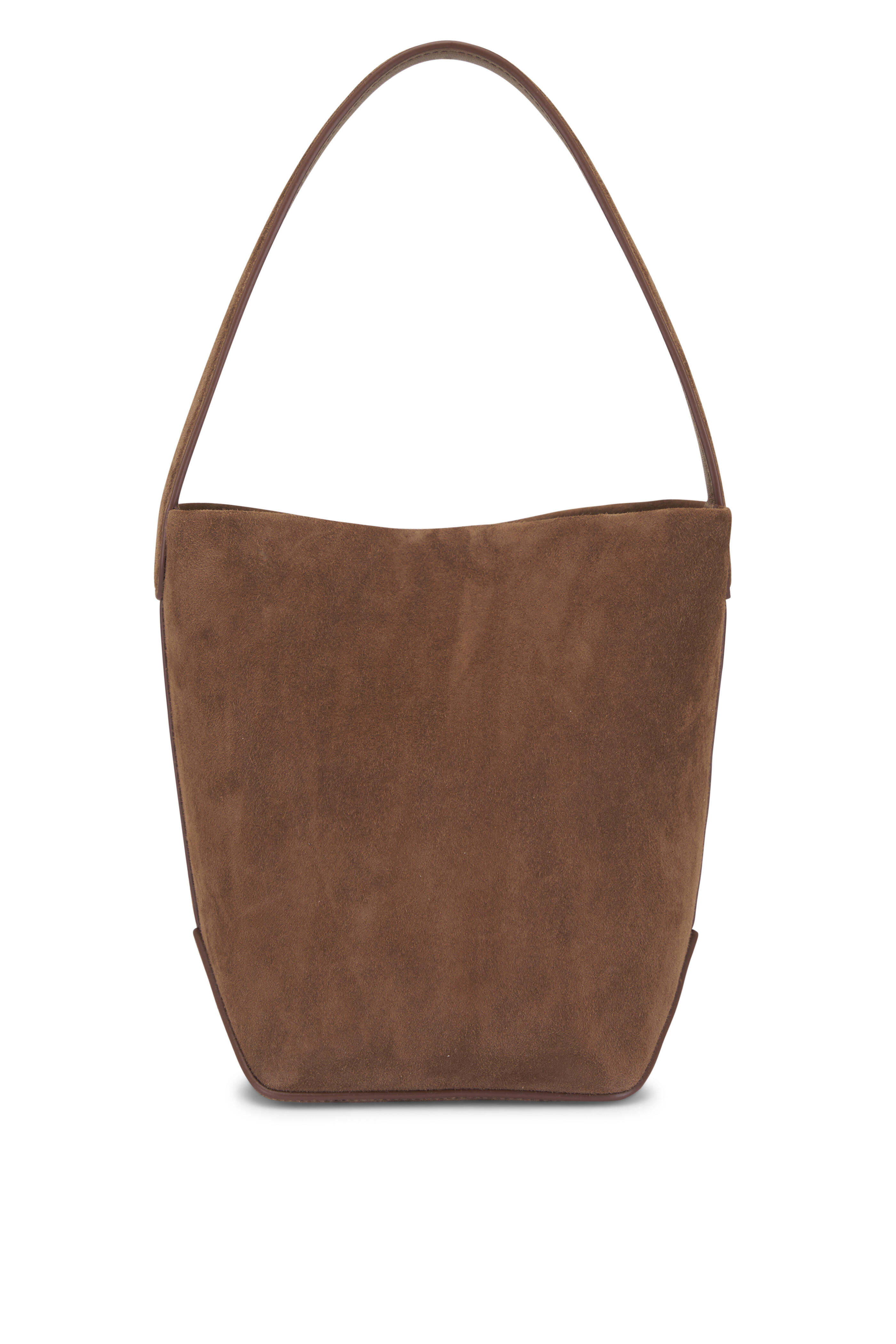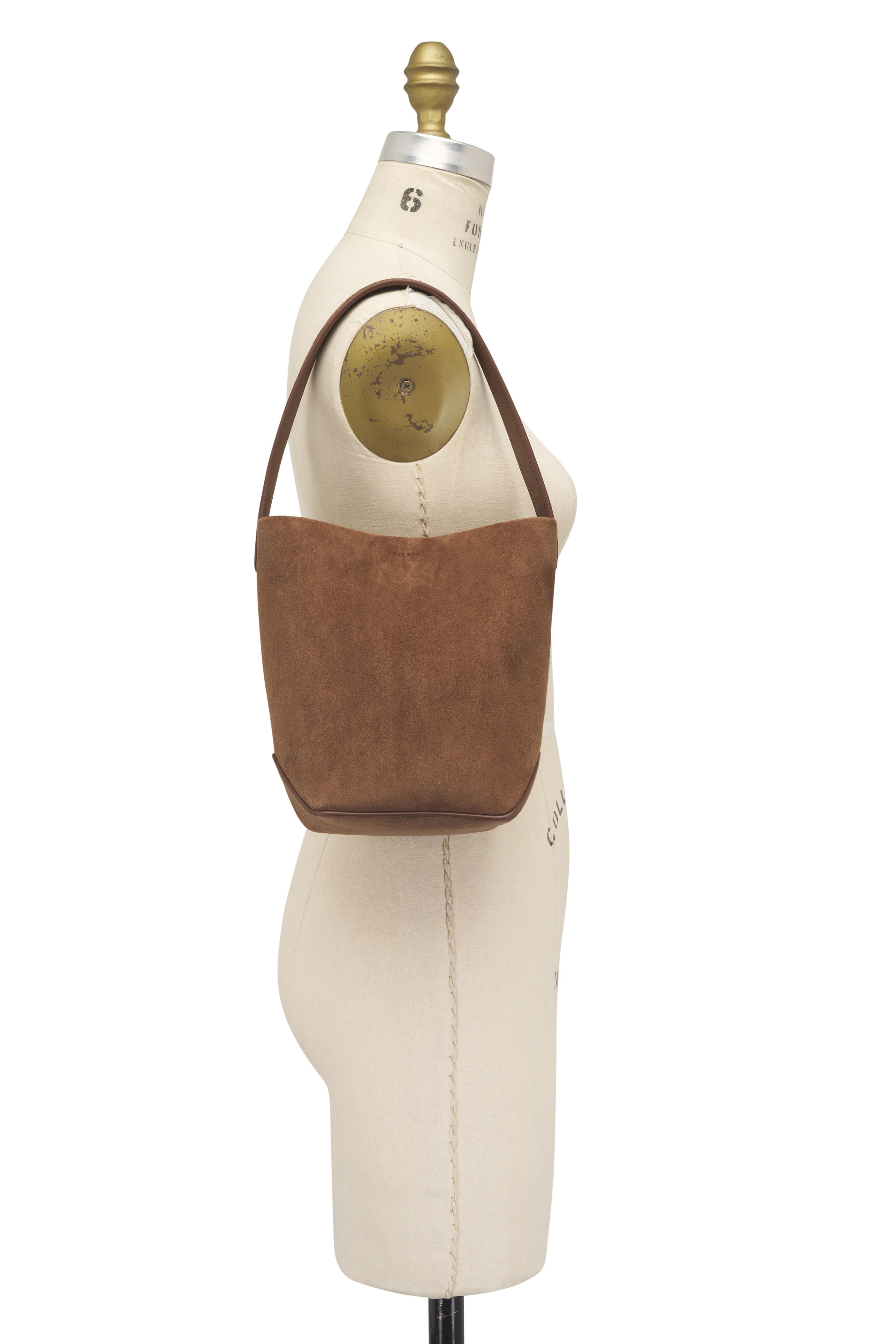 Suede. Single shoulder strap. Top toggle closure. Lambskin leather lining. Made in Italy. 5 x 5 x 8.75 in.. Handle: 7 in. drop.