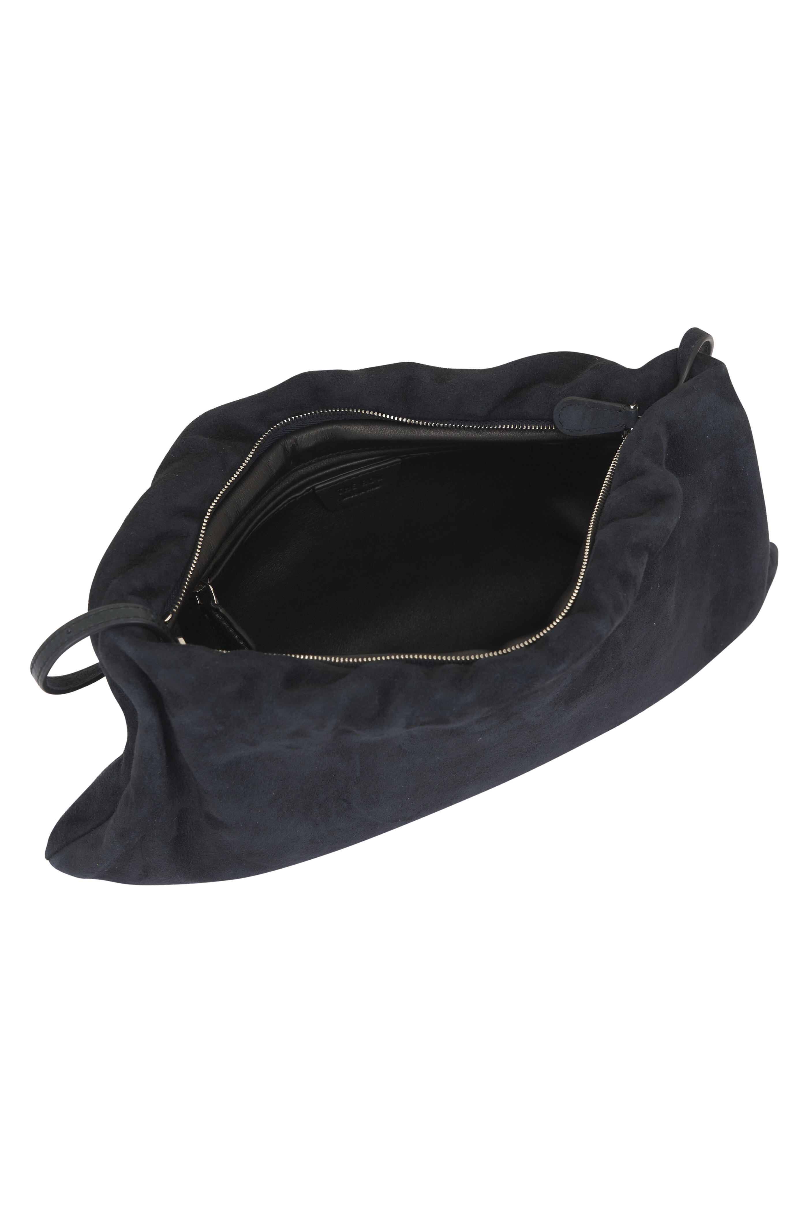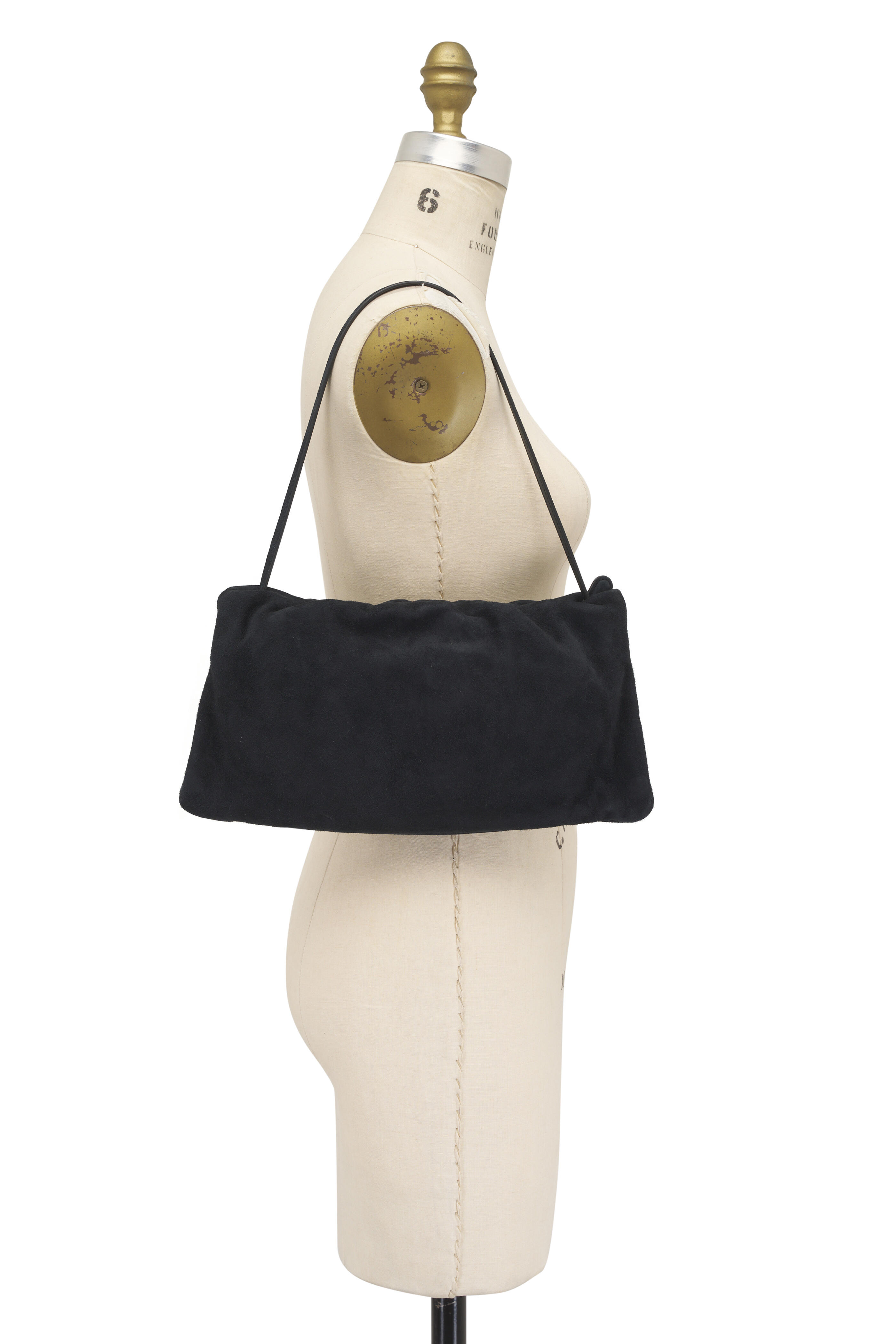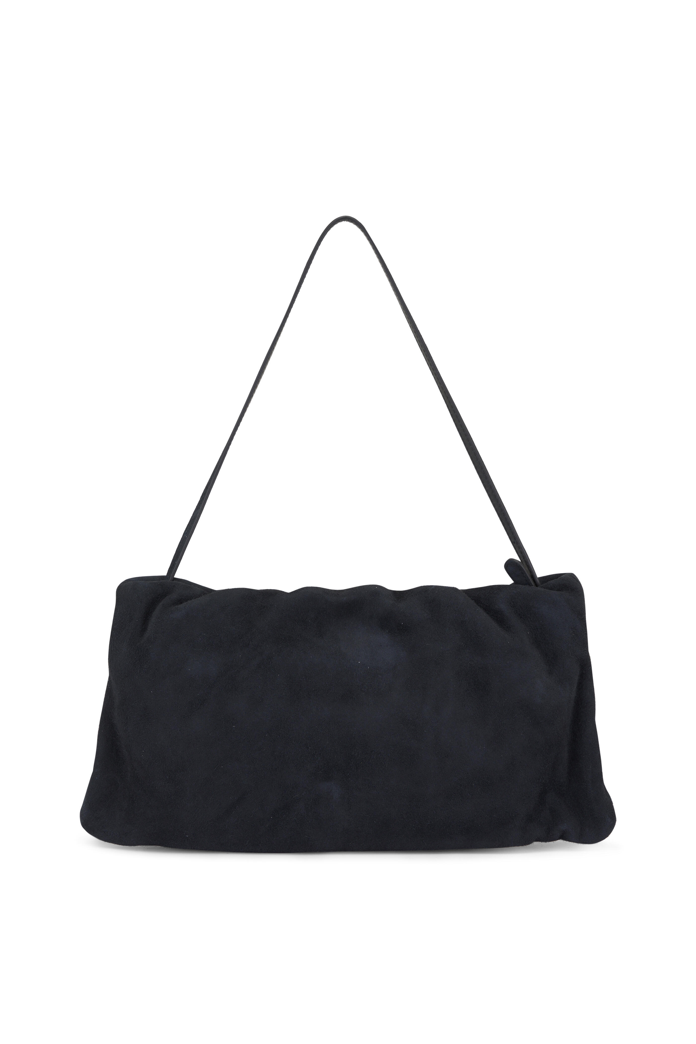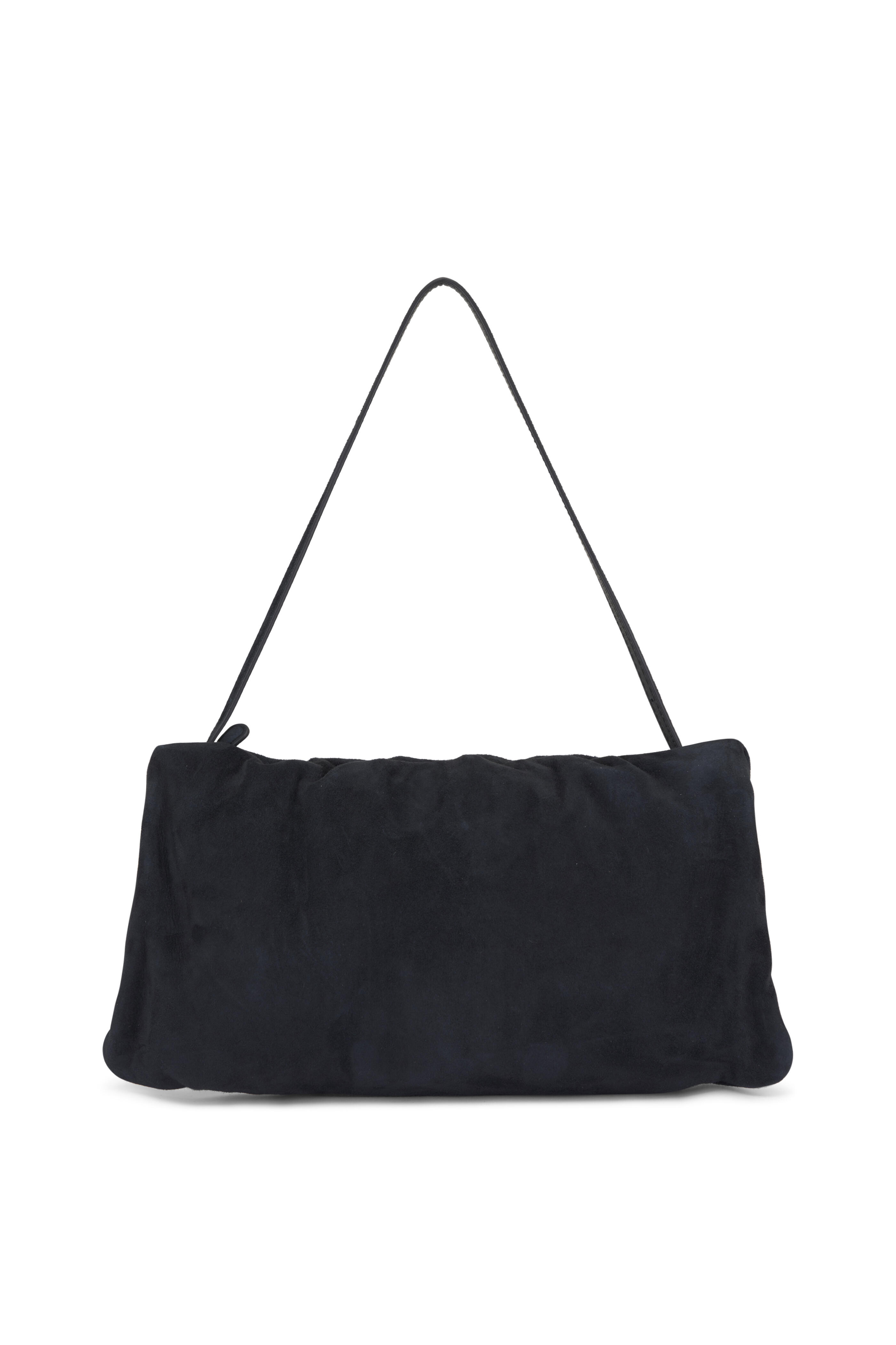 Suede. Top zip closure. Single shoulder strap. Interior zip pocket. Leather lining. Made in Italy. Height: 7". Width: 13.5". Depth: 1". Length shoulder strap: 10".