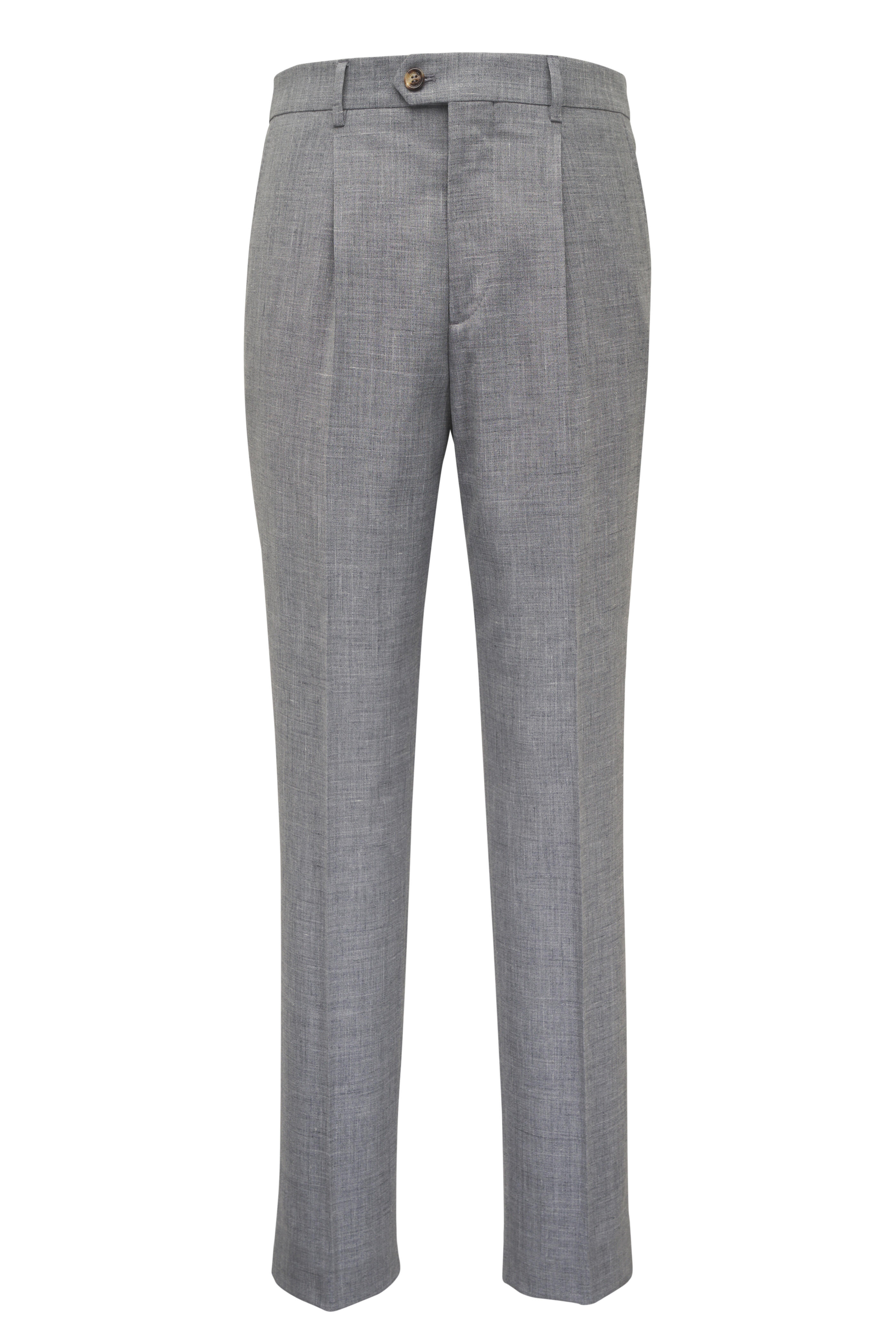 Pleated front. Zip fly; two button and hook-and-eye closure. Banded waist; belt loops. Side slanted pockets; back welt pockets. Made in Italy. 32" Inseam (size 34 R). 65% Wool, 20% silk, 15% linen. Dry clean.