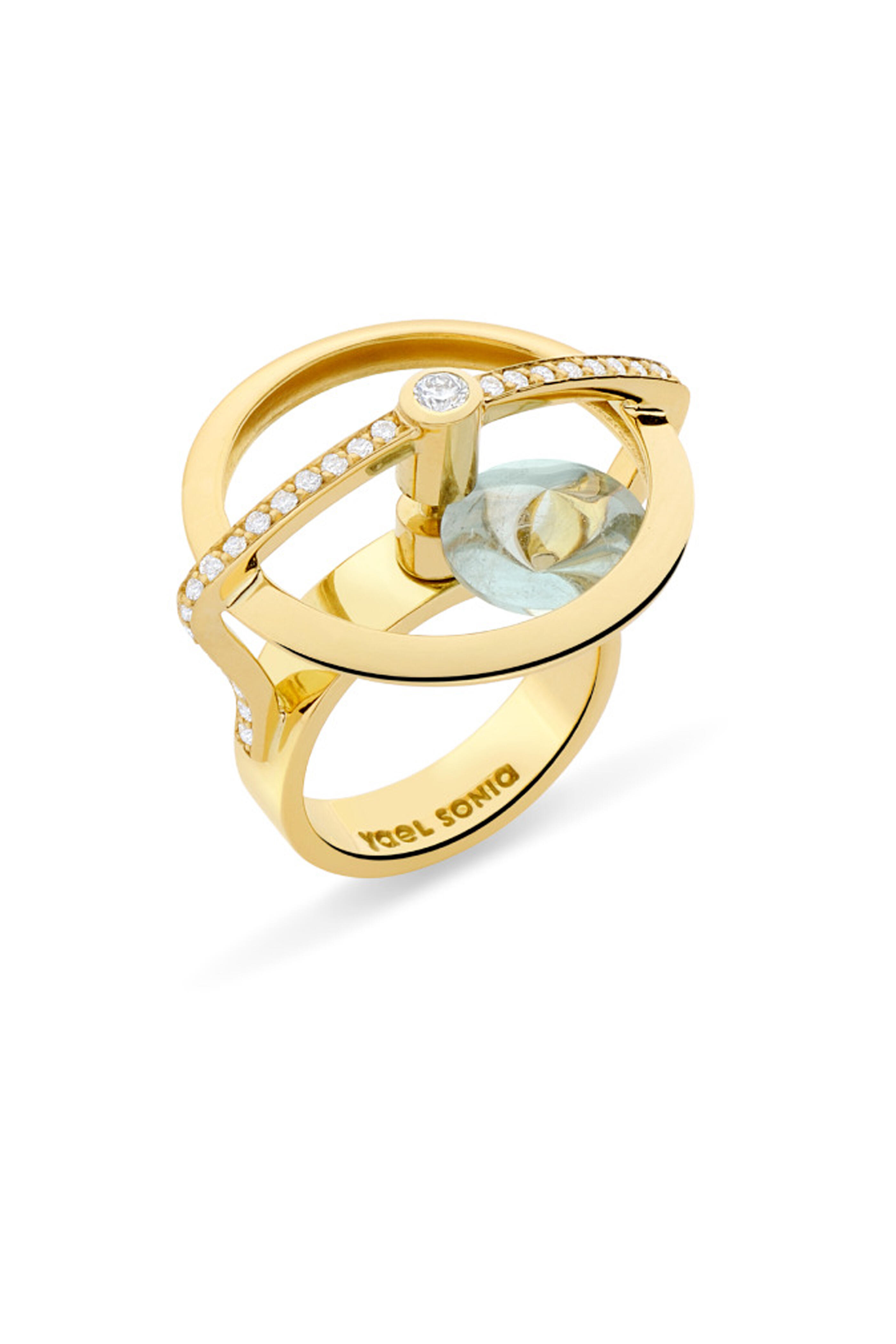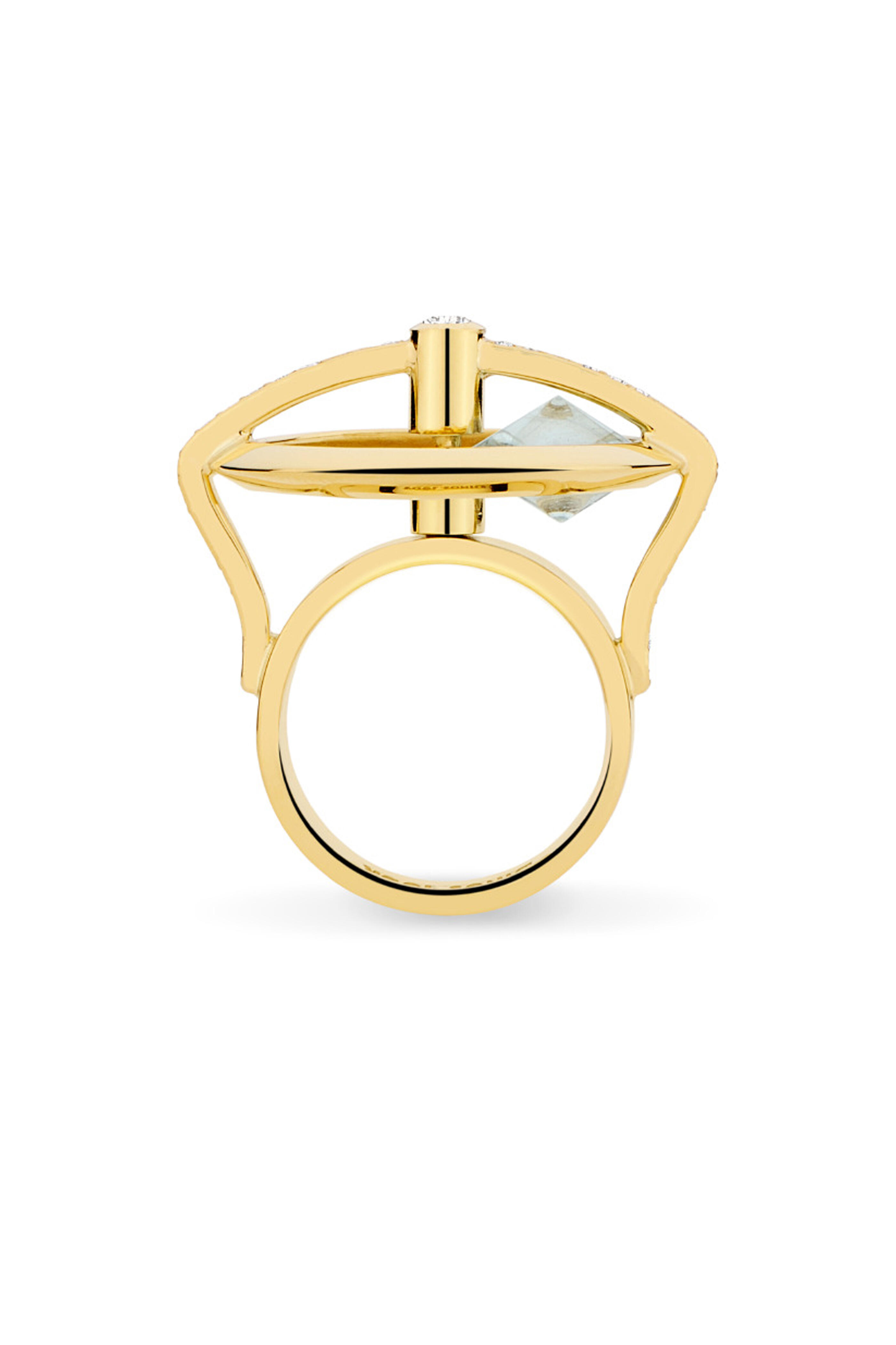 18k yellow gold. Diamond 0.43 total carat weight. Blue topaz 3.67 total carat weight. Custom-cut to echo silhouette of a spinning top. Blue topaz stone whirls around with every movement. Diamond center. Gold bezel. Prong setting. Spinning top collection. One of a kind. Made in New York. Call for ring size. Top circle diameter: 2.5 cm. Top circle height: 1.3 cm.