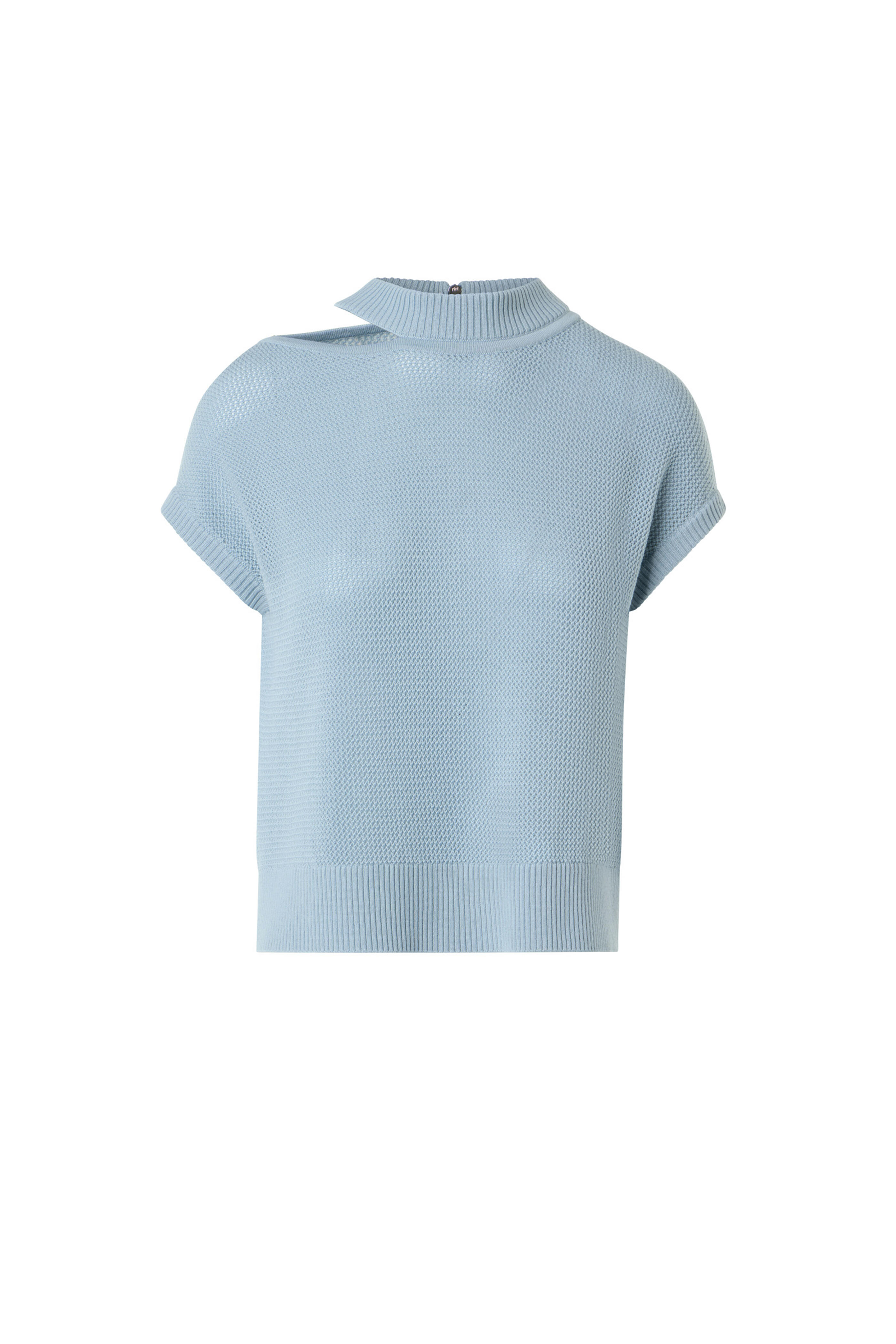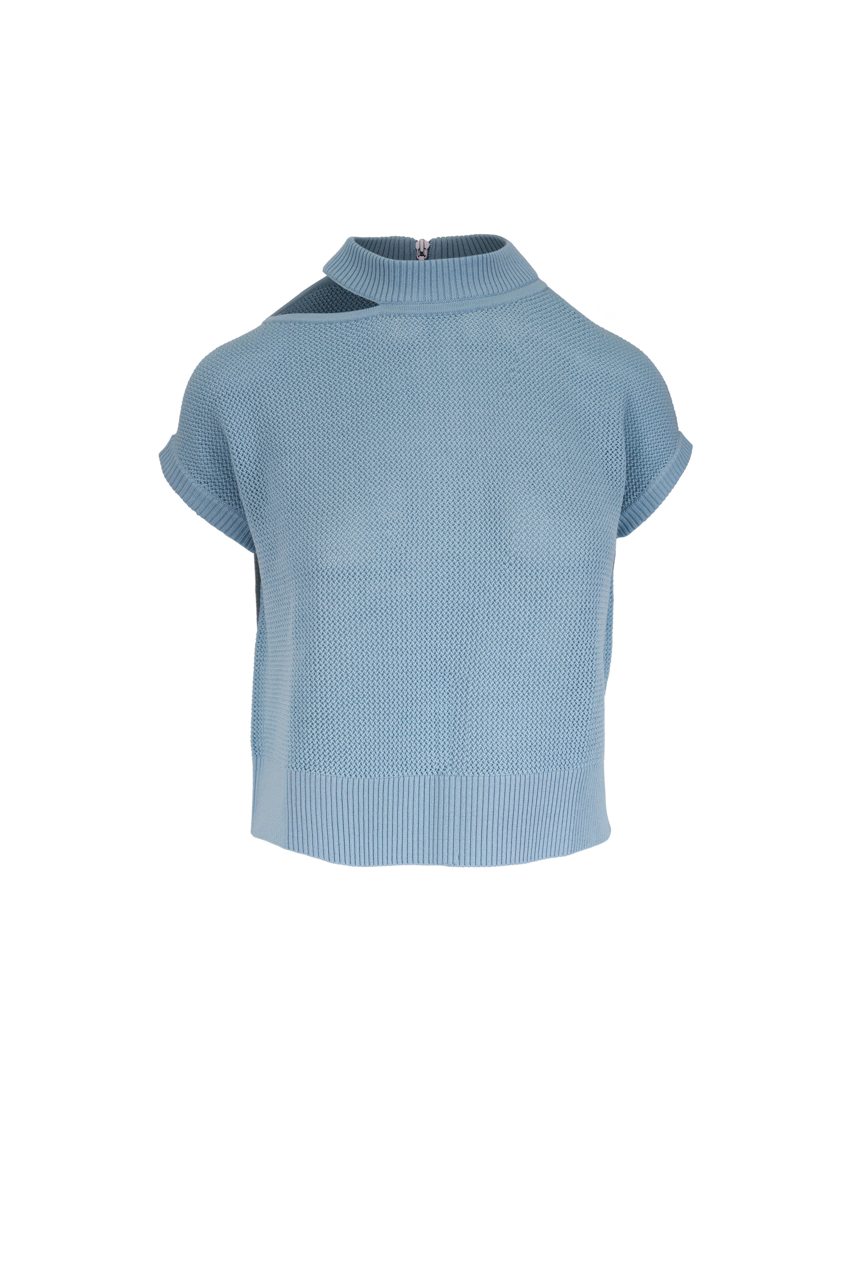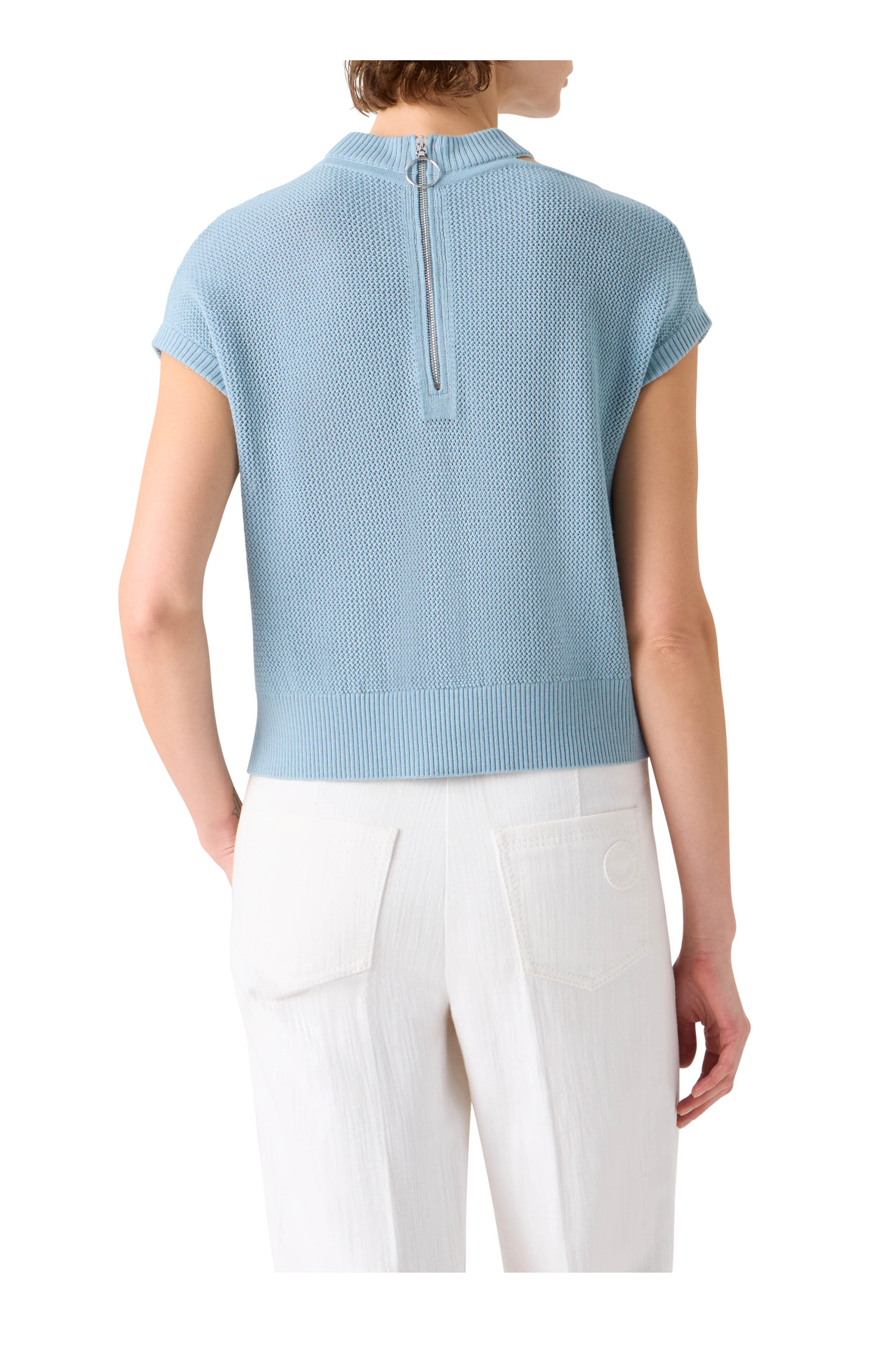 Crew neckline; cutout detail. Back zip. Pullover style. Ribbed trims. Straight hem. Imported. Shoulder to hem 20" (size 4). 100% Virgin wool. Dry clean.