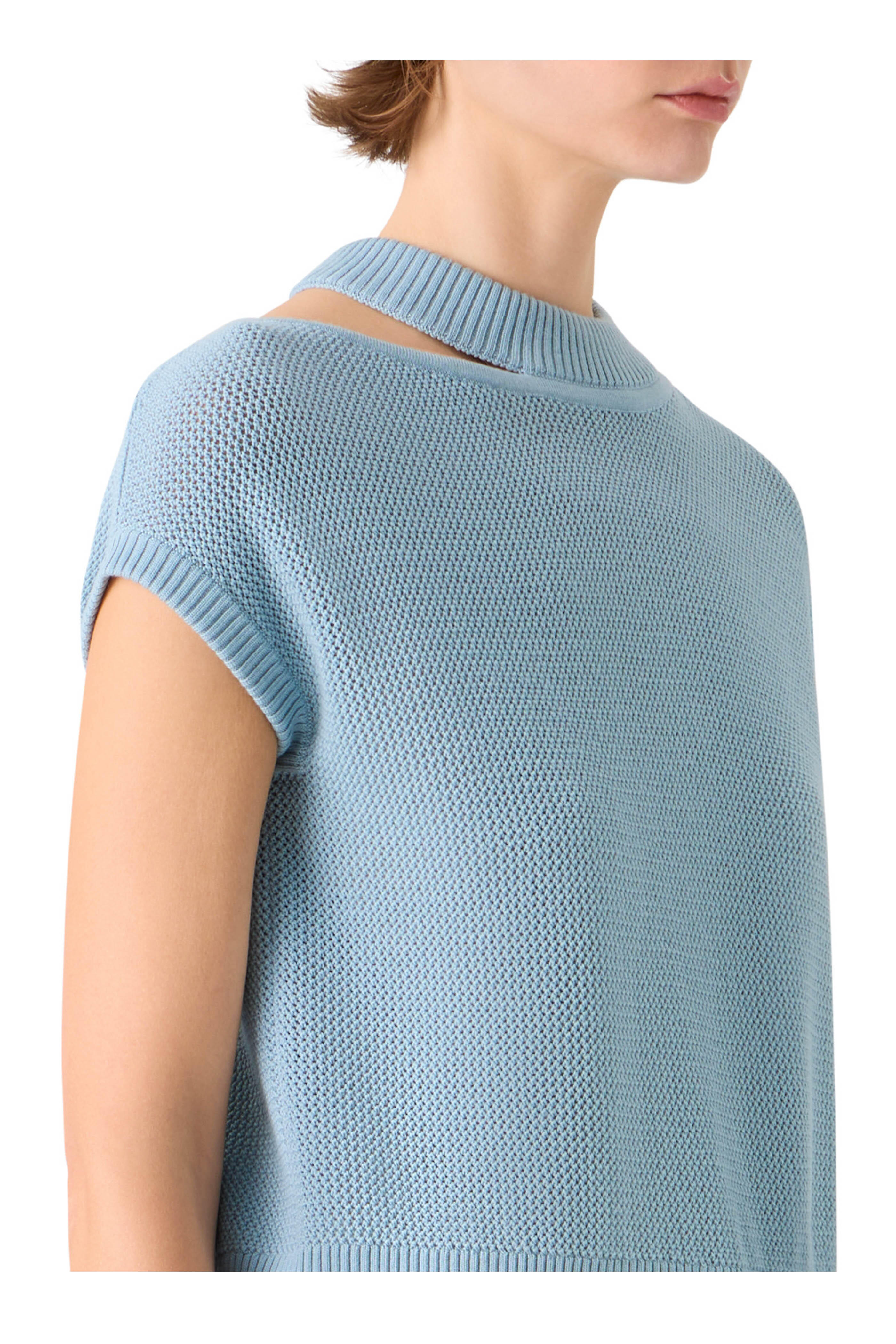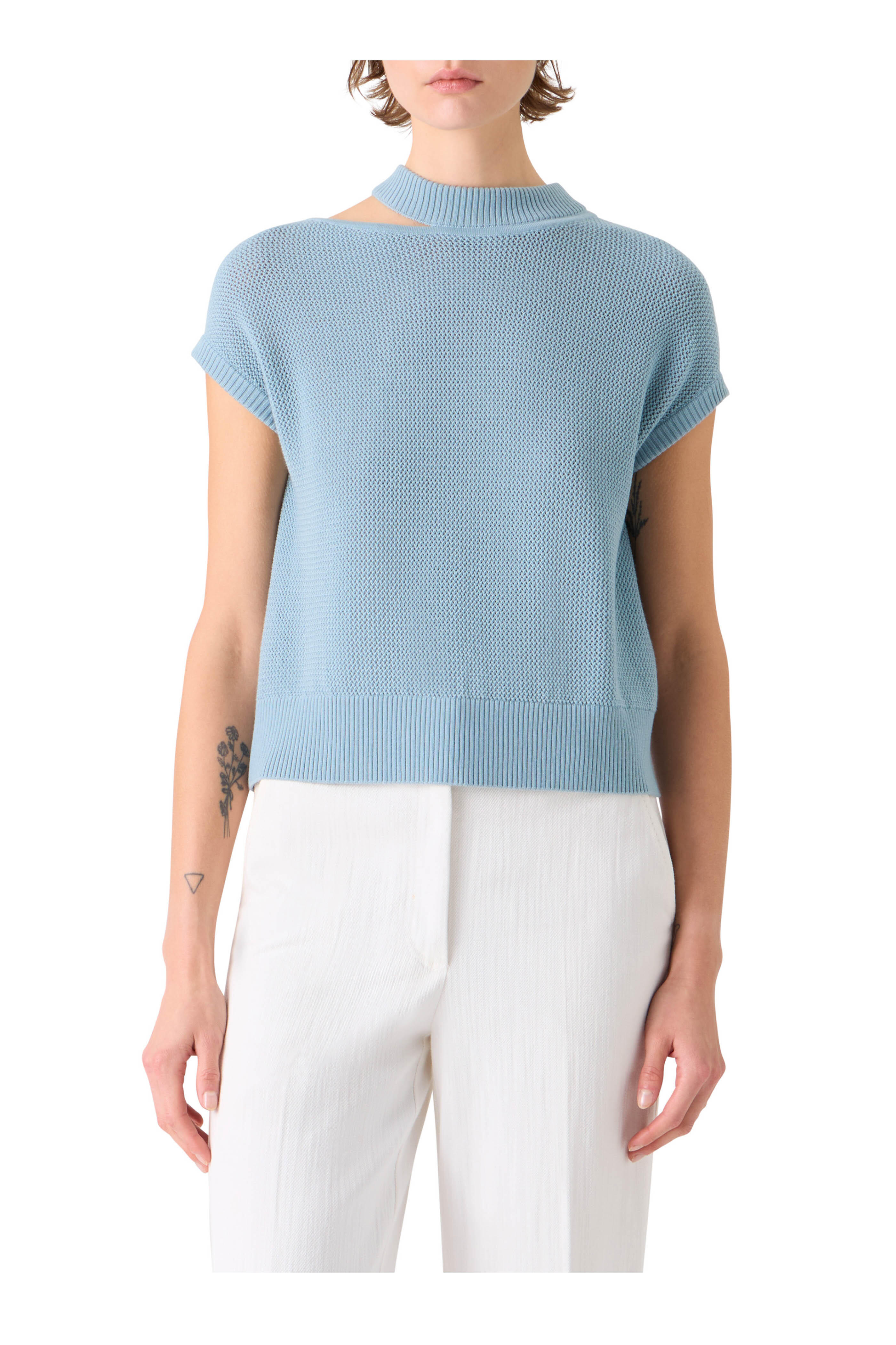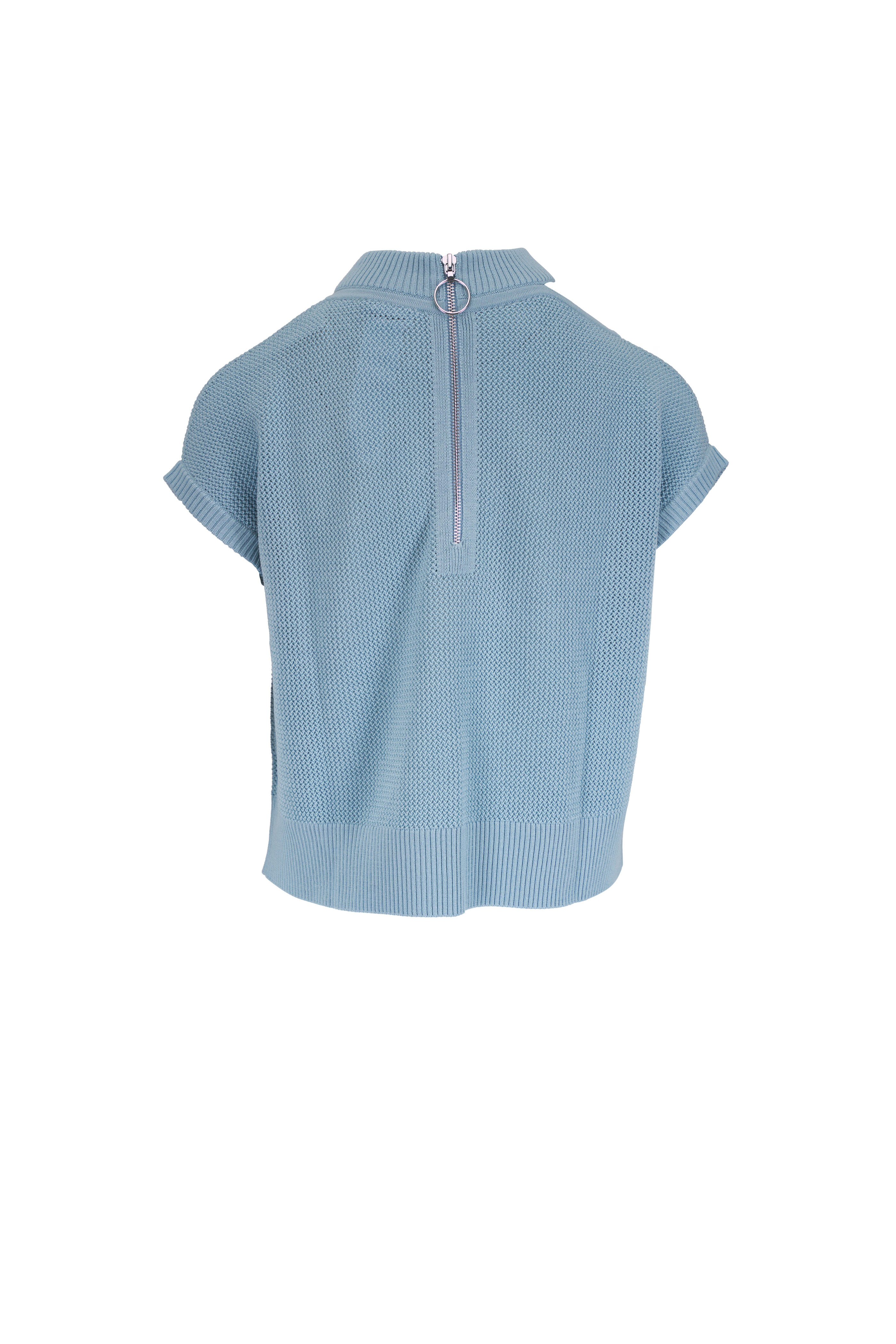 Crew neckline; cutout detail. Back zip. Pullover style. Ribbed trims. Straight hem. Imported. Shoulder to hem 20" (size 4). 100% Virgin wool. Dry clean.