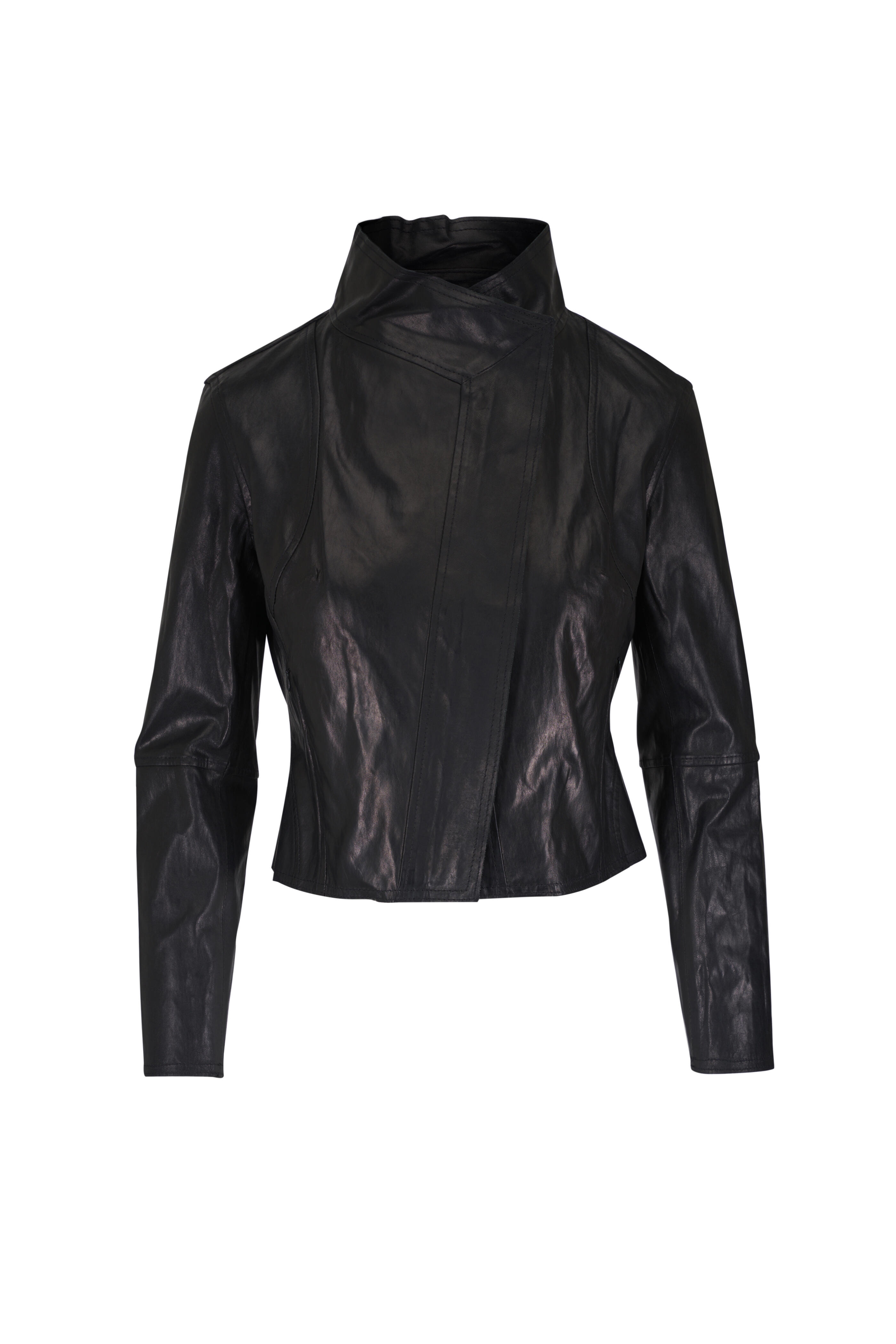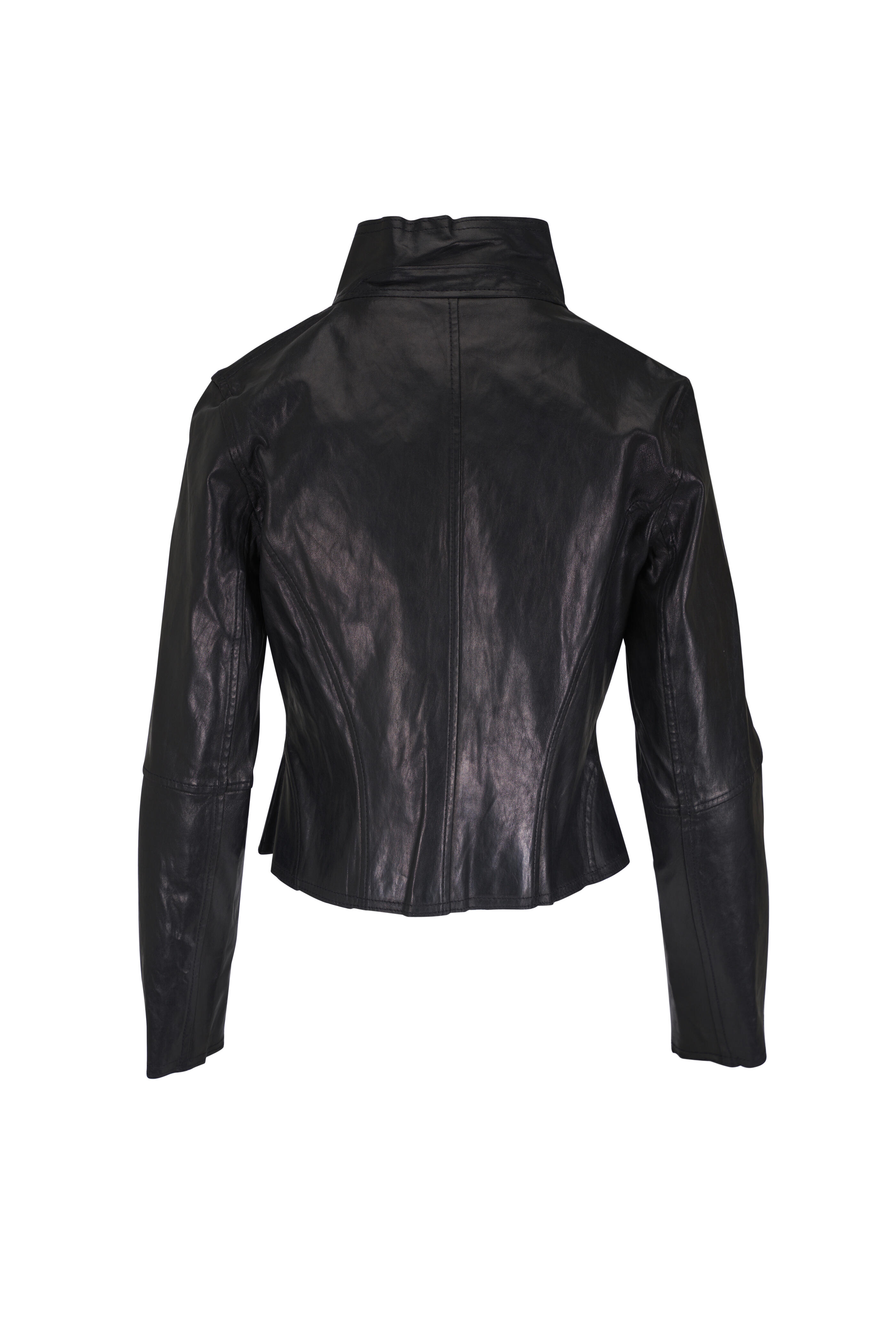 Specialist clean. Oversized notch lapels. Asymmetrical zip. Zip pockets. Raw edge finish. Made in the USA. 100% lambskin; unlined.
