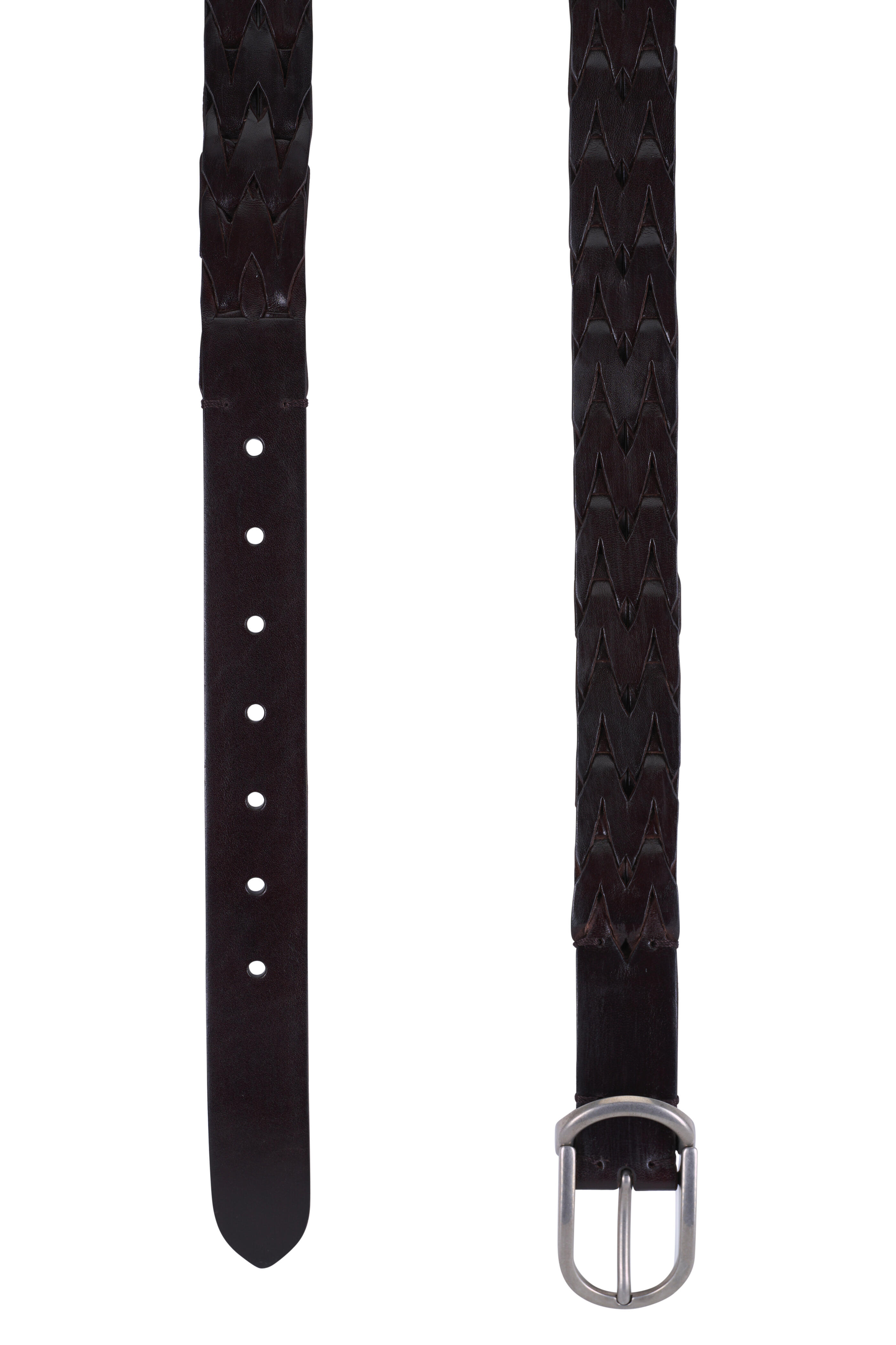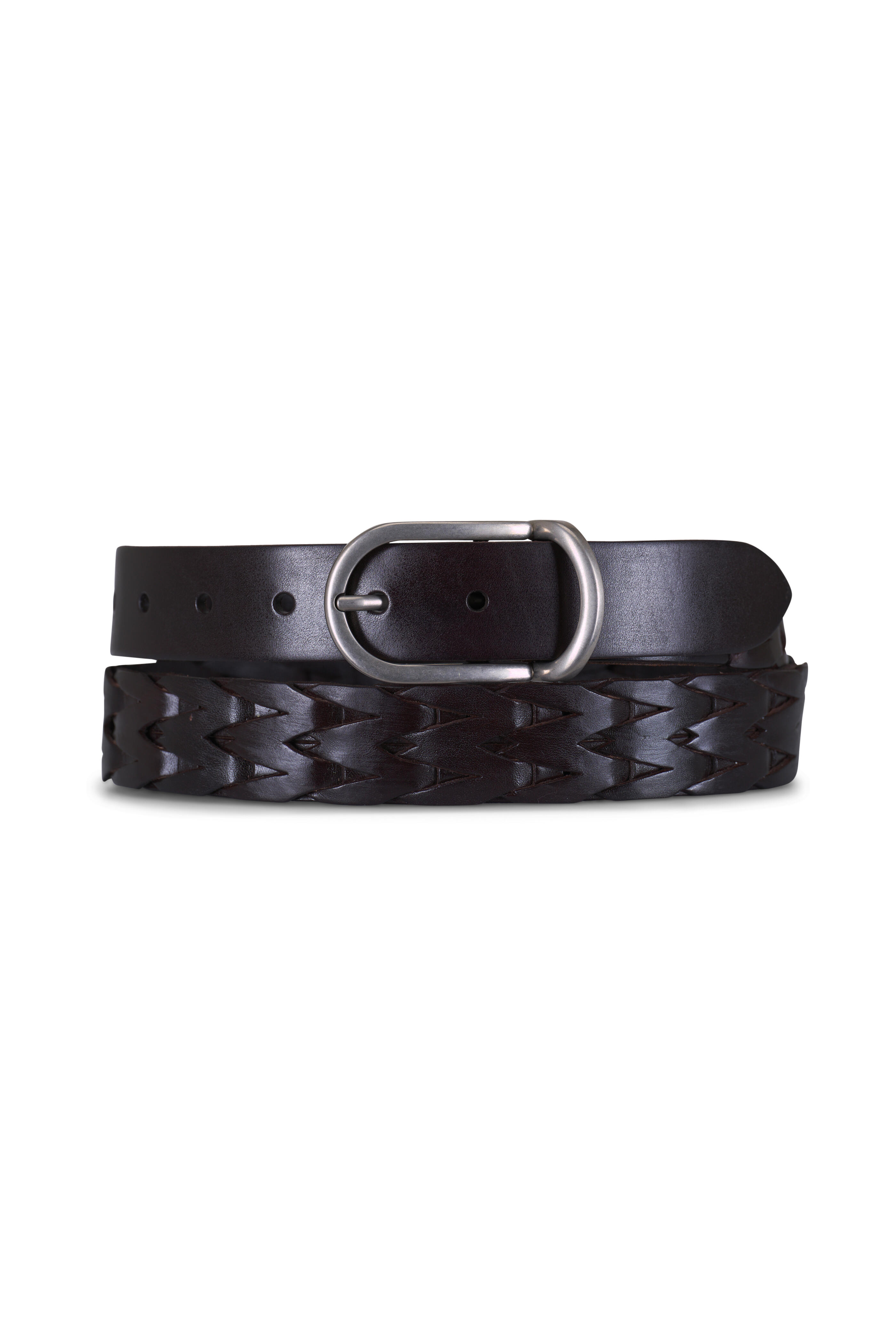 Woven leather. Oval buckle. Pointed tip. Single metal loop keeper. Made in Italy. Width: 30mm.