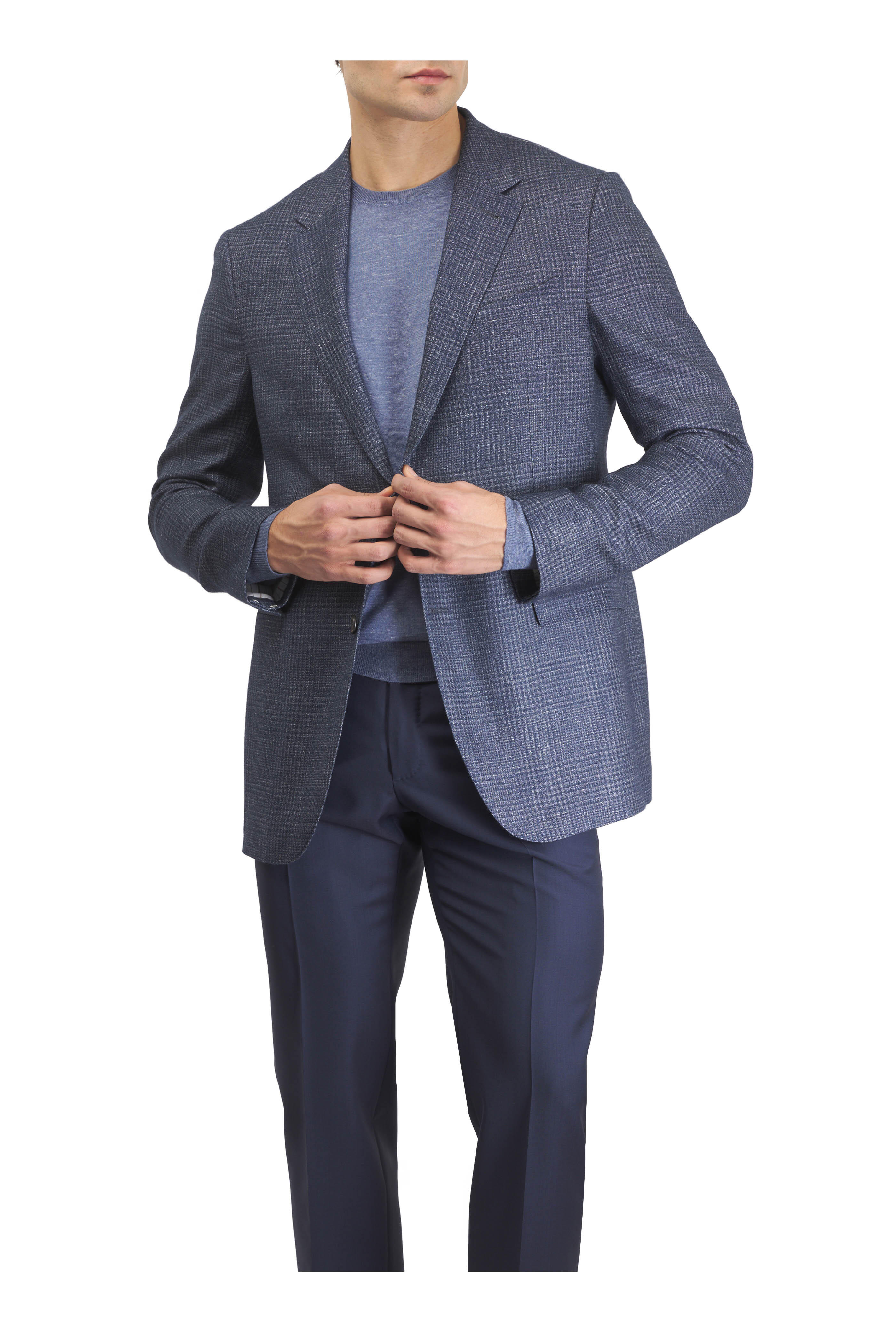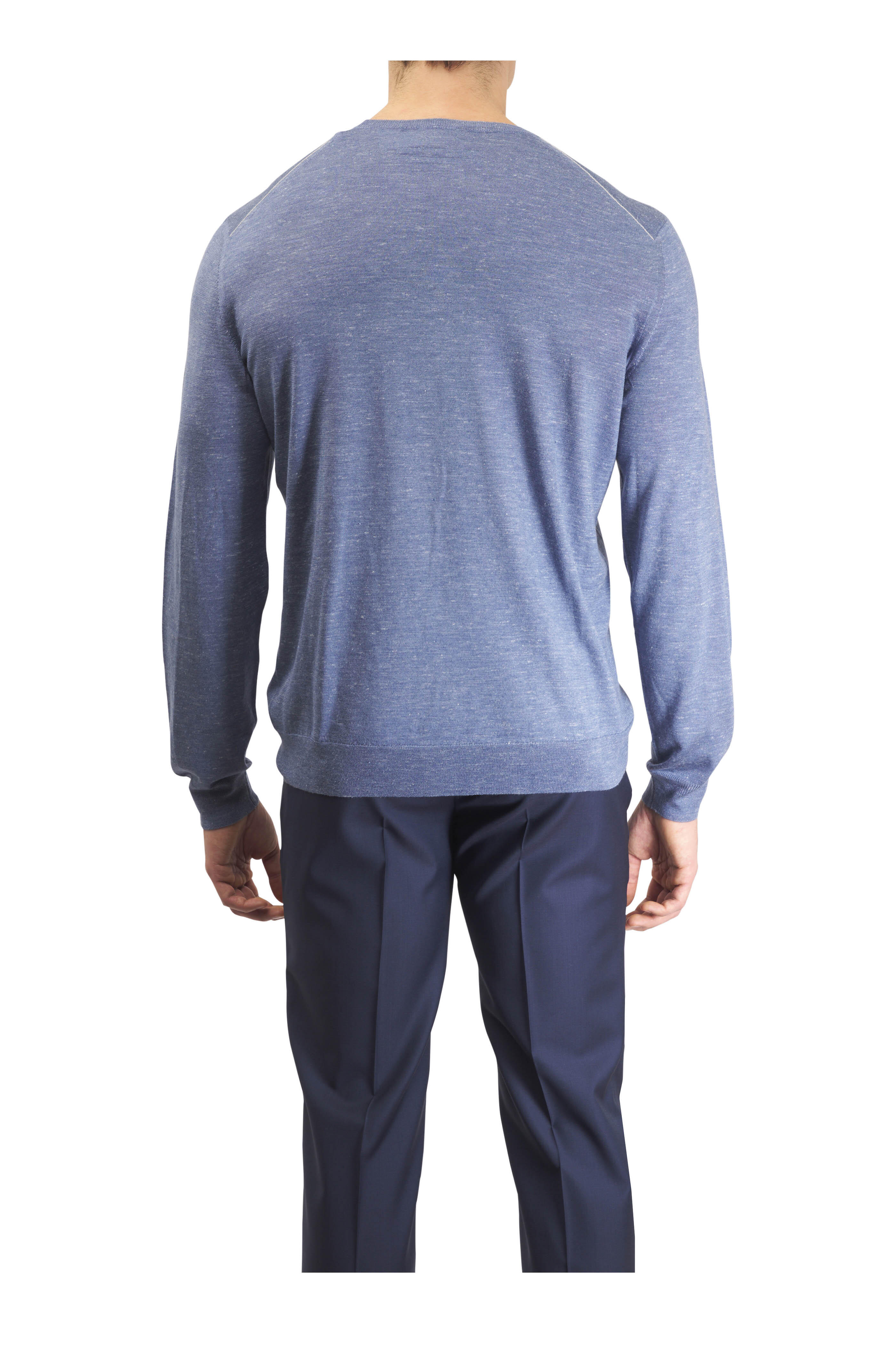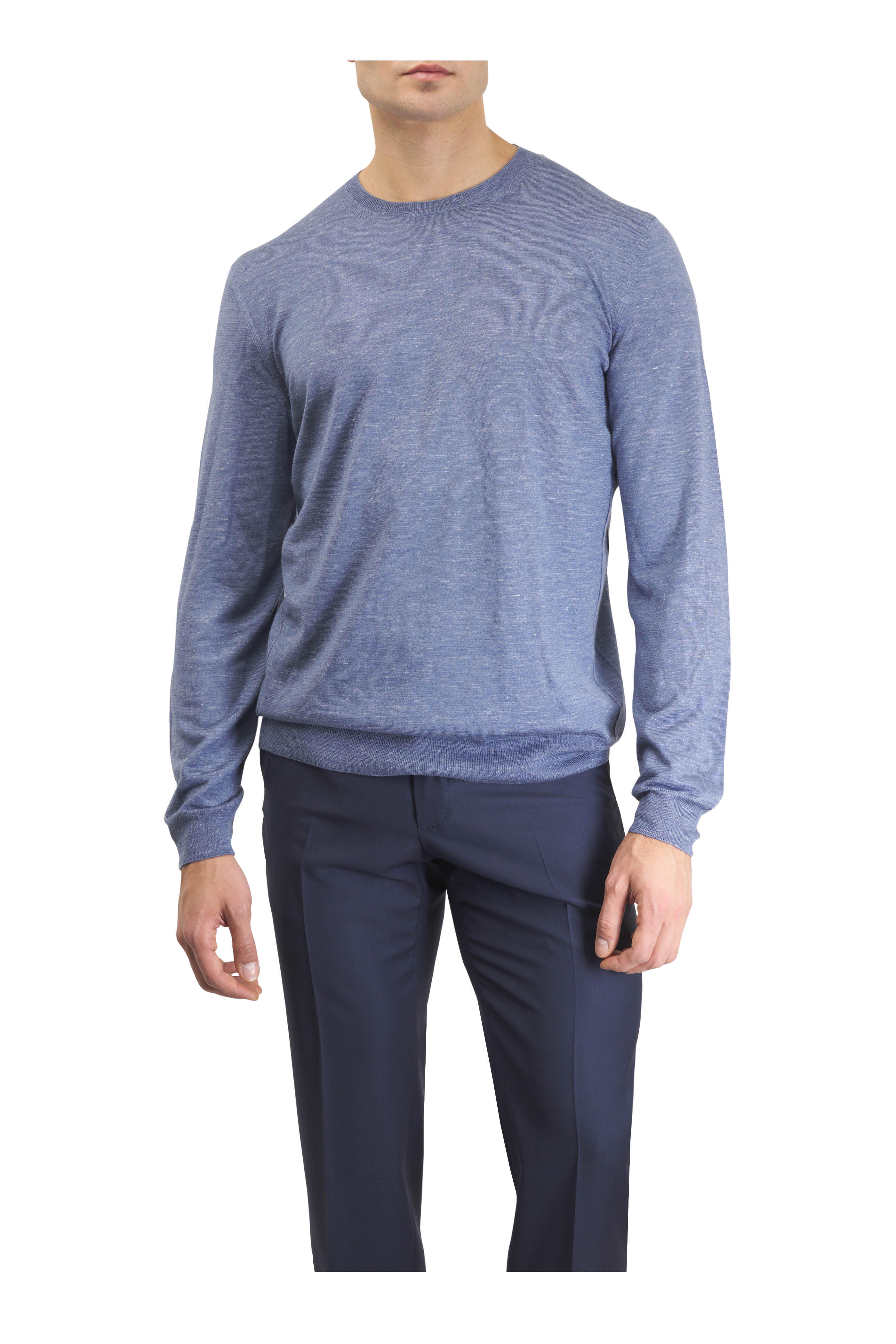 Ribbed crewneck collar. Ribbed hem and cuffs. Long sleeves. Regular fit. 18 gauge. Made in Italy. 60% silk, 30% cashmere, 10% linen.