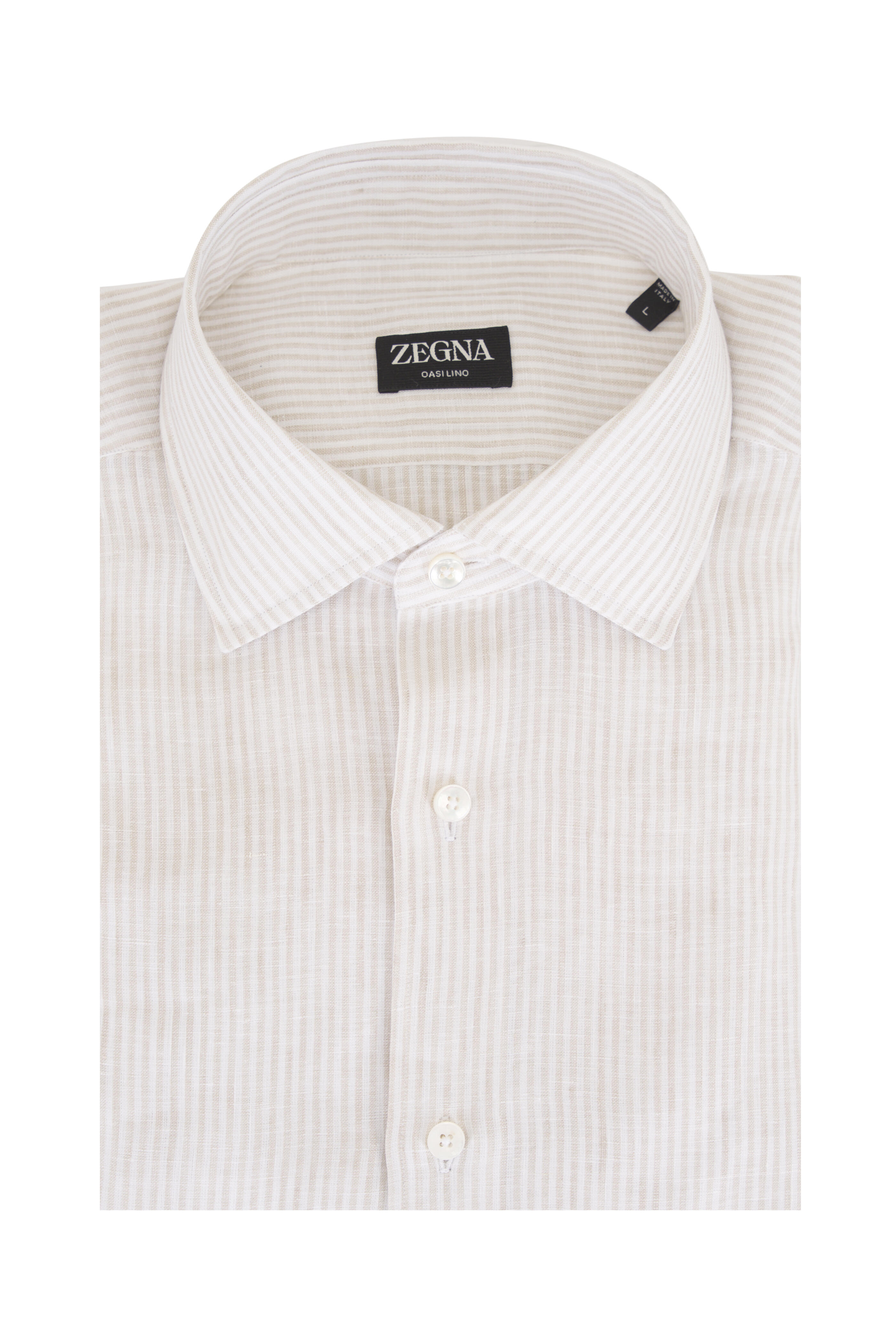 Spread collar. French front button placket. Single-button barrel cuffs. Made in Italy. 100% linen. Machine wash.