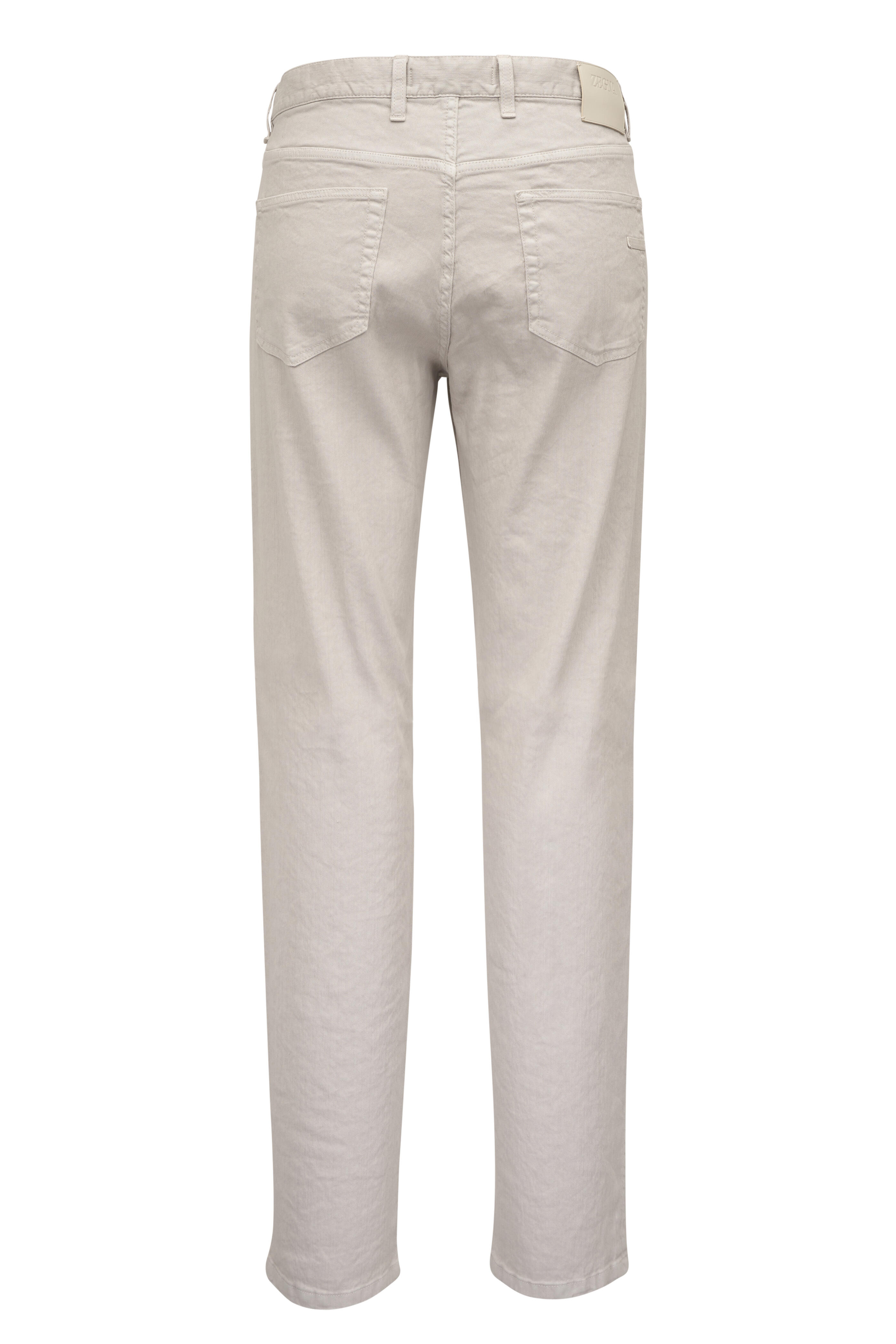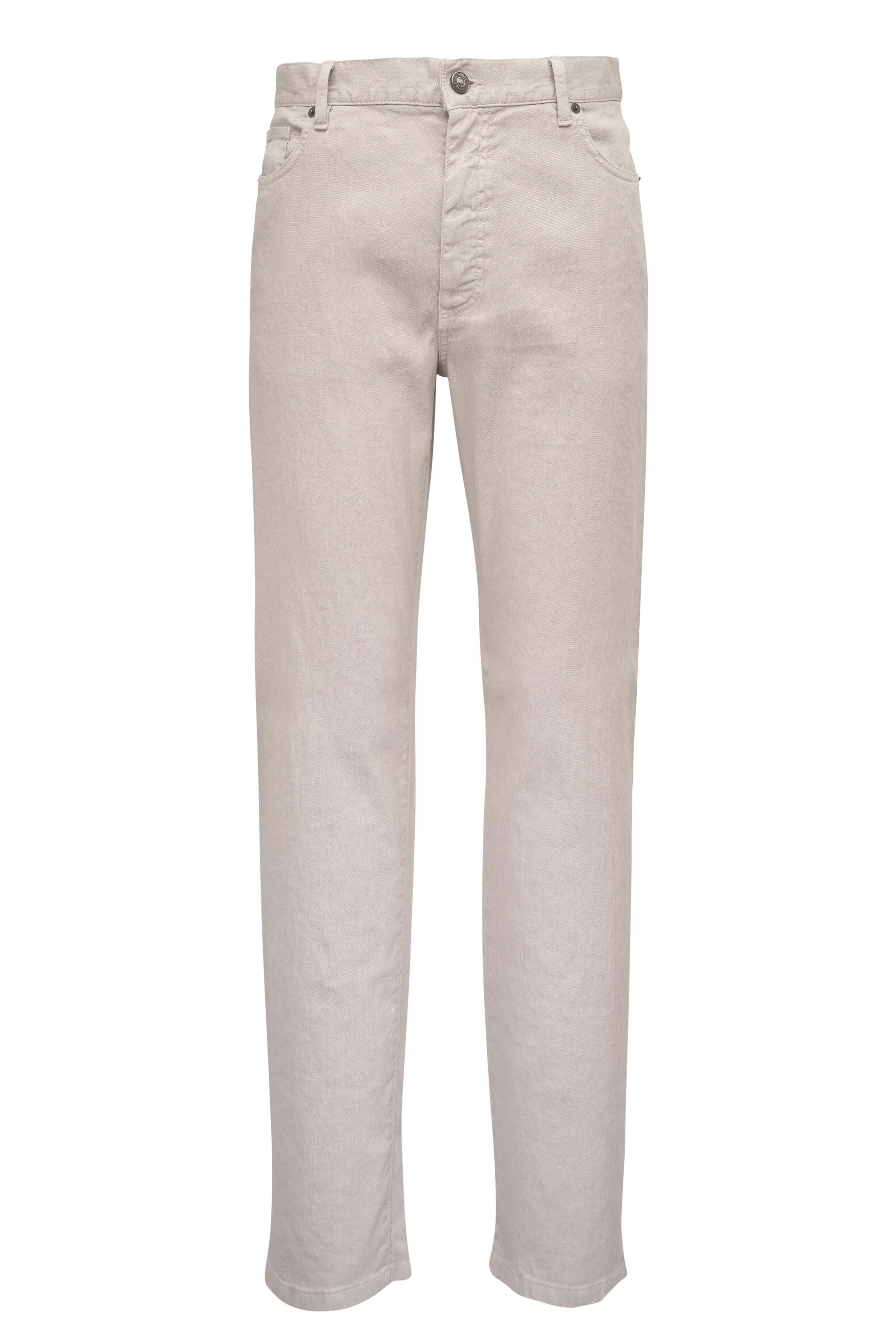 Zip fly; button closure. Banded waist; belt loops. Five-pocket styling. Straight hem. Imported. 65% linen, 34% cotton, 1% elastane. Dry clean.