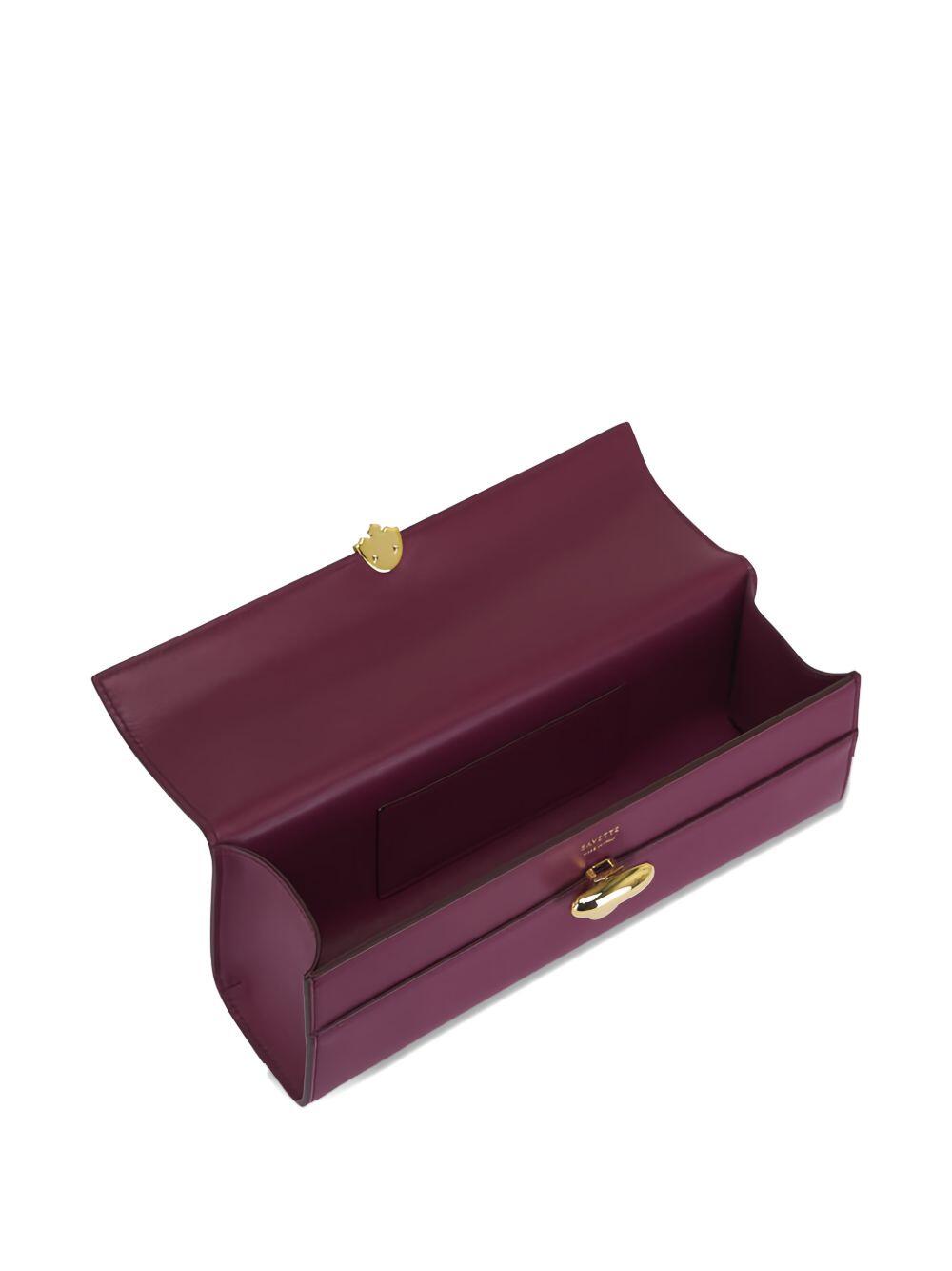 Leather. Flap closure with turn lock. Single top handle. Single compartment. Interior wall pocket. Leather lining. Made in Italy. Width: 10.5". Height: 5". Depth: 3".