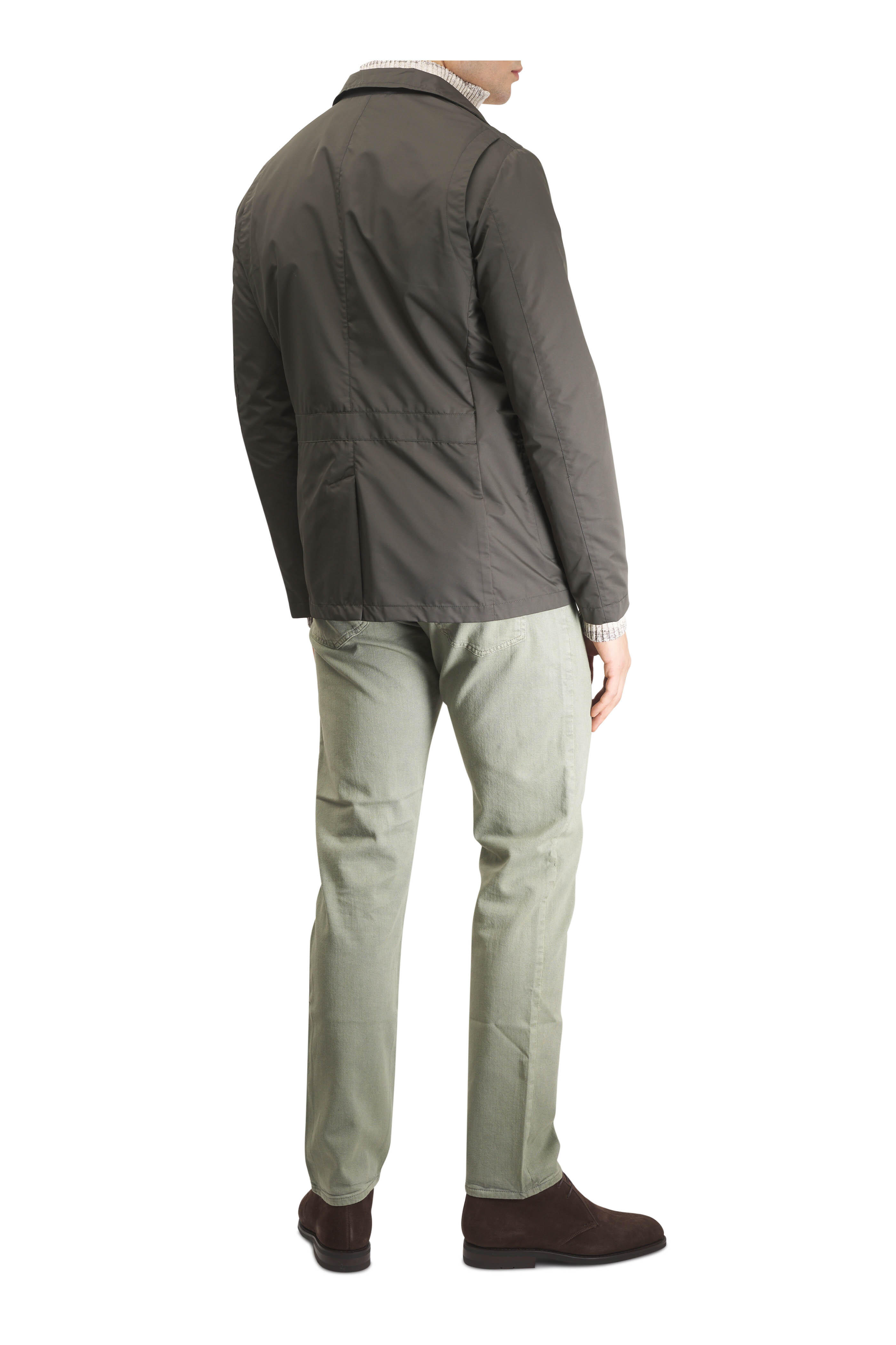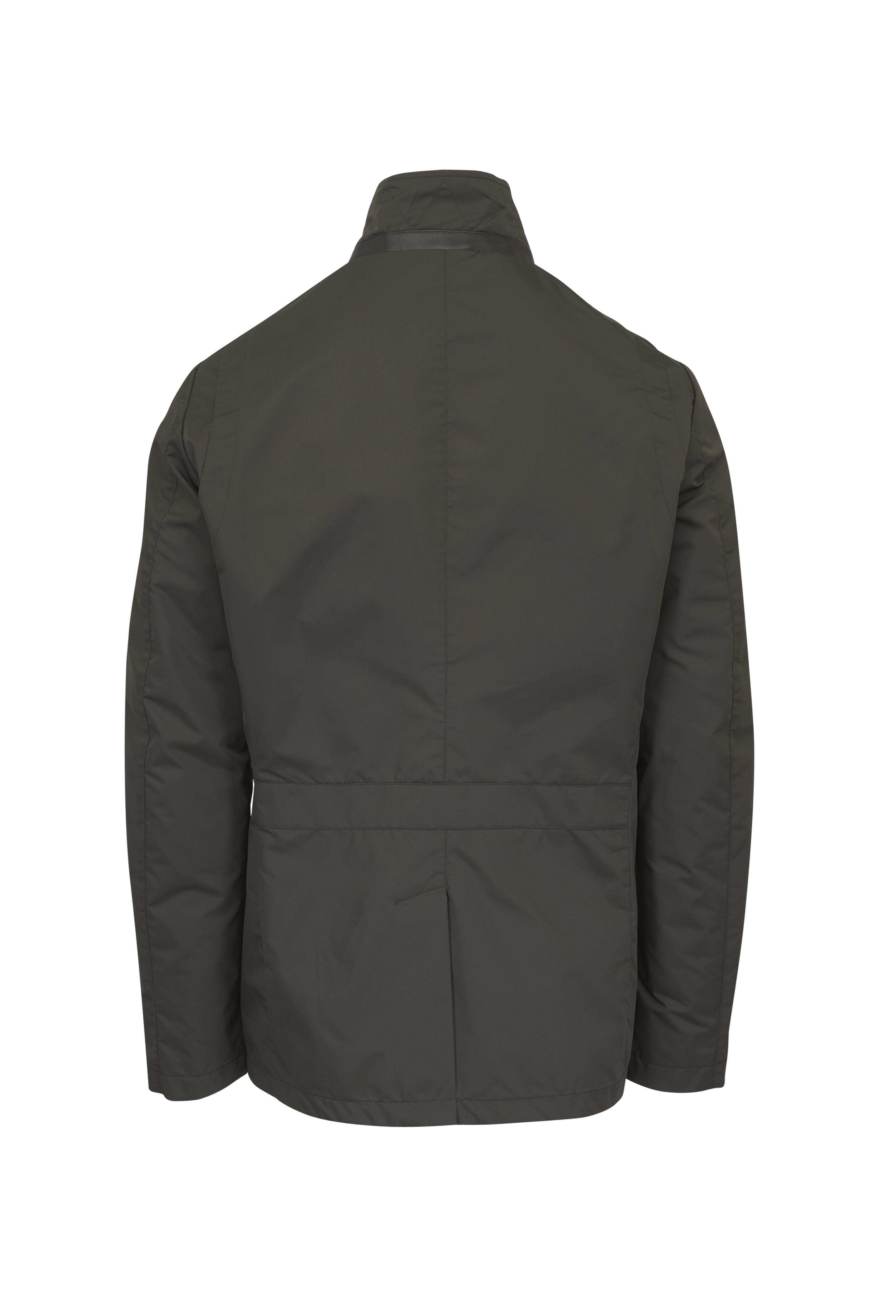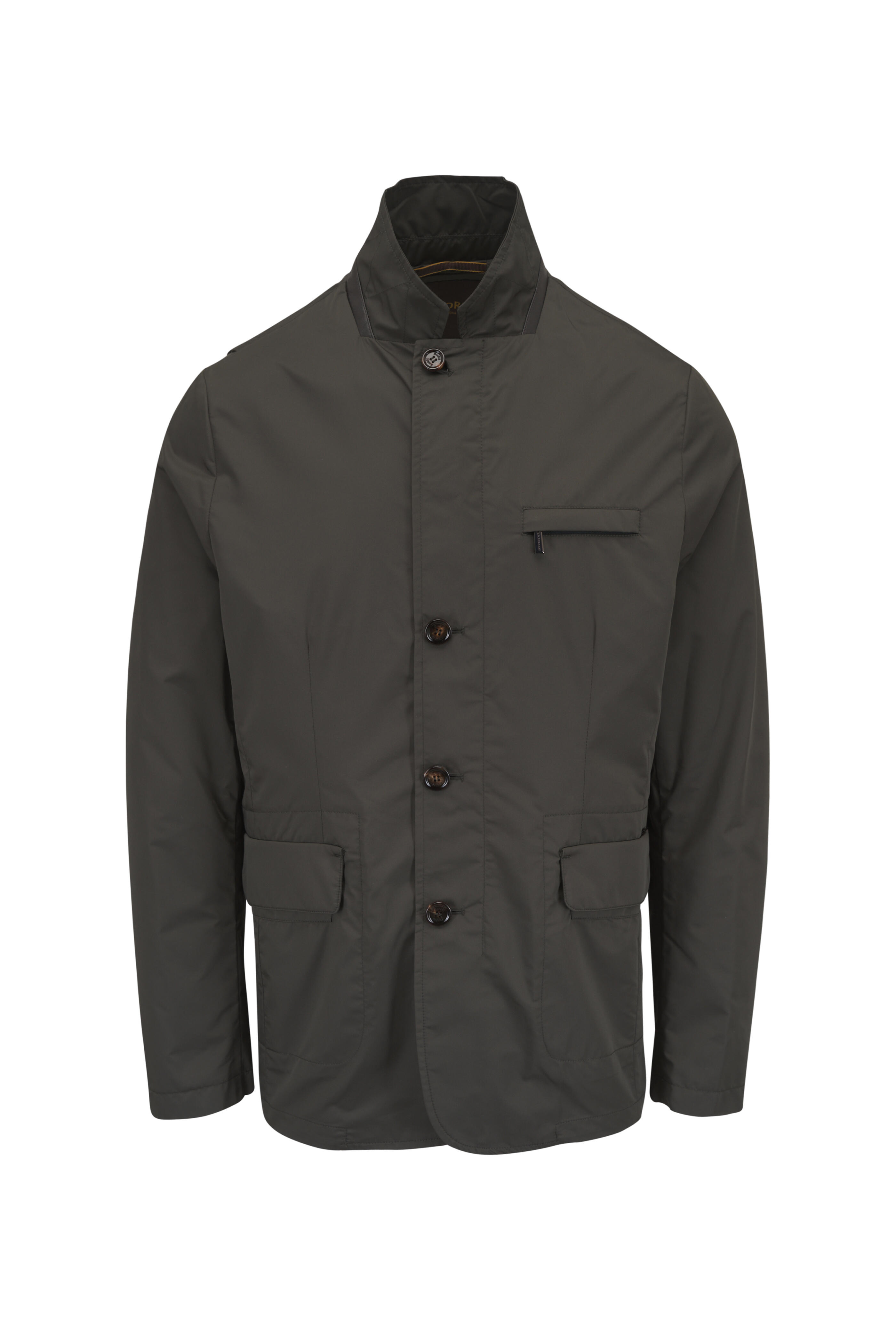Stand collar; notched lapels. Front button closure; two-way concealed zip. Chest welt pockets; lower flap pockets; interior slip pockets. Made in Italy. 100% polyester. Dry clean.