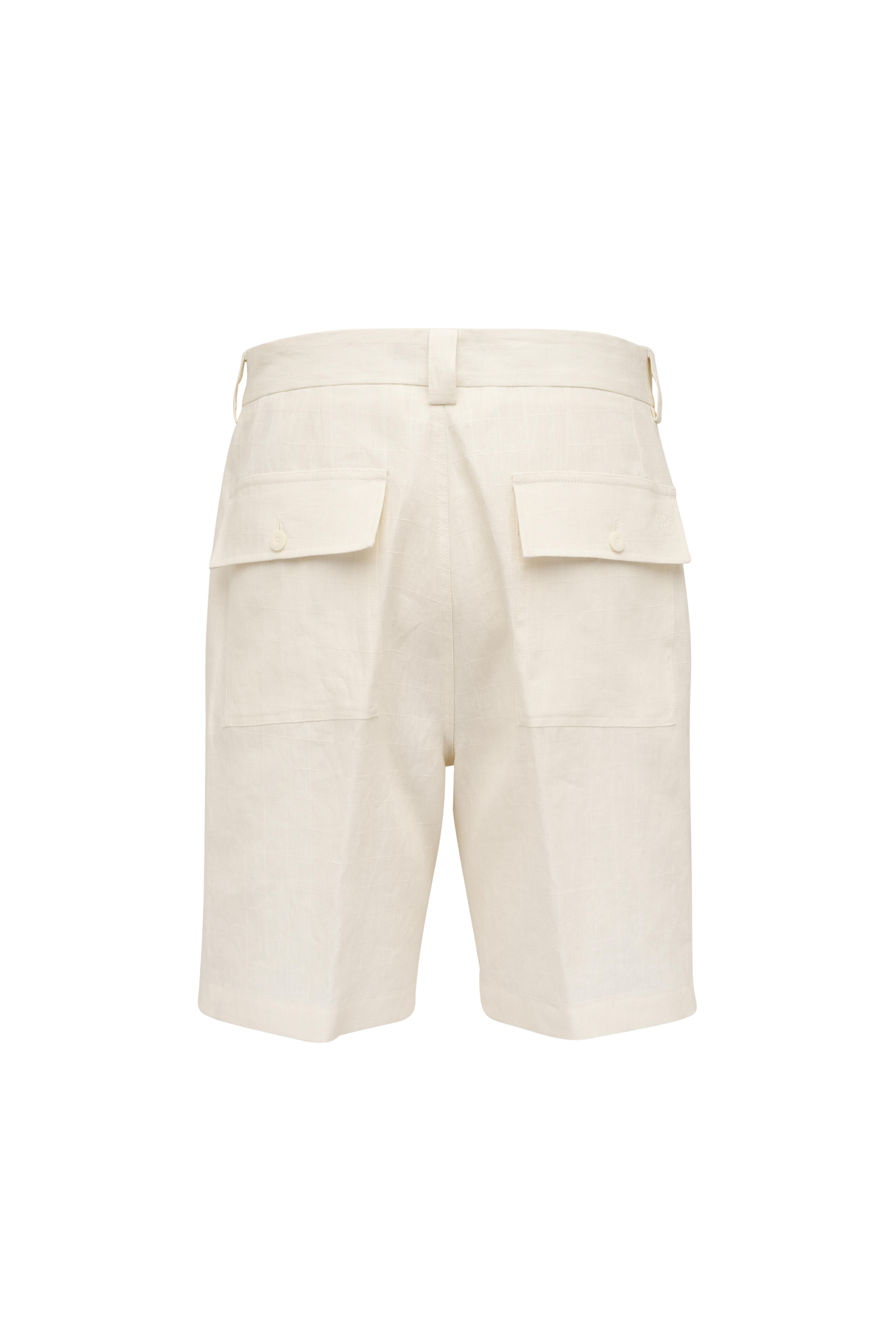 Zip fly; button closure. Banded waist; belt loops. Side slip pockets; back flap button pockets. Front pleat. Made in Italy. Inseam 9" (size 36). 100% Linen. Dry clean.