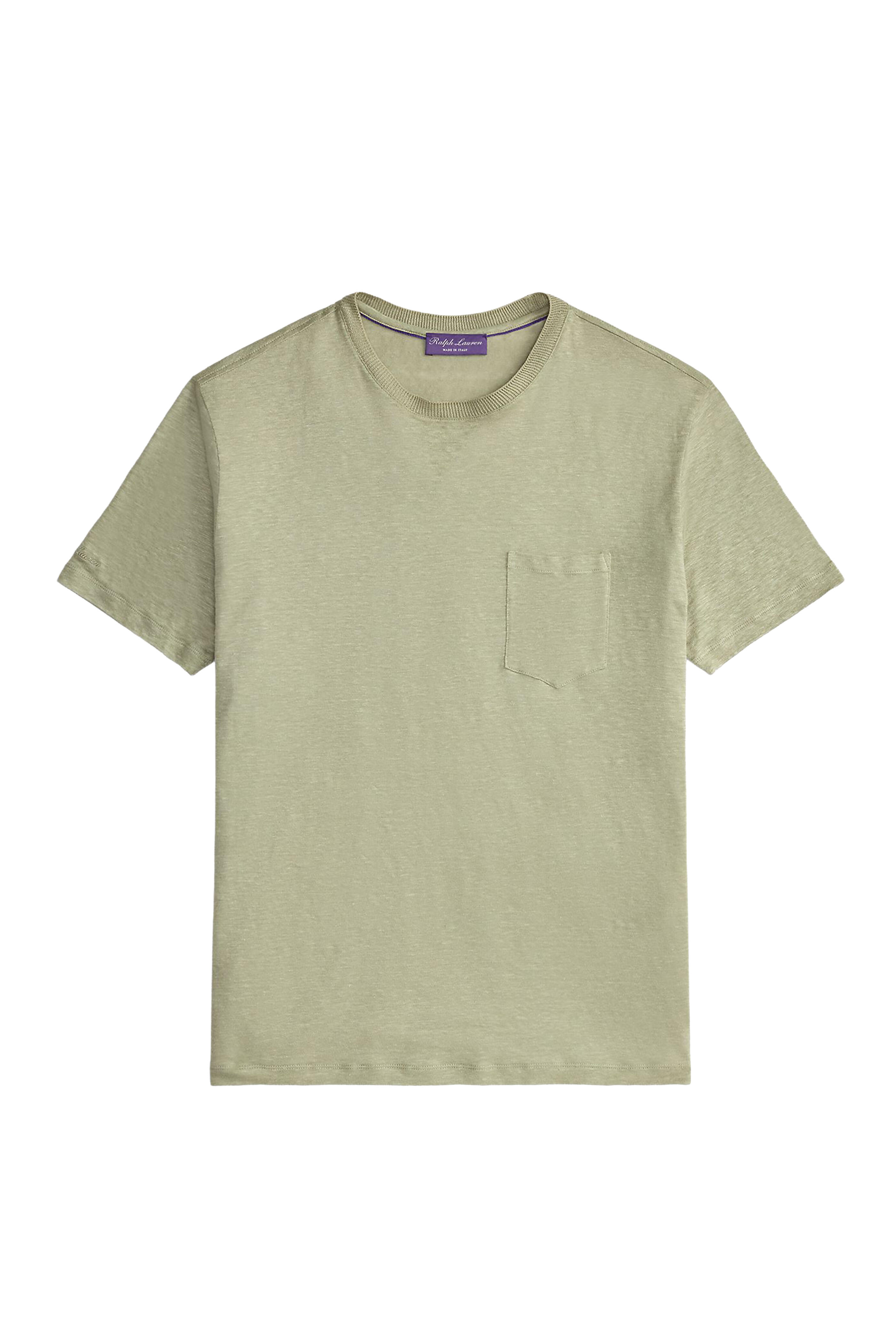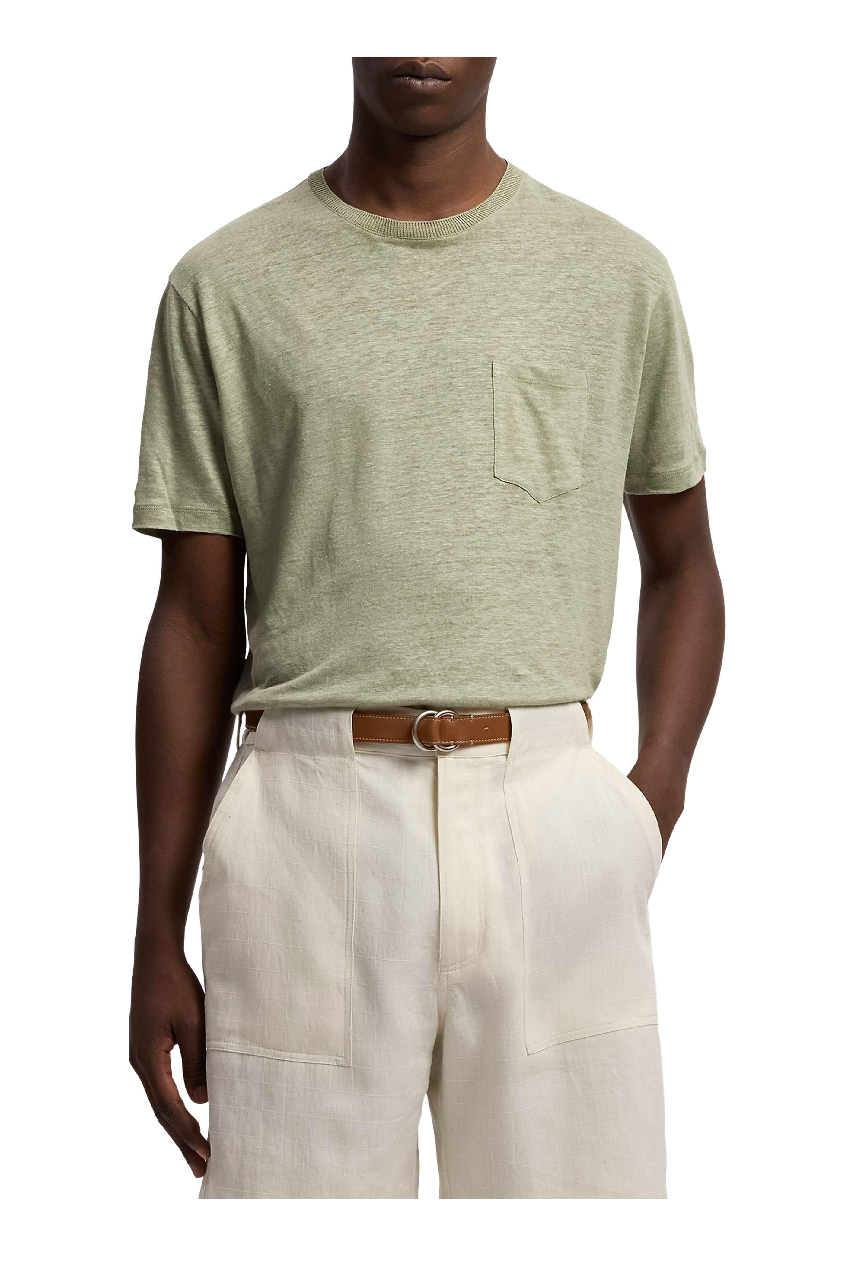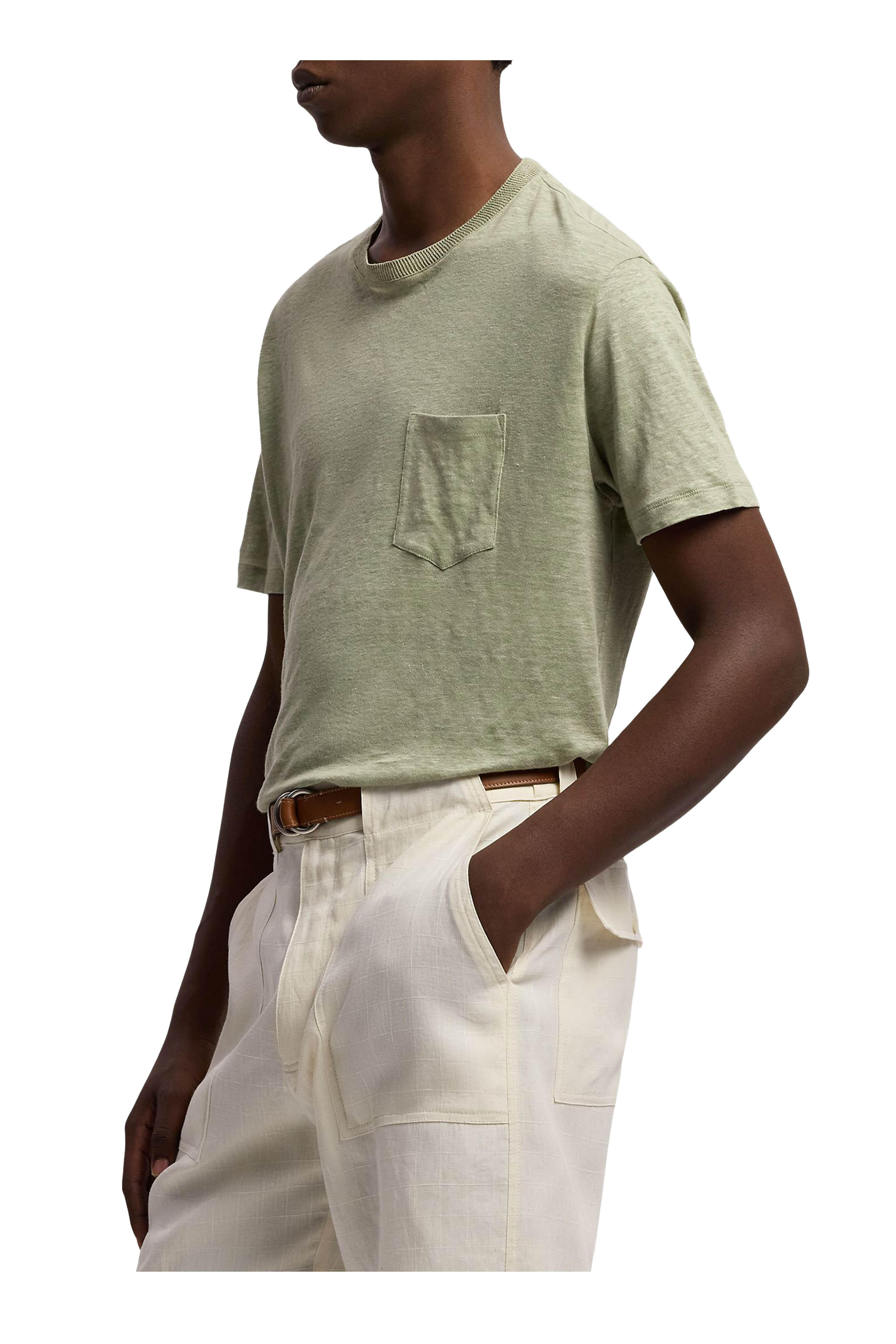 Crewneck. Chest patch pocket. Short sleeves. Made in Italy. 100% linen. Dry clean.
