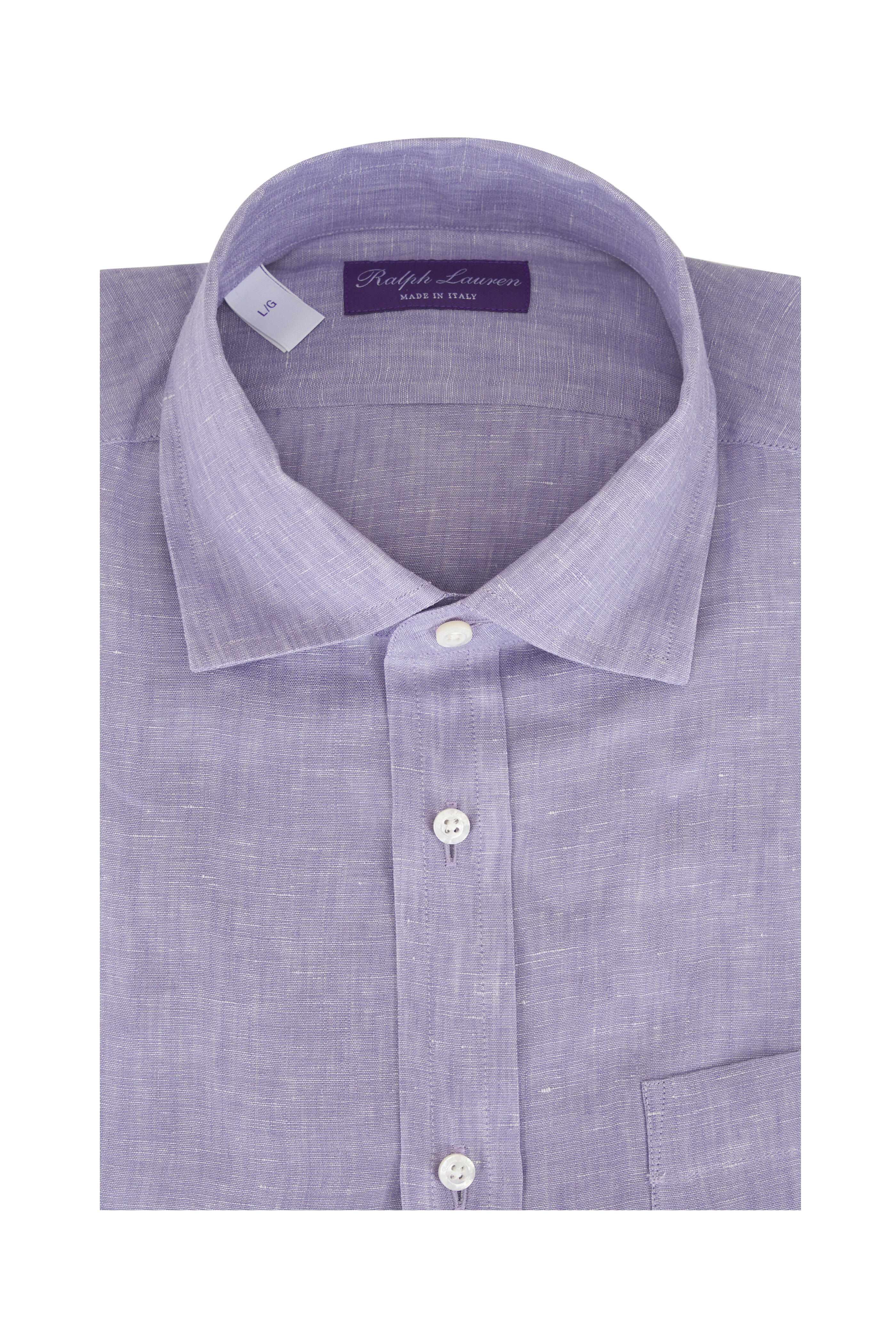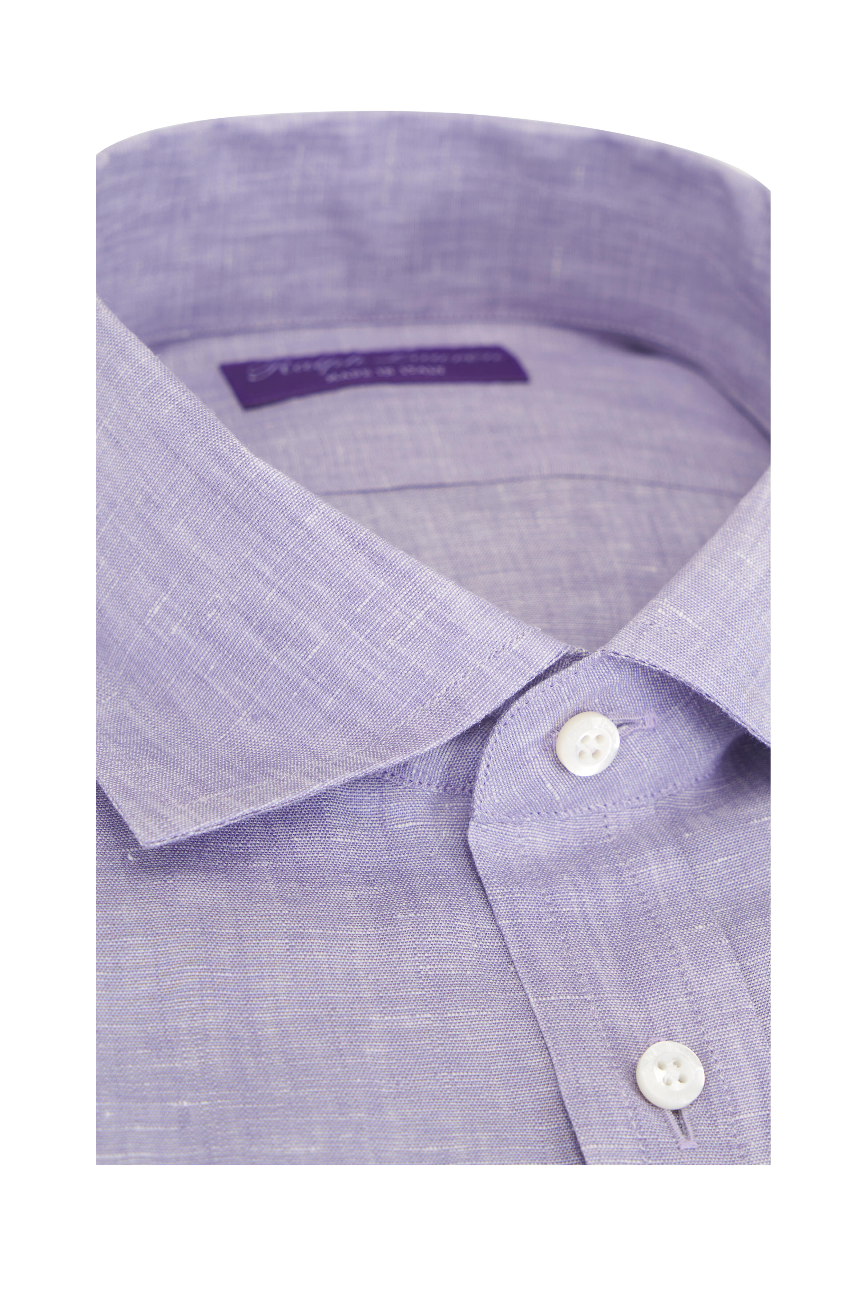 Cutaway collar. French front button placket. Single button barrel cuffs. Made in Italy. 100% Linen. Machine wash.