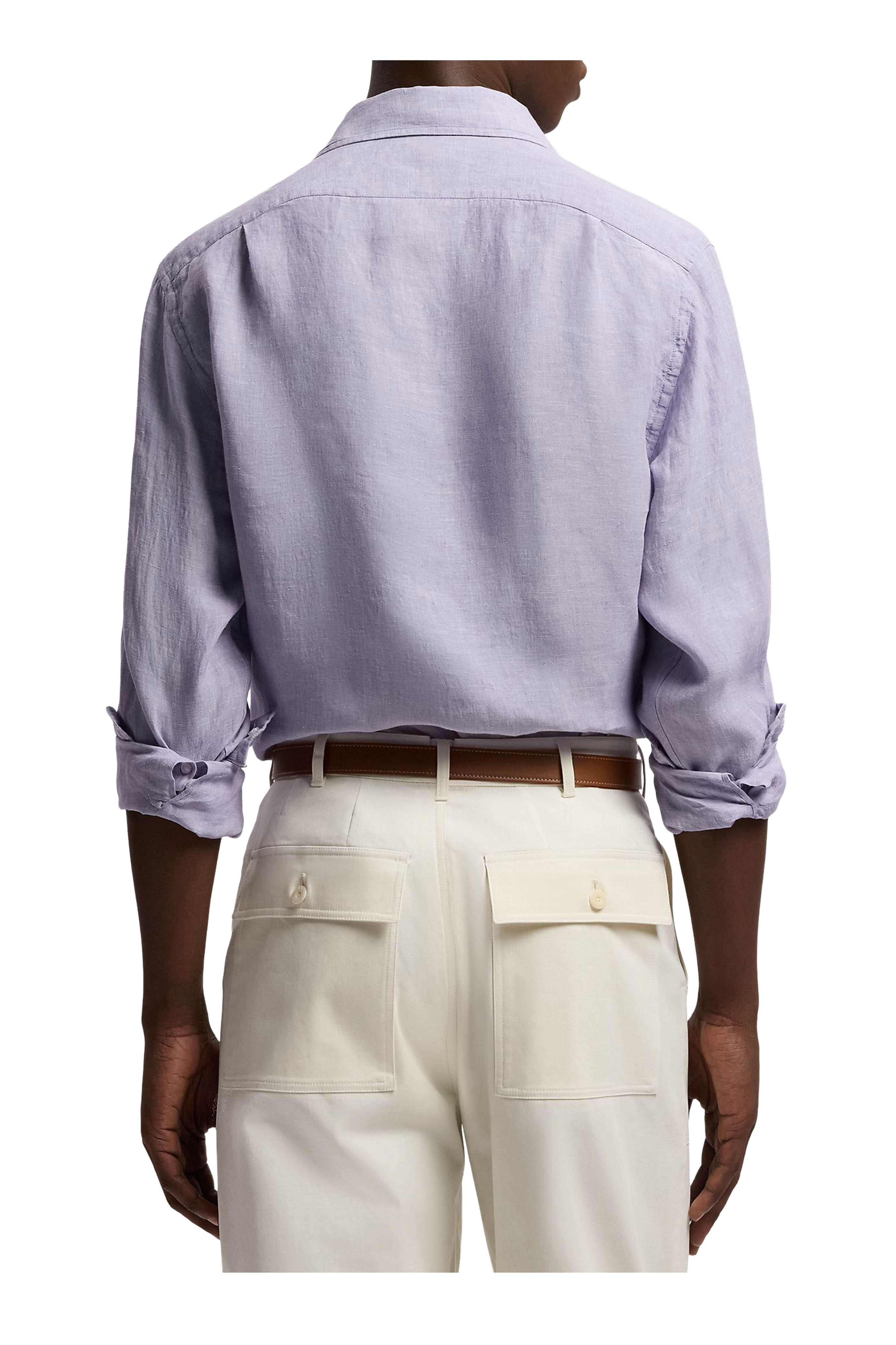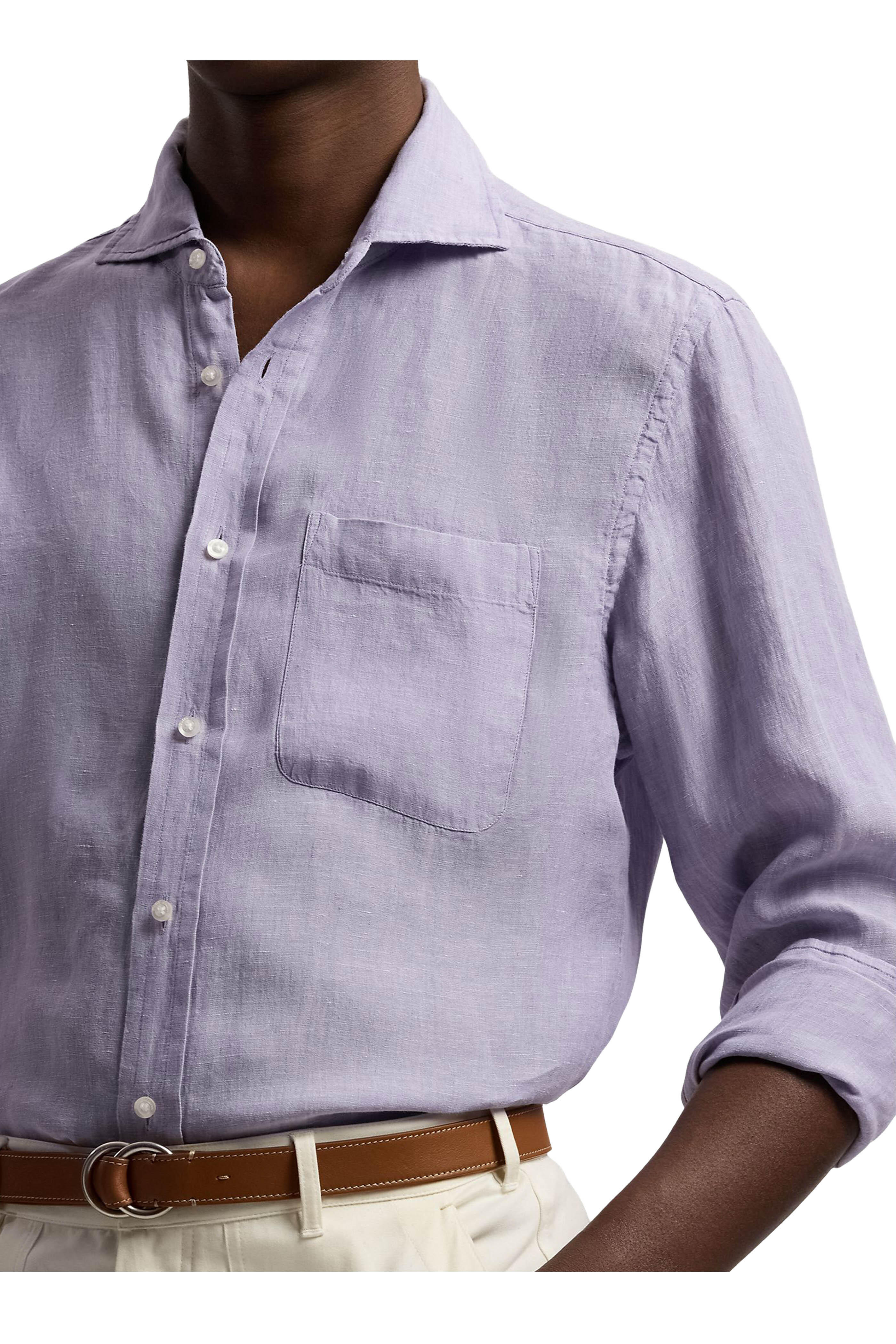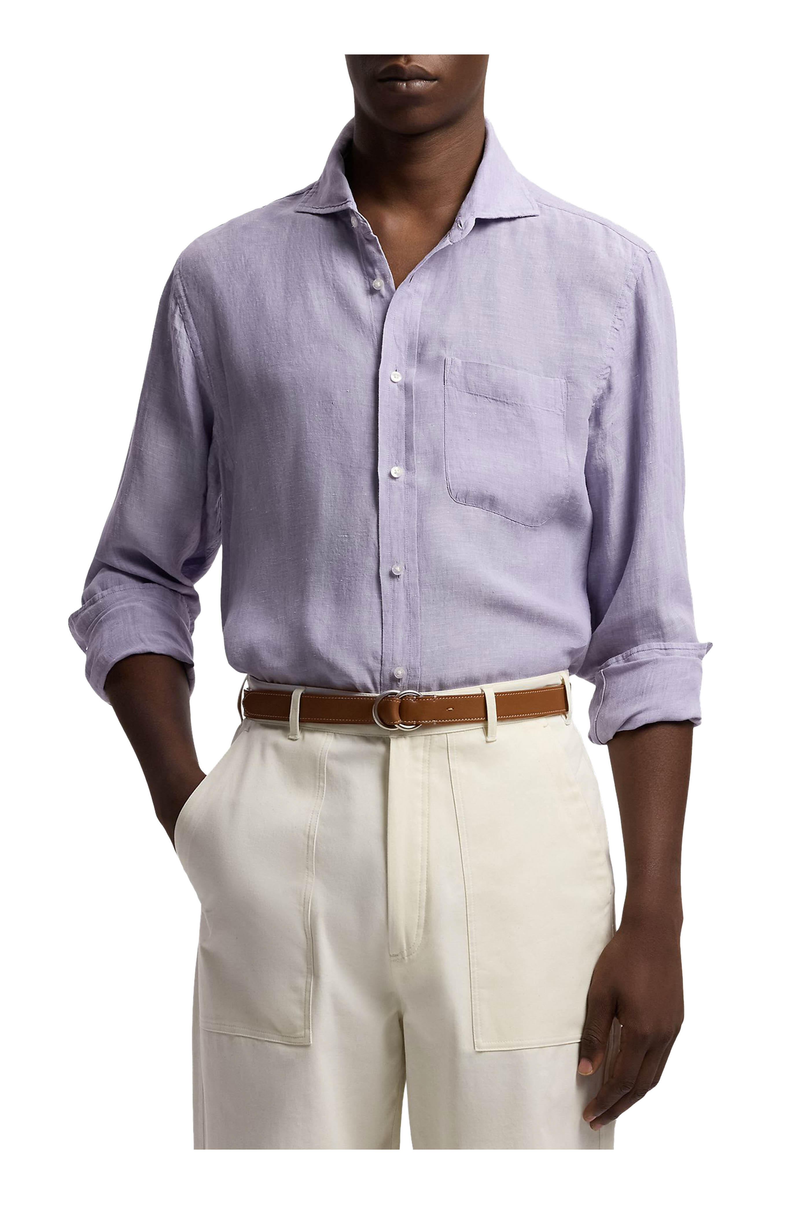 Spread collar. Front button placket. Single button barrel cuffs. Made in Italy. 100% linen. Dry clean.