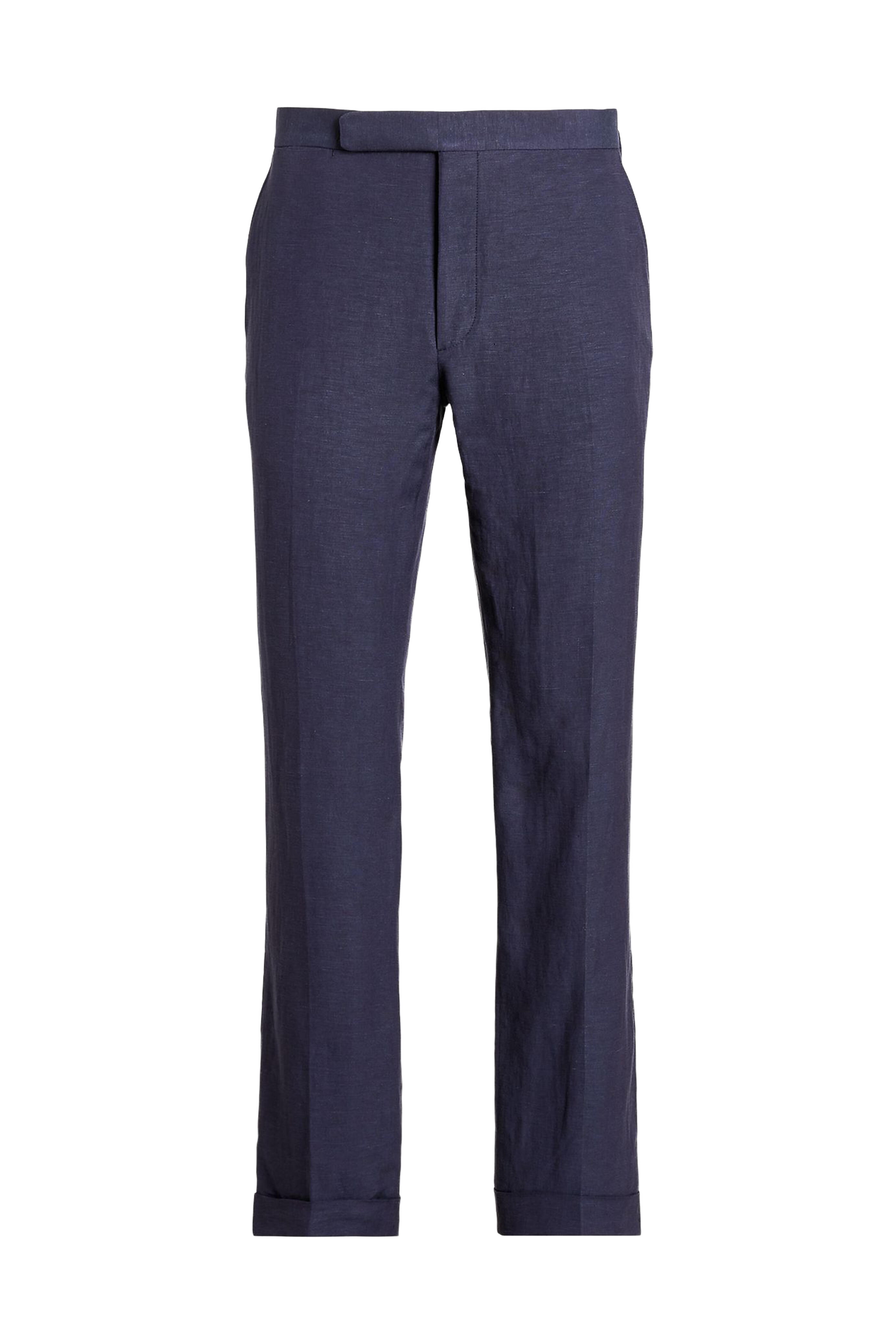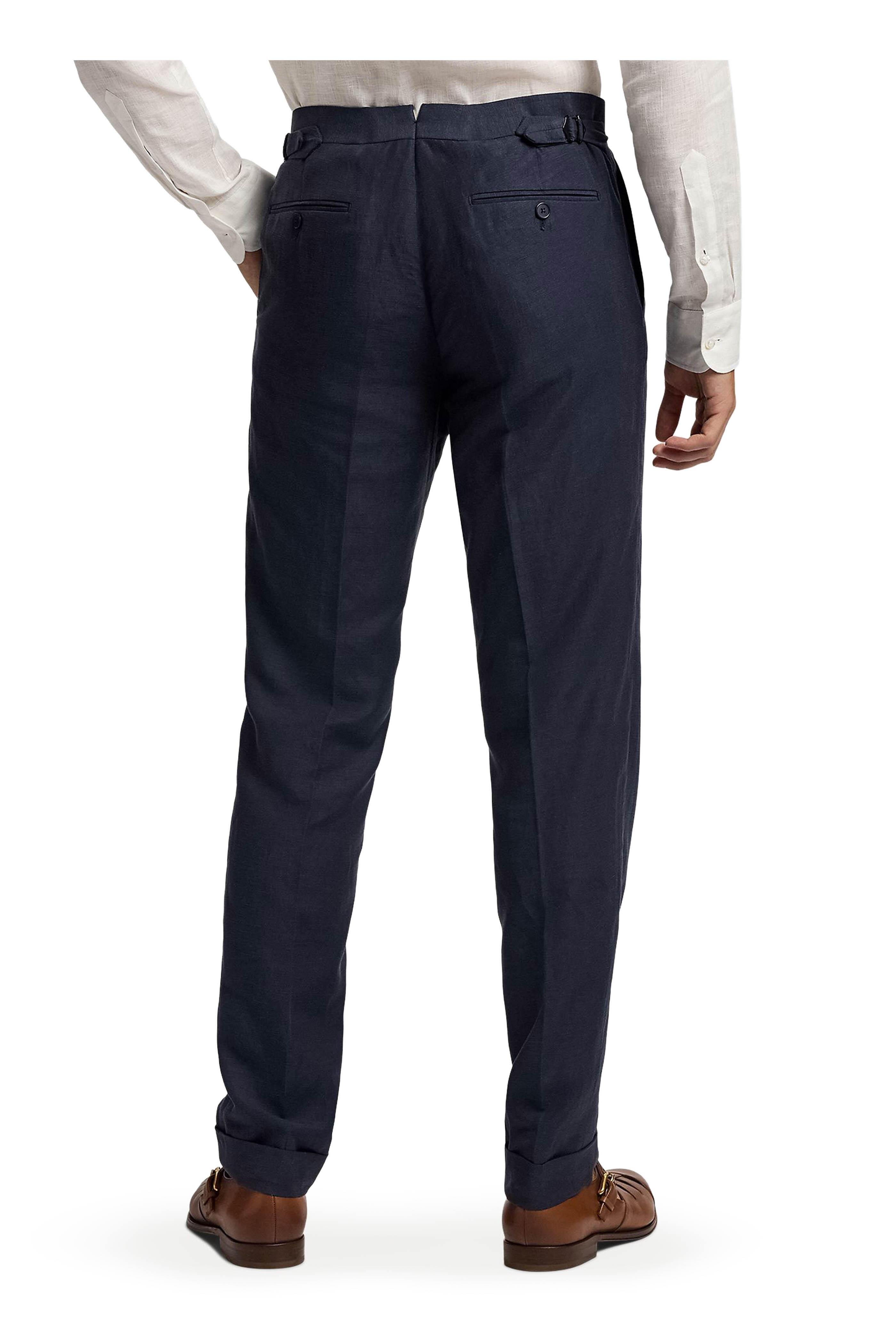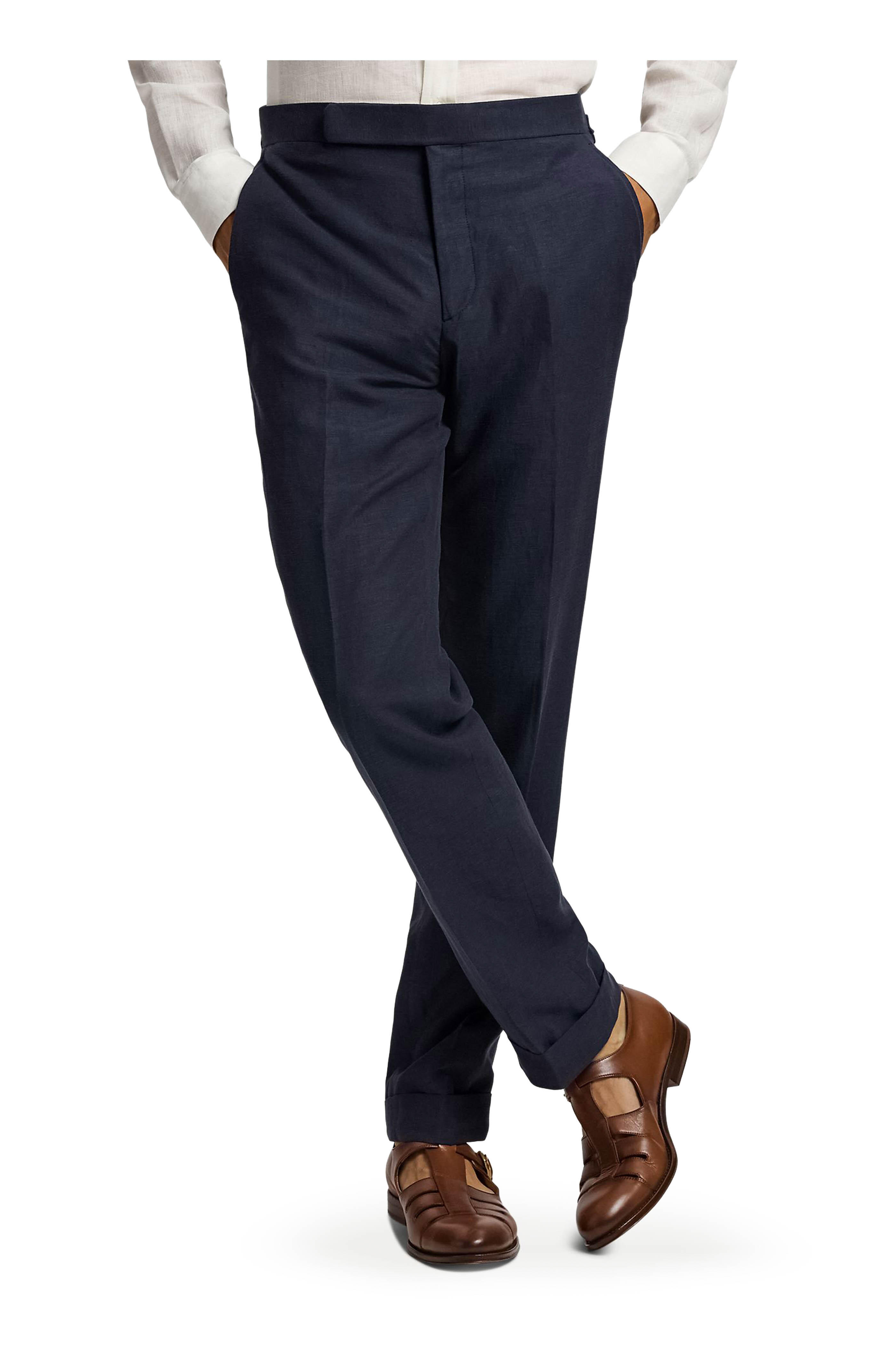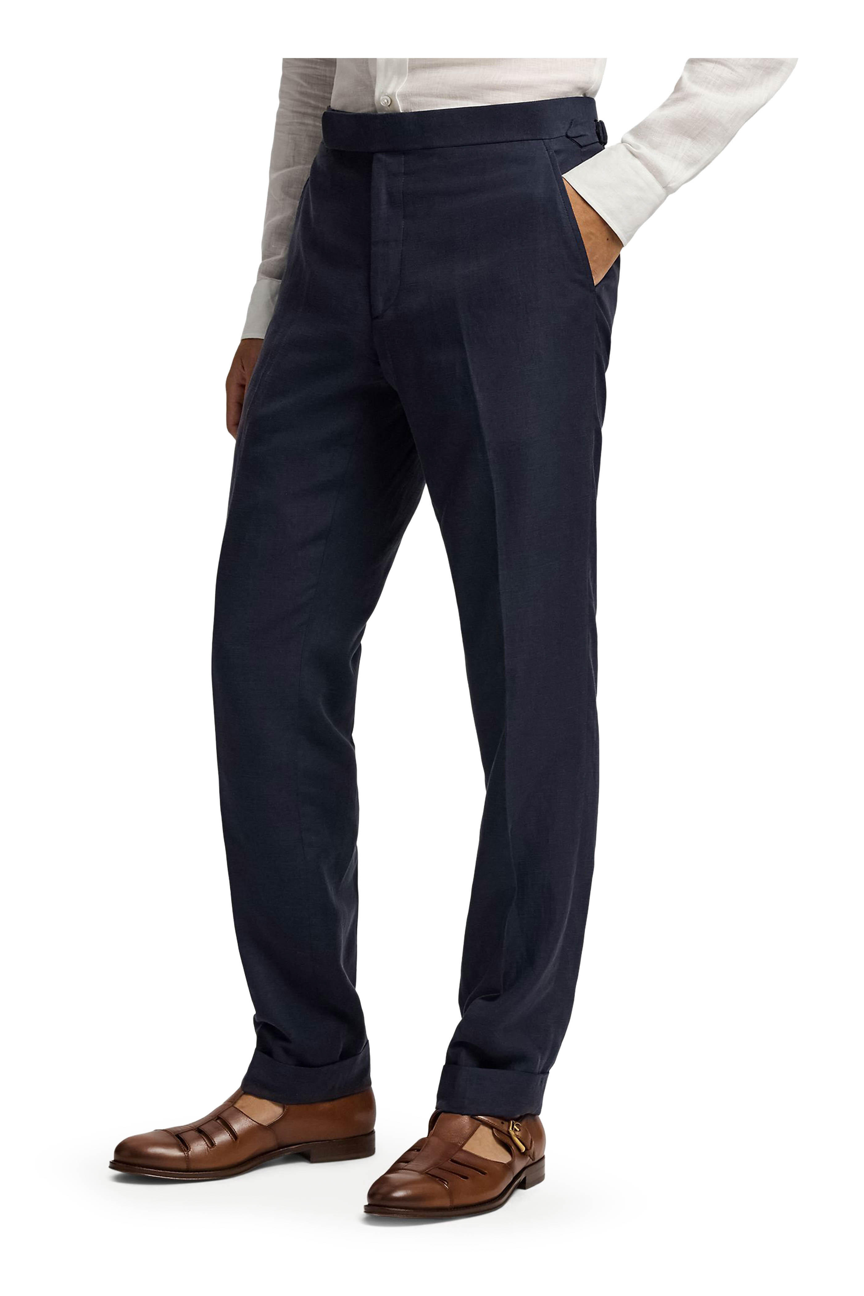Zip fly with button tab closure. Adjustable waist tabs. Front slip pockets; back besom pockets; ticket pocket. Unfinished hem. Made in Italy. 51% silk, 49% linen. Dry clean.