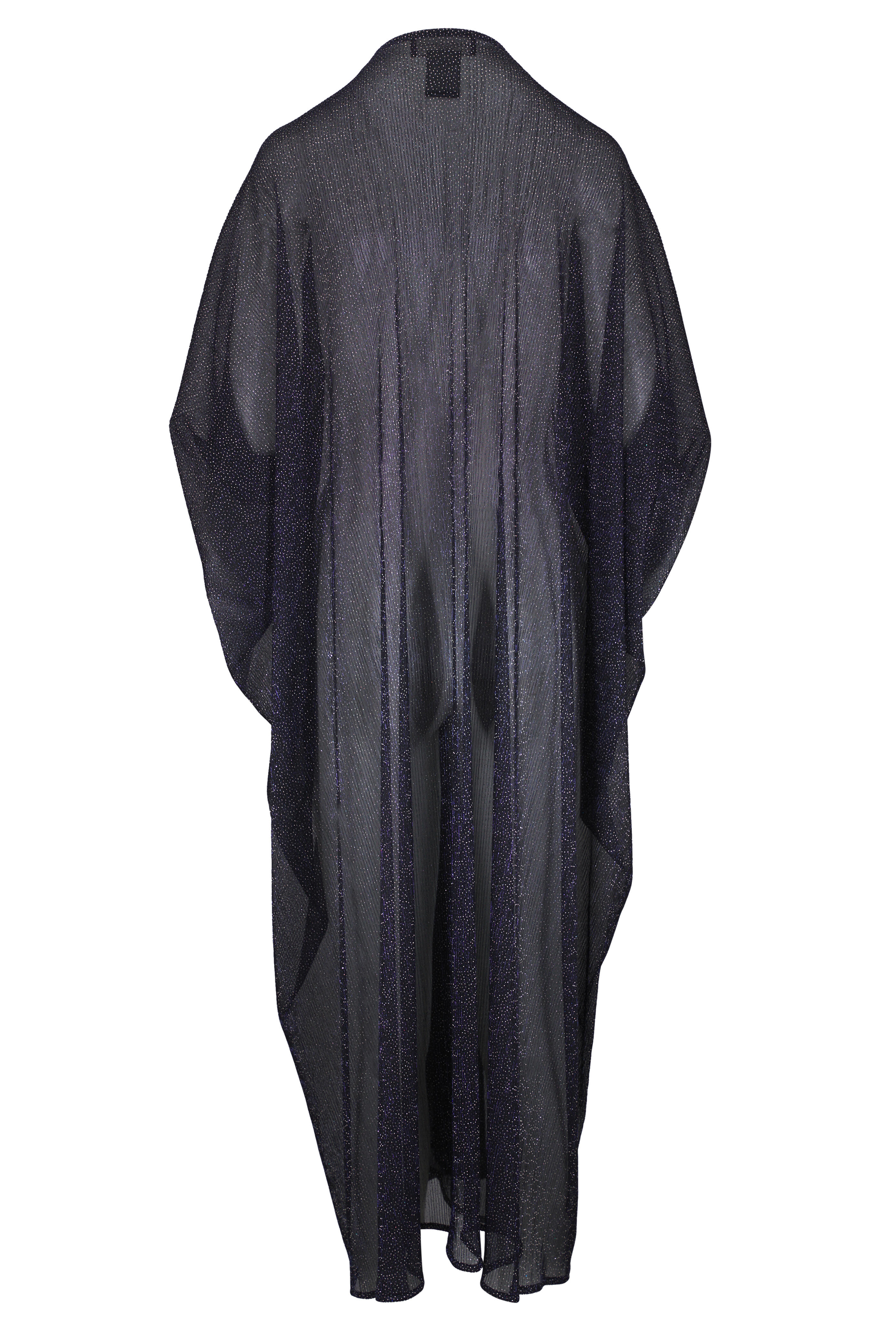 Open front. Made in USA. 50" shoulder to hem. 60% polyester, 40% metallicized fibers. Dry clean.